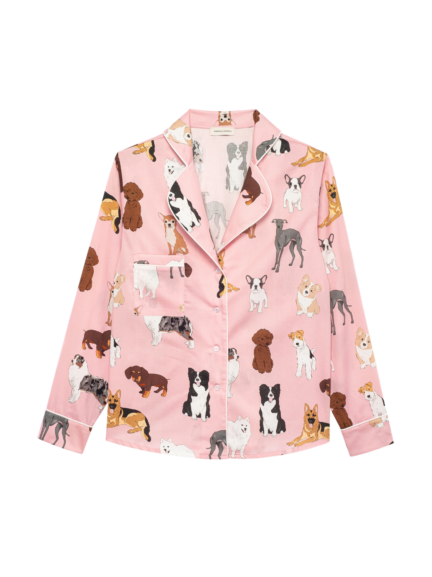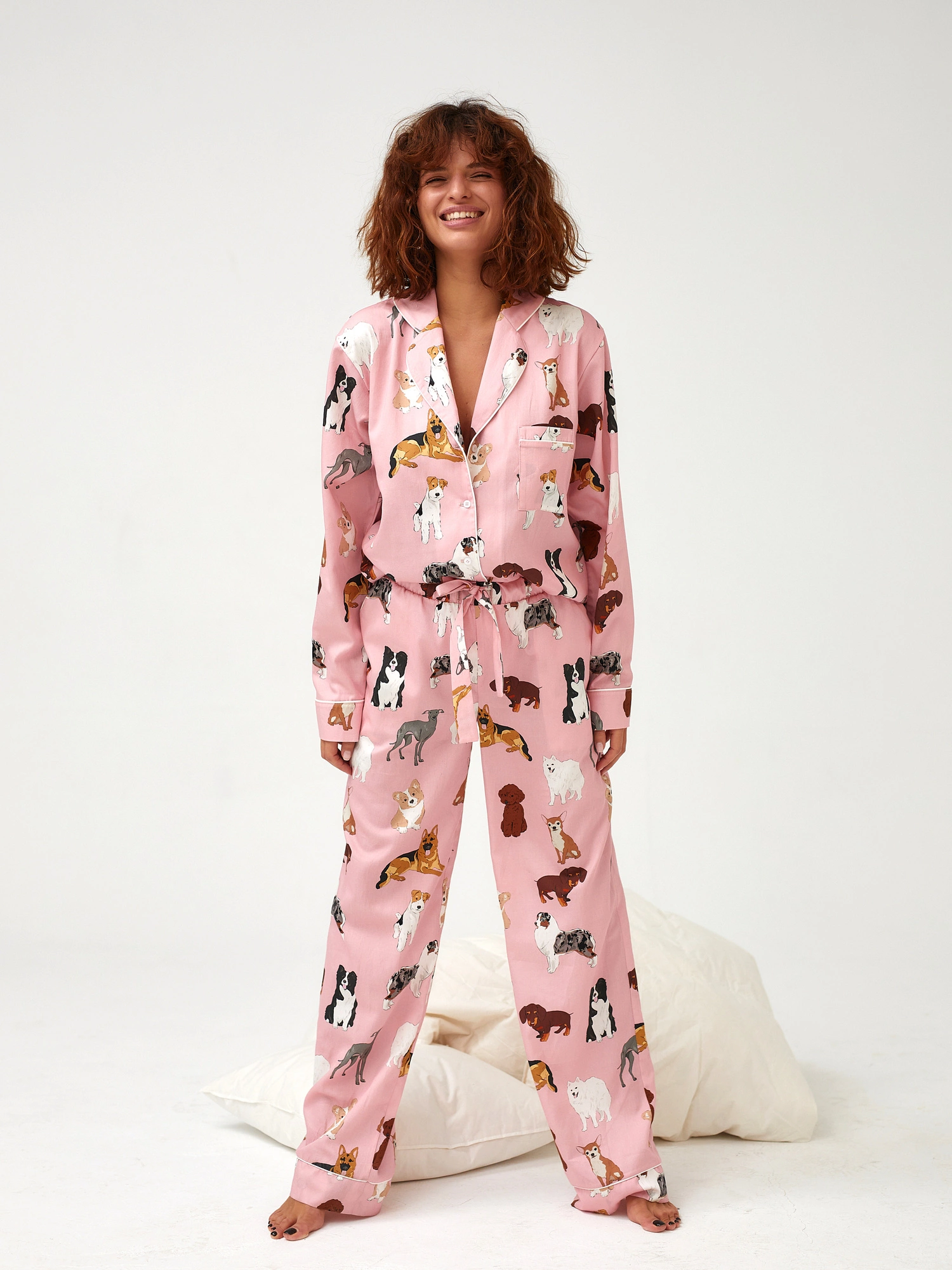 Pajama shirt made of soft and airy cotton. Classic style, buttoned witha a turn-down collar. Long sleeves with cuffs and trimming. The whole is closed in unique colors and print, which will make yoy feel stylish even moments after waking up.