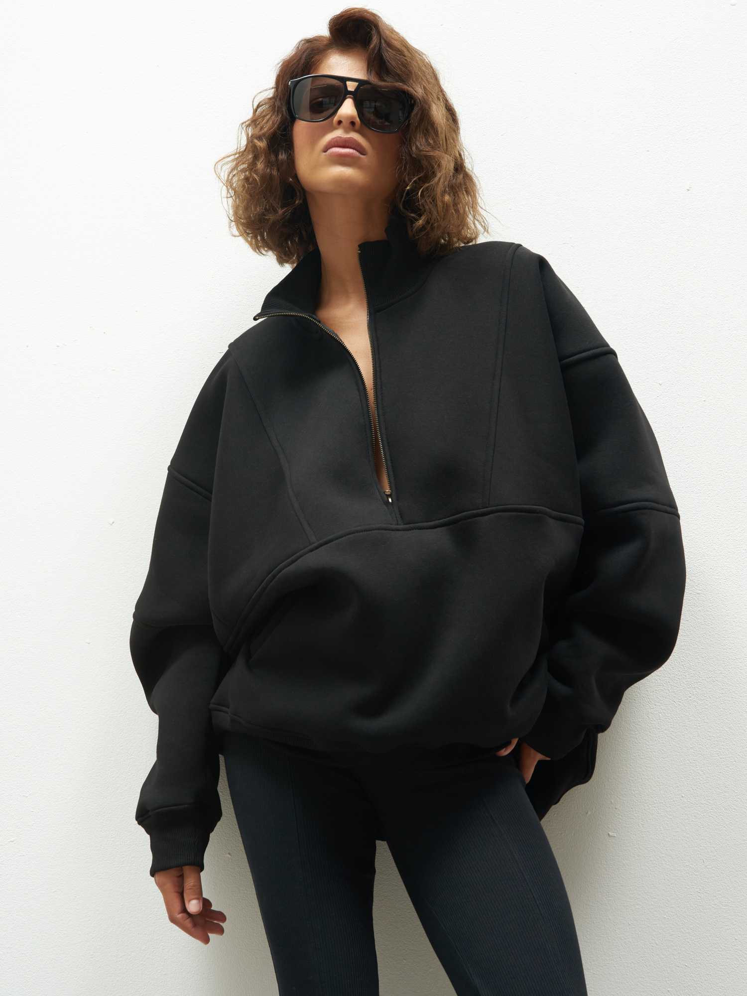 Oversized sweatshirt with a stylish stand-up collar and zipper. Made from soft cotton with warm teddy fleece on the inside. Its extra-long cut makes it perfect to wear with leggings or slim-fit trousers, and on chilly summer evenings, even with shorts. The distinctive design features decorative stitching and an adjustable neckline with a zipper so you can style it just the way you like. Trust us - you won’t want to swap it for any other!