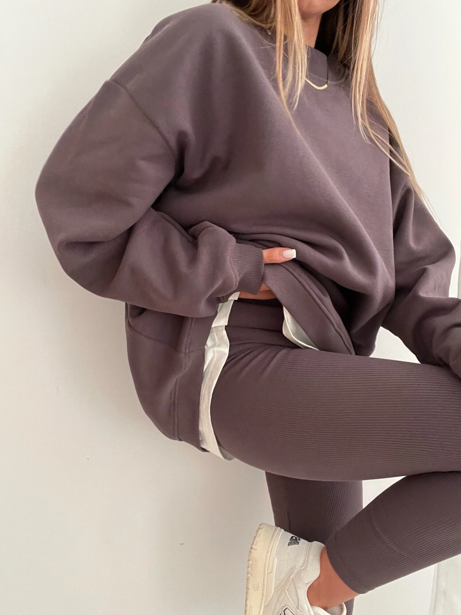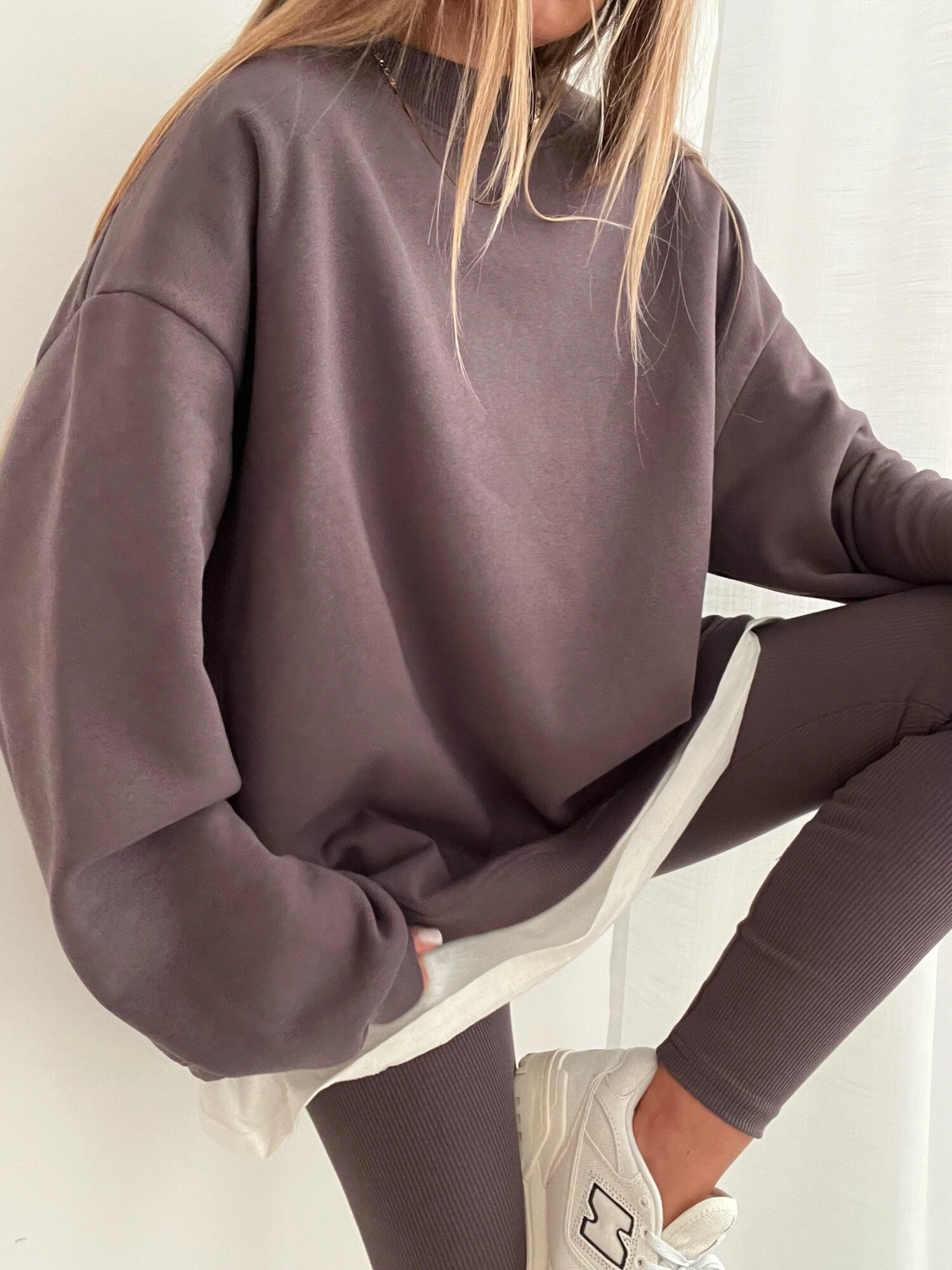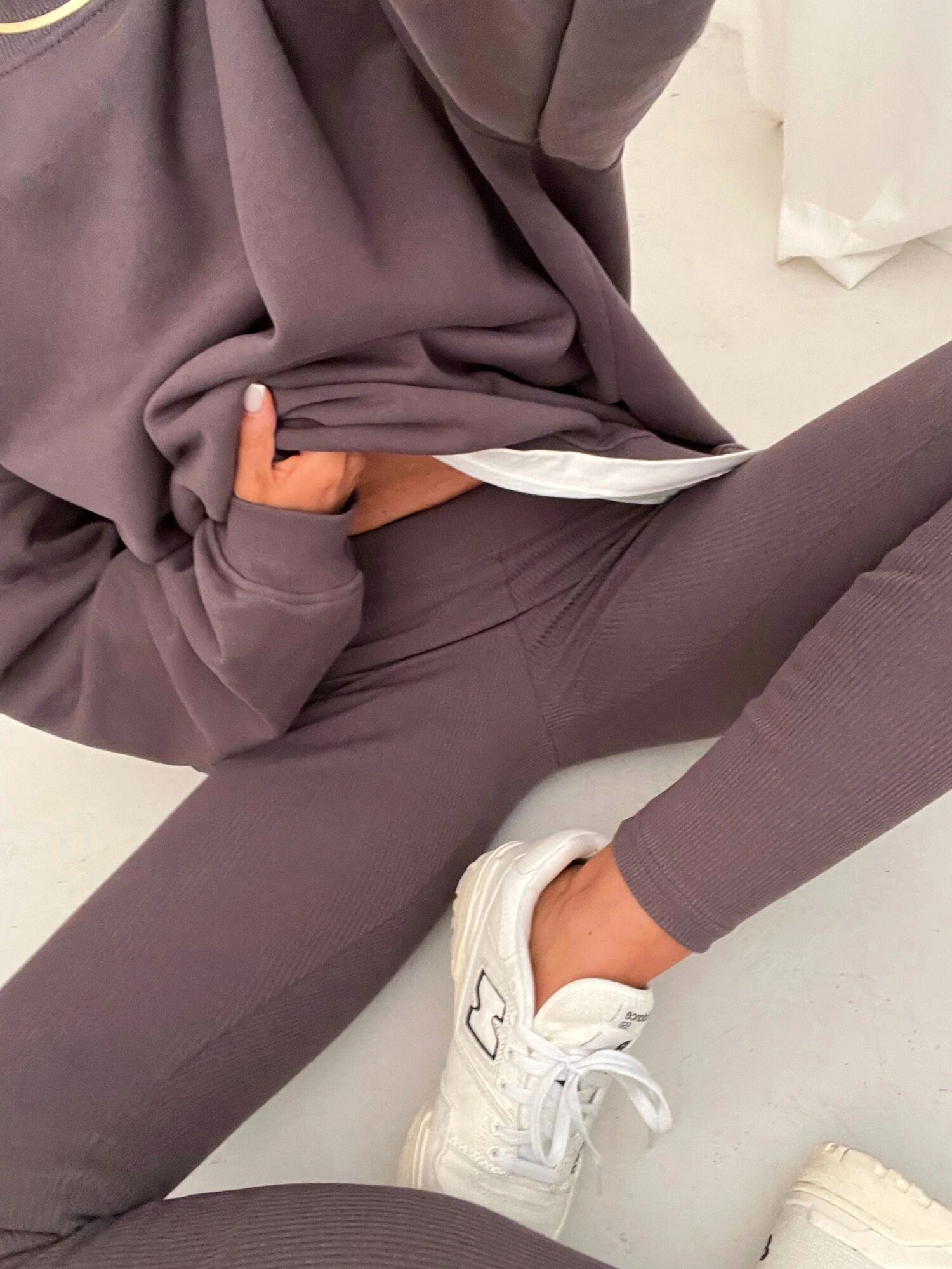 Perfectly fitted high-waisted leggings with an elastic waistband and super long legs. They beautifully emphasize the shapes, and at the same time they will always stay in place and will not slip off the hips. Made of soft and safe for your skin cotton with the ribbed structure that will provide you with extraordinary comfort and adapt to your silhouette. Add a SWEATSHIRT to them and create a set that will not limit you in any way.