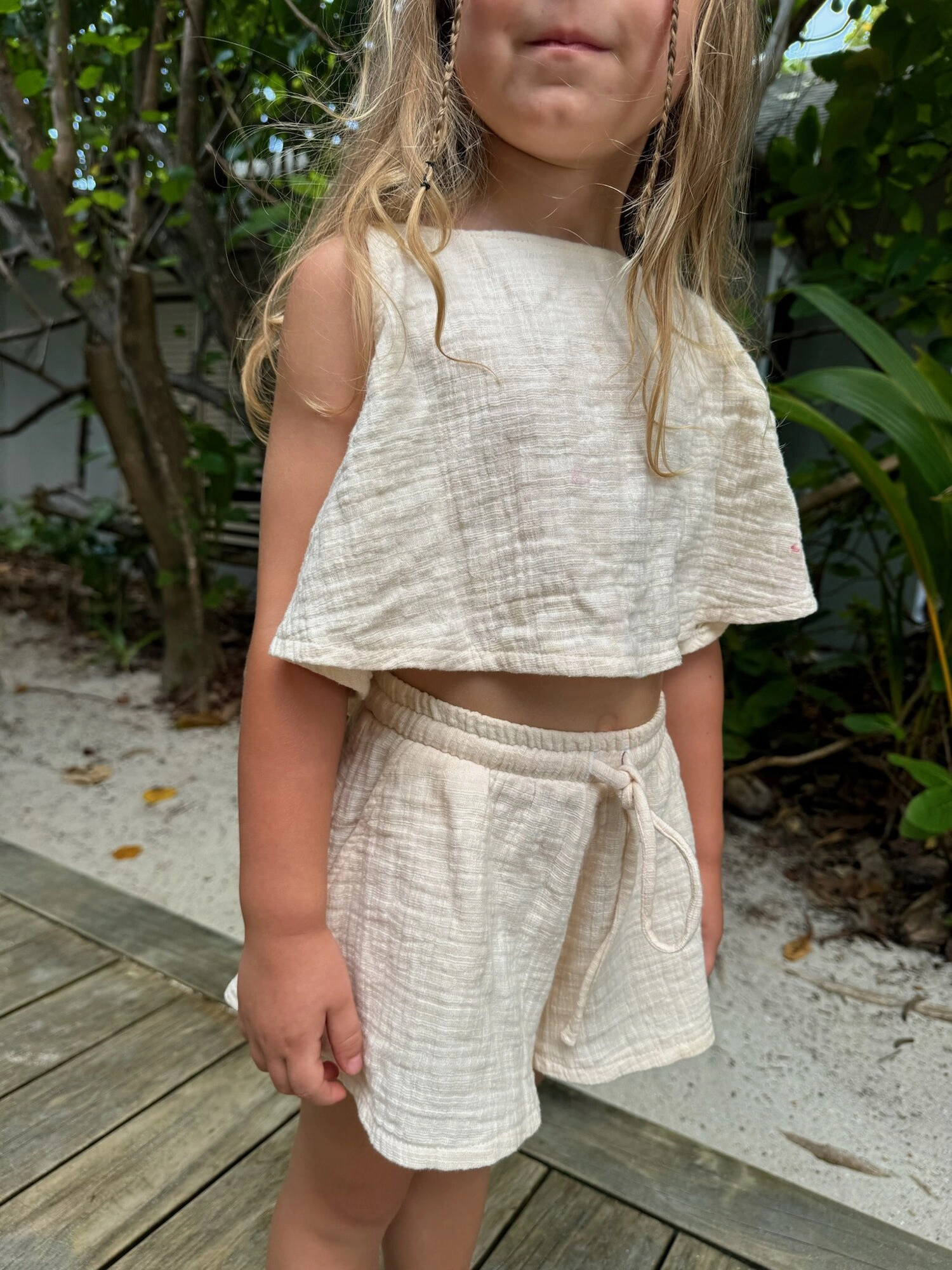 Shorts made of soft and delicate cotton muslin. They mimic the style of a skirt, are loose-fitting, and have a comfortable and elastic waistband with an additional tie. Nothing tightens or pinches, so you can be sure that your little one will feel extremely comfortable in them. Paired with TOP SUNRISE or PLAYA, they create a perfect set for the beach, holidays, and summer - even in the city ;)