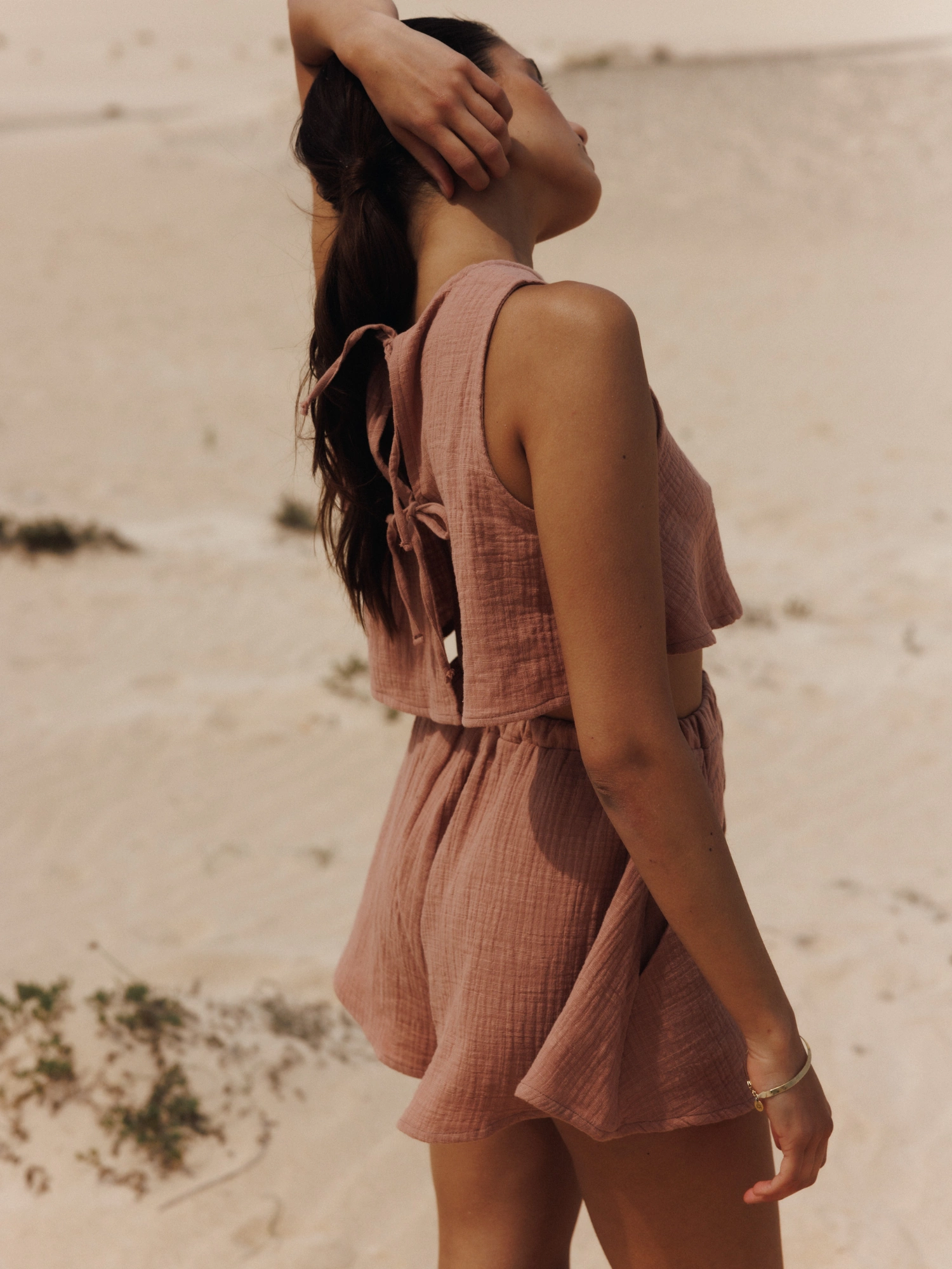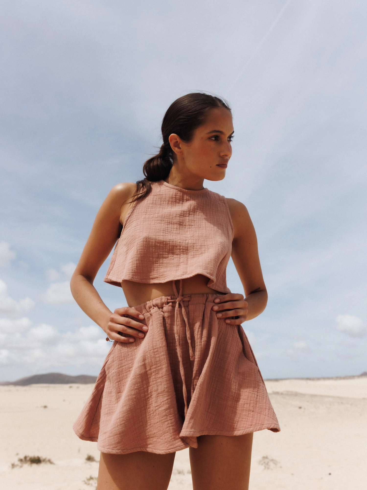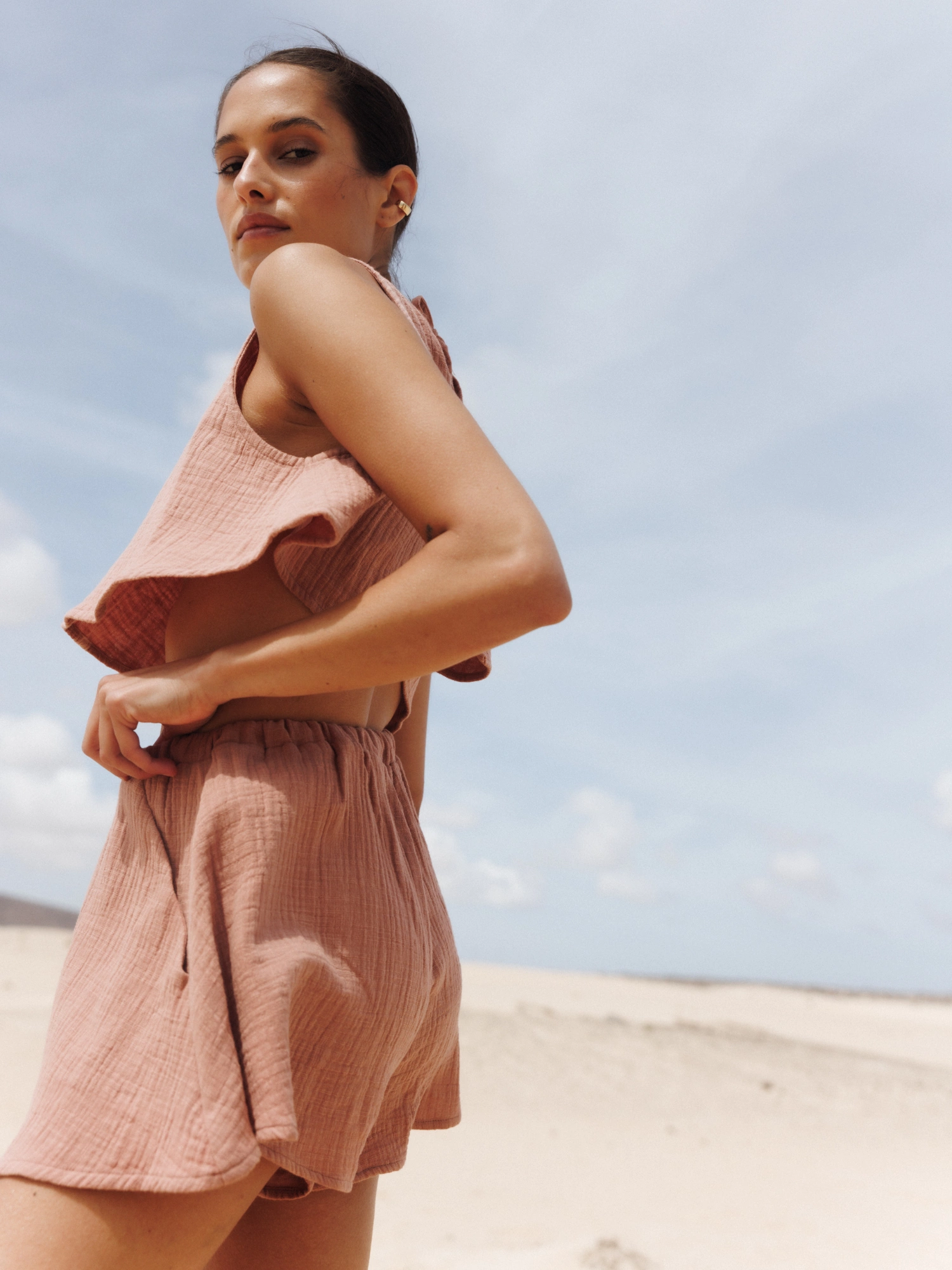 SUNRISE TOP is built up at the front and tied with two delicate strings at the back. It is temtingly short and gently flared. Put on RAYA SHORTS with It and create the perfect set fot the beach, holidays and summer - even in the city ;)