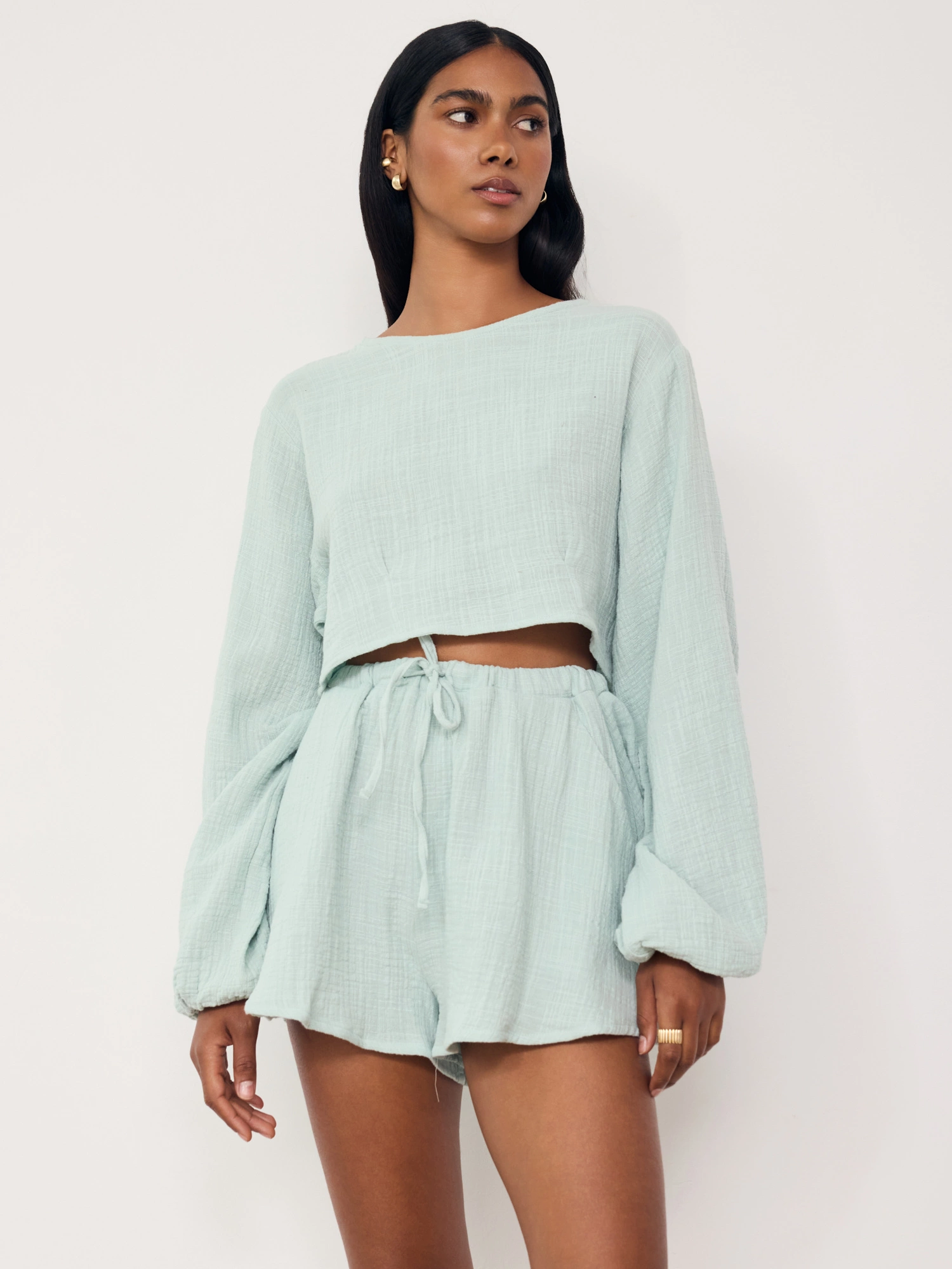 PLAYA BISCUIT TOP is a light, cotton muslin blouse. It has long and wide sleeves finished with an elastic bands. It is short with characteristic stitching that gives it a unique shape. Put on RAYA SHORTS and create the perfect set for the beach, holidays and summer - even in the city ;)
