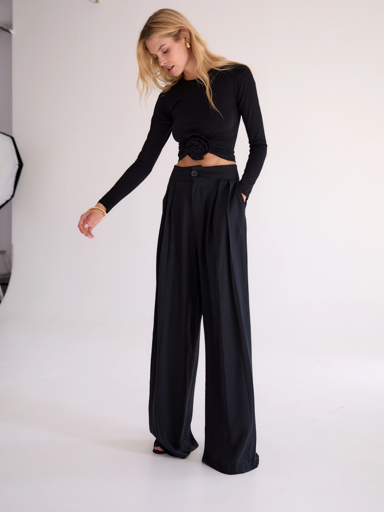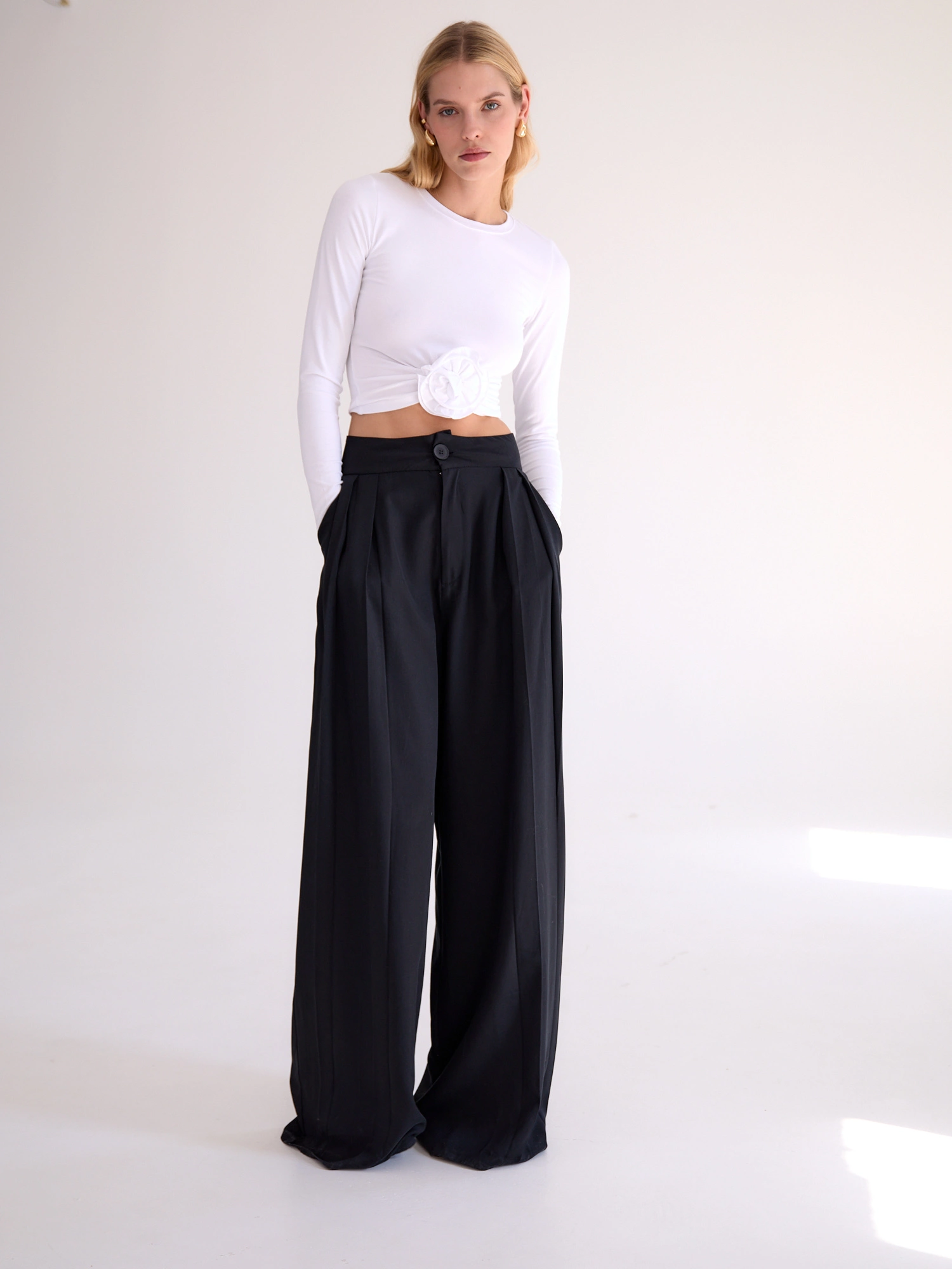 Wide pants with a high waist and decorative pleats. They are fastened with a zipper and button and have two convenient pockets on the sides. They are designed for an elegant ensemble with our MOLLY shirt, but they will also work well in a casual version with a sweater or blouse. Wear them with a sensual bodysuit or a classic T-shirt and get ready for a wow effect in every outfit.