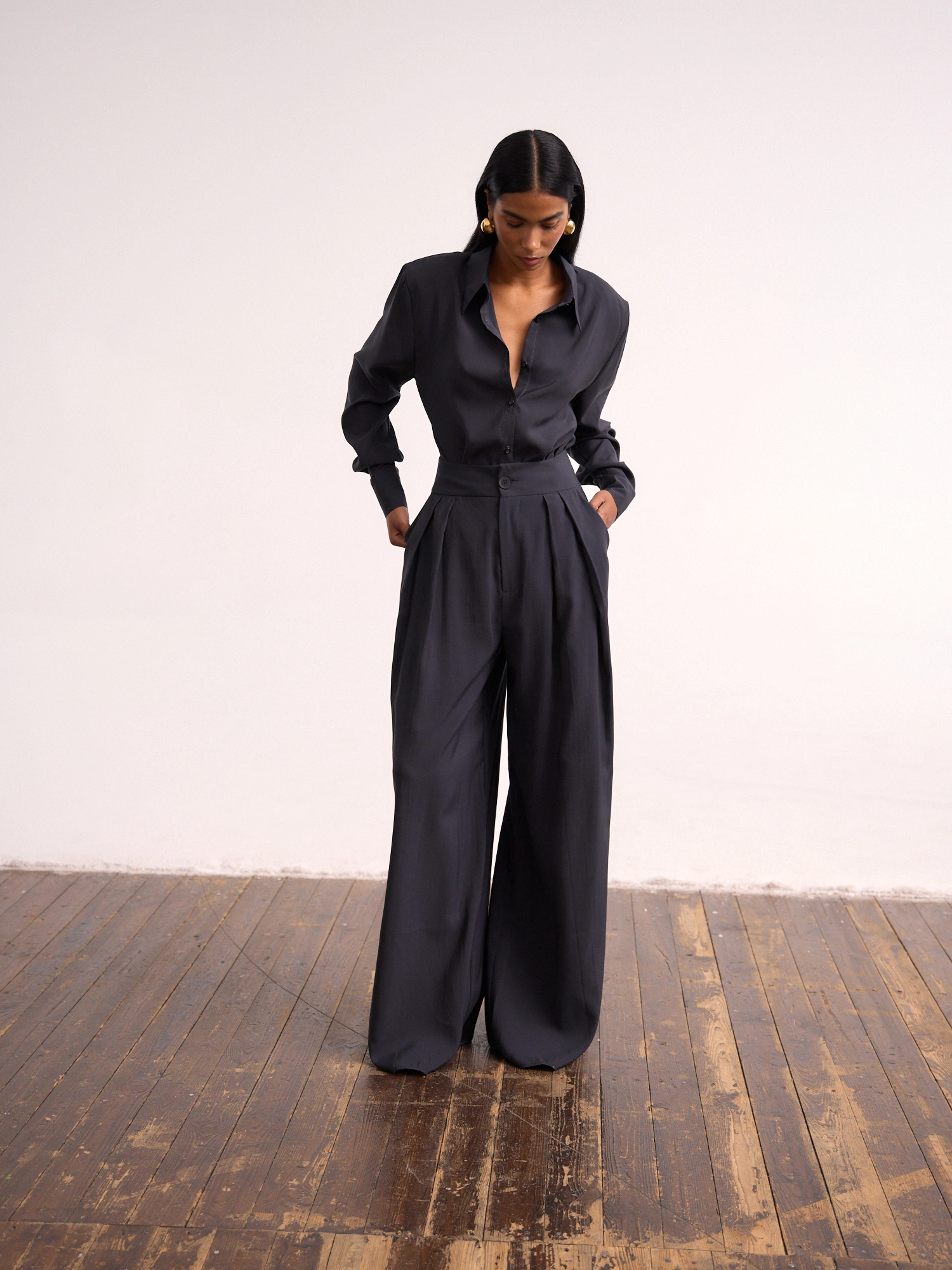 Wide pants with a high waist and decorative pleats. They are fastened with a zipper and button and have two convenient pockets on the sides. They are designed for an elegant ensemble with our MOLLY shirt, but they will also work well in a casual version with a sweater or blouse. Wear them with a sensual bodysuit or a classic T-shirt and get ready for a wow effect in every outfit.