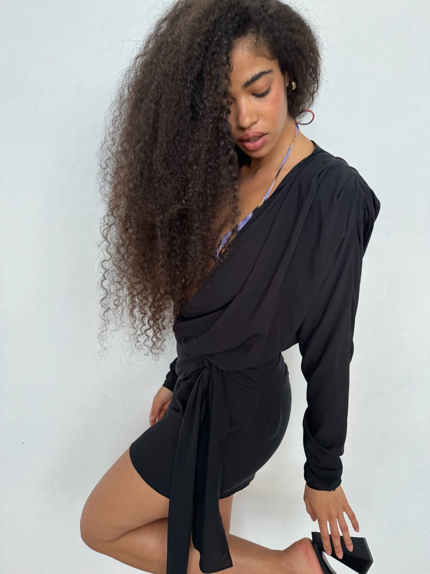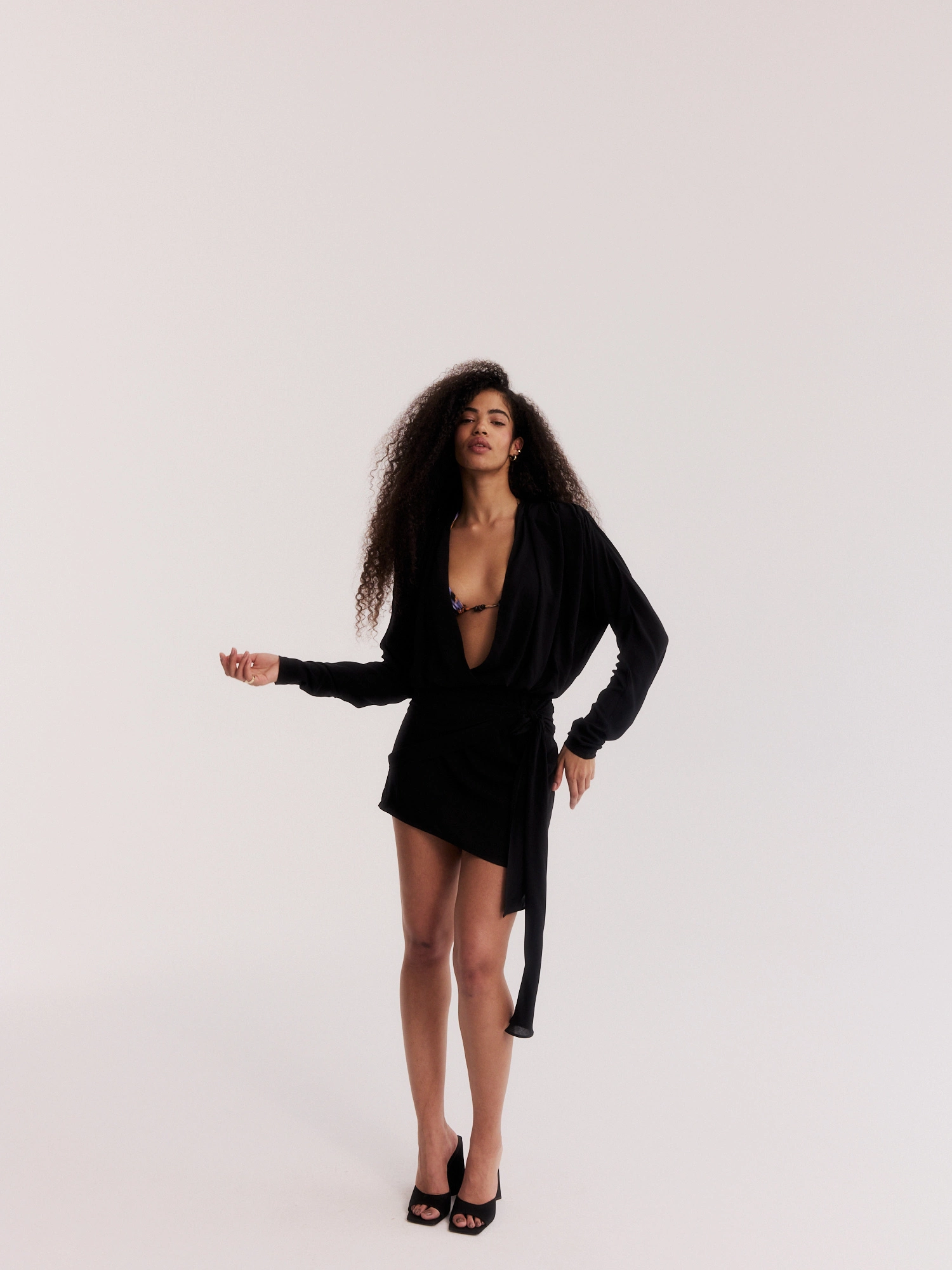 An exceptional mini dress made of soft, delicate, and ultra-thin viscose. This proposition will transform the look of your vacation wardrobe because when thrown over a bikini, it will be perfect for an evening drink or dinner by the beach. It features our characteristic strong shoulders with pads and decorative ruching, long sleeves, and a waist tie. And most importantly - the neckline that showcases the body and transforms the bikini into an integral element and decoration of the outfit.