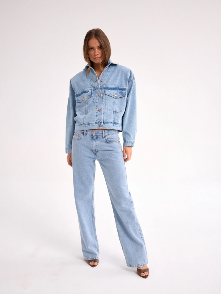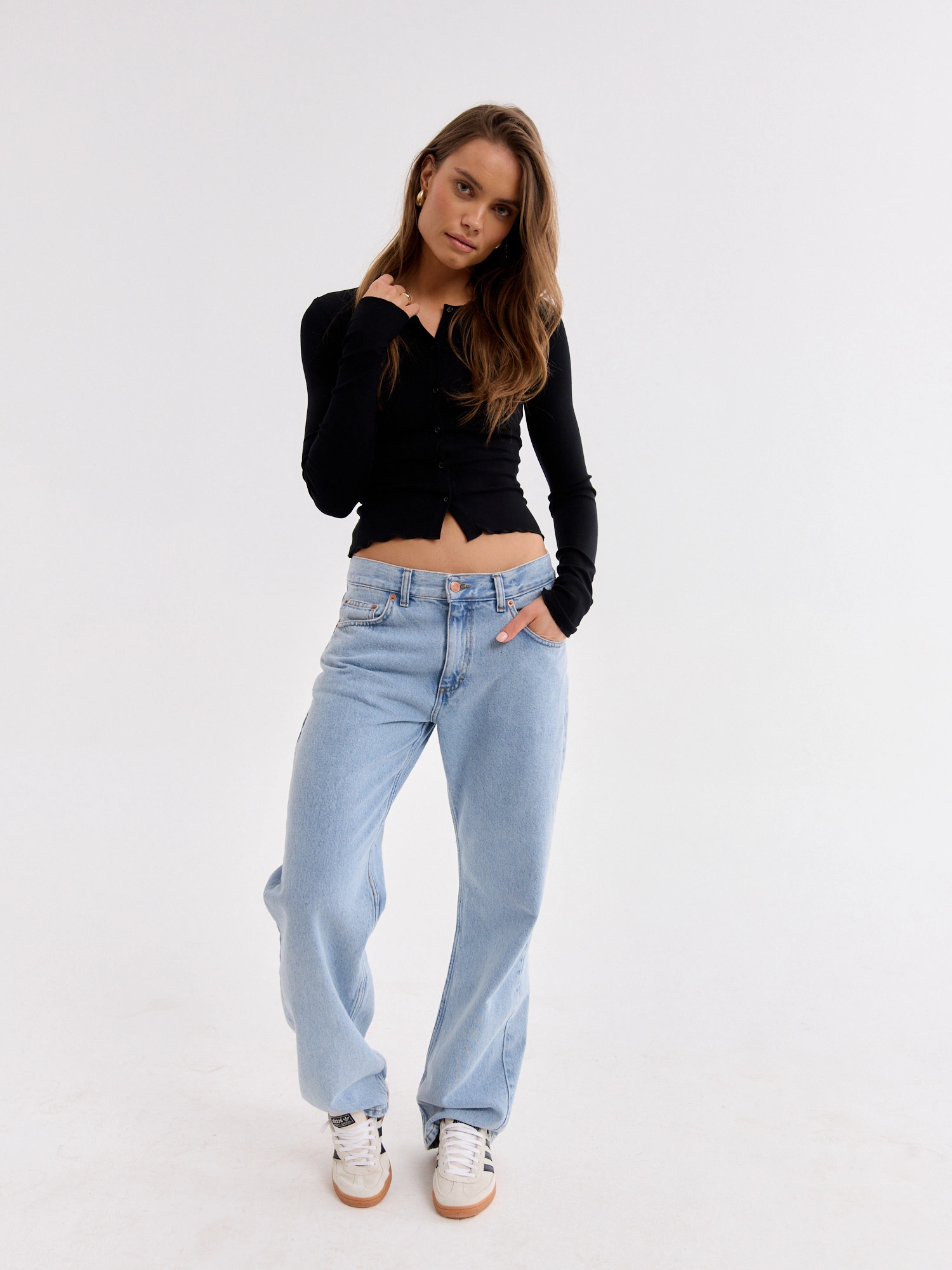 Simple jeans made of soft denim in a light shade. They have a classic cut with a low rise, and thanks to the additional adjustment at the waist you will adjust them to your figure. This is a timeless proposition that should definitely be in every closet. Wear in a sporty version with sneakers or an elegant one with a shirt and high heels. They go with everything!