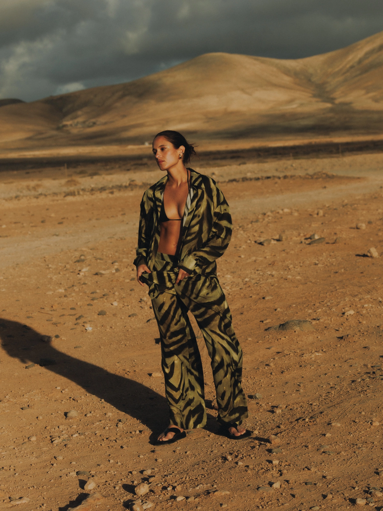 Cotton trousers in a unique animal print in shades of dark green. The legs are long and wide, with a low rise and an elastic waistband at the back. Paired with the SHIRT, they create a mega stylish summer look, but they're also great with a classic tank top, T-shirt or even the PERECT SHIRT.