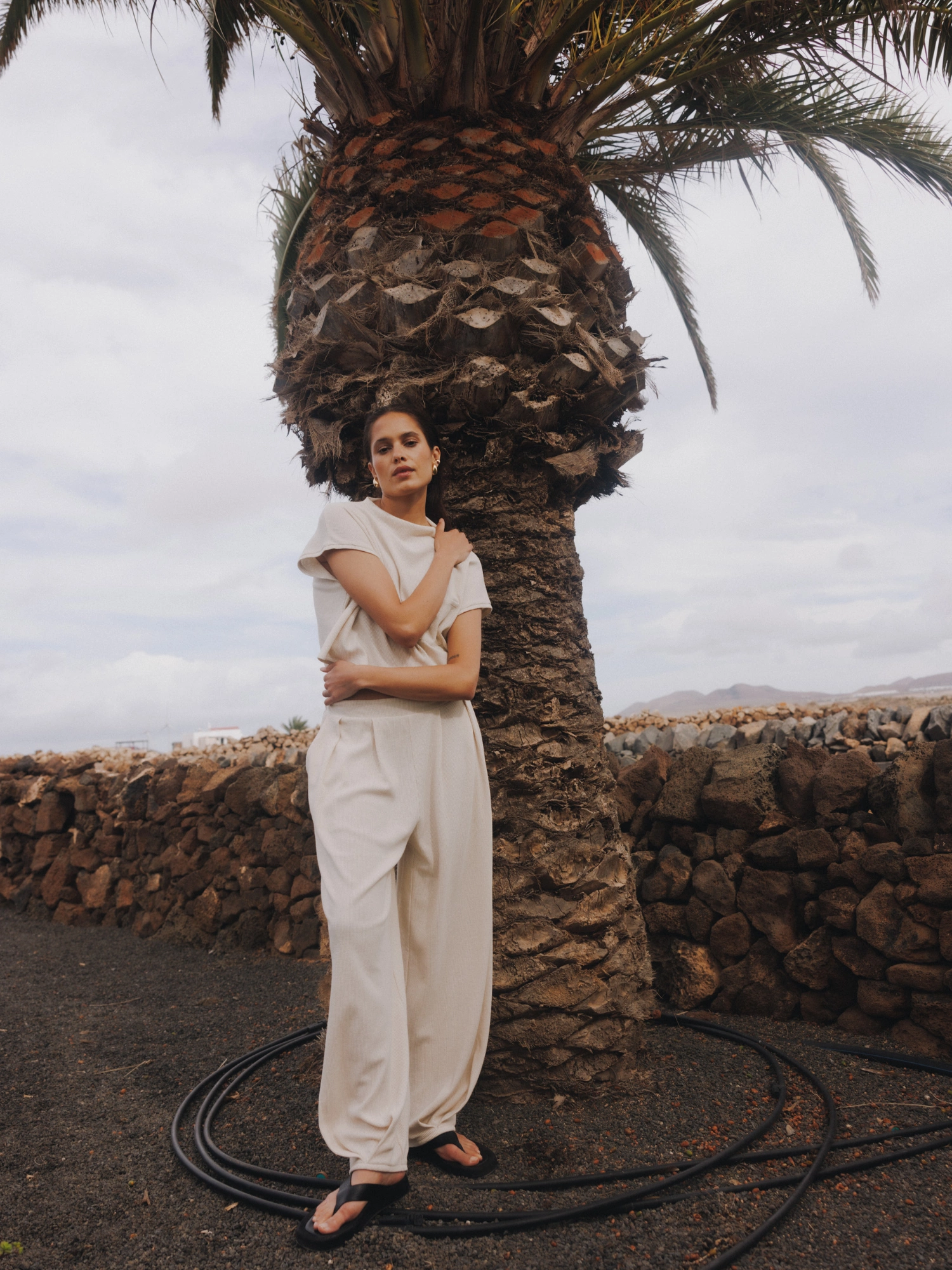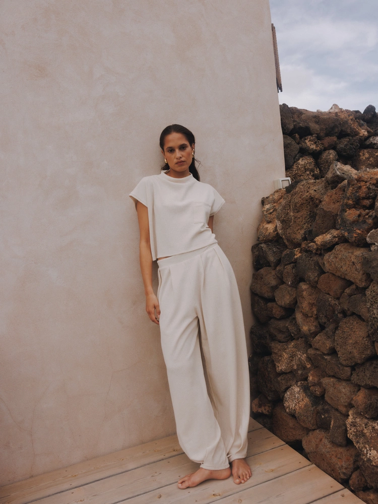 Summer trousers made of soft cotton with a touch of linen in a characteristic waffle texture. They have a loose balloon-style fit with a dropped waist and tapered legs - they are extremely comfortable and breathable. This is a minimalist and elegant alternative to classic joggers, which will be perfect for travel and vacations when paired with a TOP. Wear them with a classic T-shirt, PADDED top, or linen shirt. We are confident that they will be a naturally beautiful addition to your summer wardrobe.