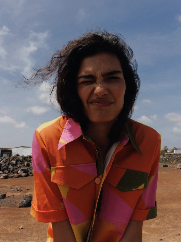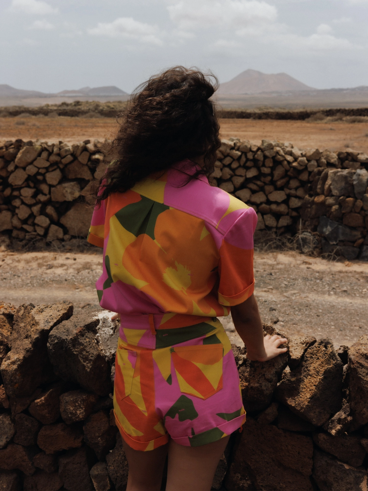 Boxy shirt made of fleshy, stiff and stretchy cotton fabric. Short sleeves with narrow cuffs, collar and two decorative pockets on the bust. Fastening with characteristic snaps and unique print. Layer it over a matching bikini, add dedicated SHORTS and your holiday outfit is ready.