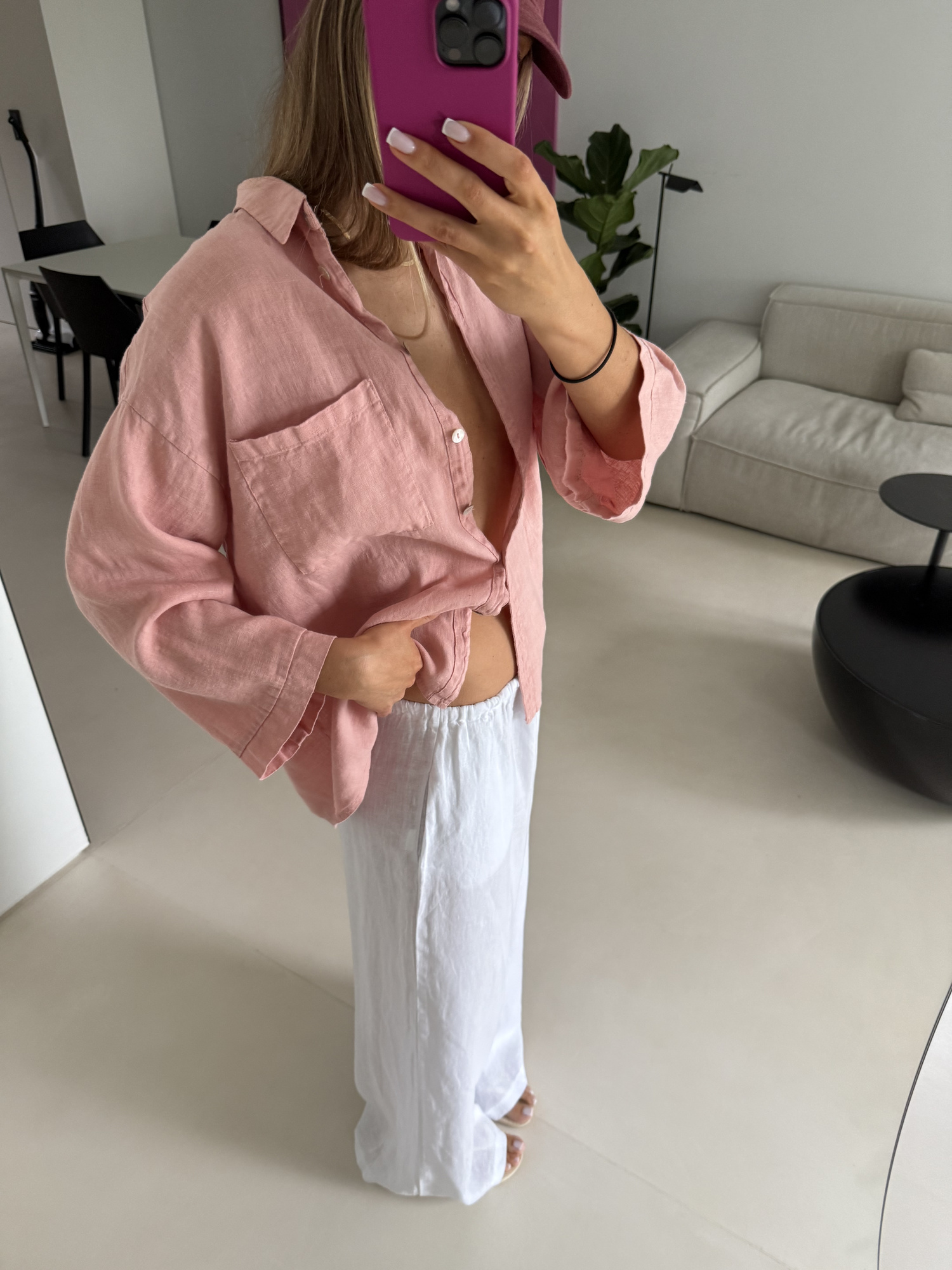 Linen pants with wide and long legs. The material is soft and airy, so it will work even during the greatest heat. They have a lowered waist and a comfortable waist tie, so you can adjust them to your figure. It's a classic with a slightly exaggerated shape and with a characteristic boyish looseness. Pull on over a bikini and throw on a SHIRT - a must-have in any summer closet.