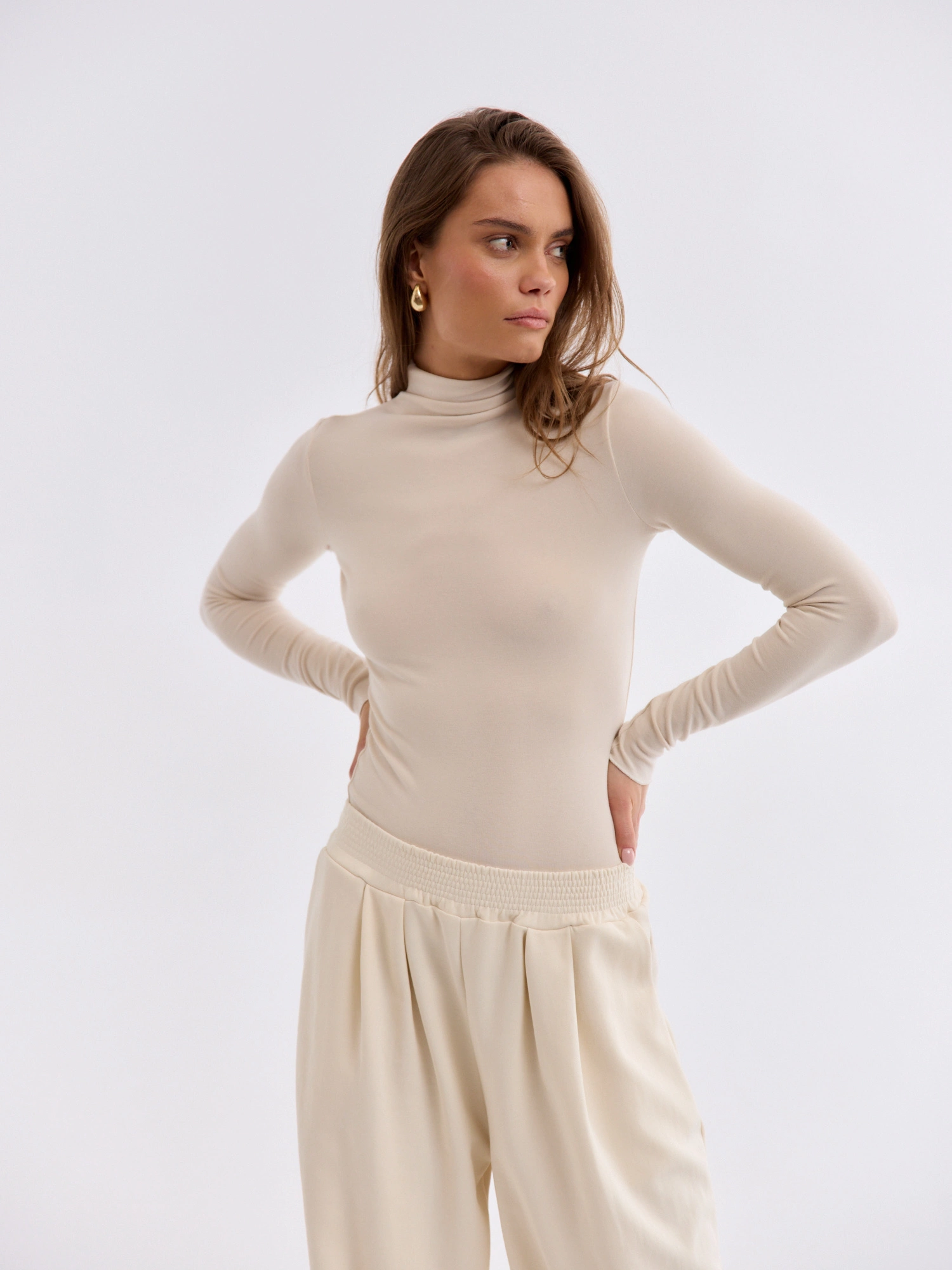 A fitted turtleneck made from soft and lightweight fabric with a cotton blend. It features a simple cut with raw-edge detailing and a fold-over collar. Perfect as a base layer under a blazer, cardigan, or sweater. Pair it with high-waisted trousers, jeans, or a skirt to enjoy a timeless and minimalist look for both work and everyday wear.