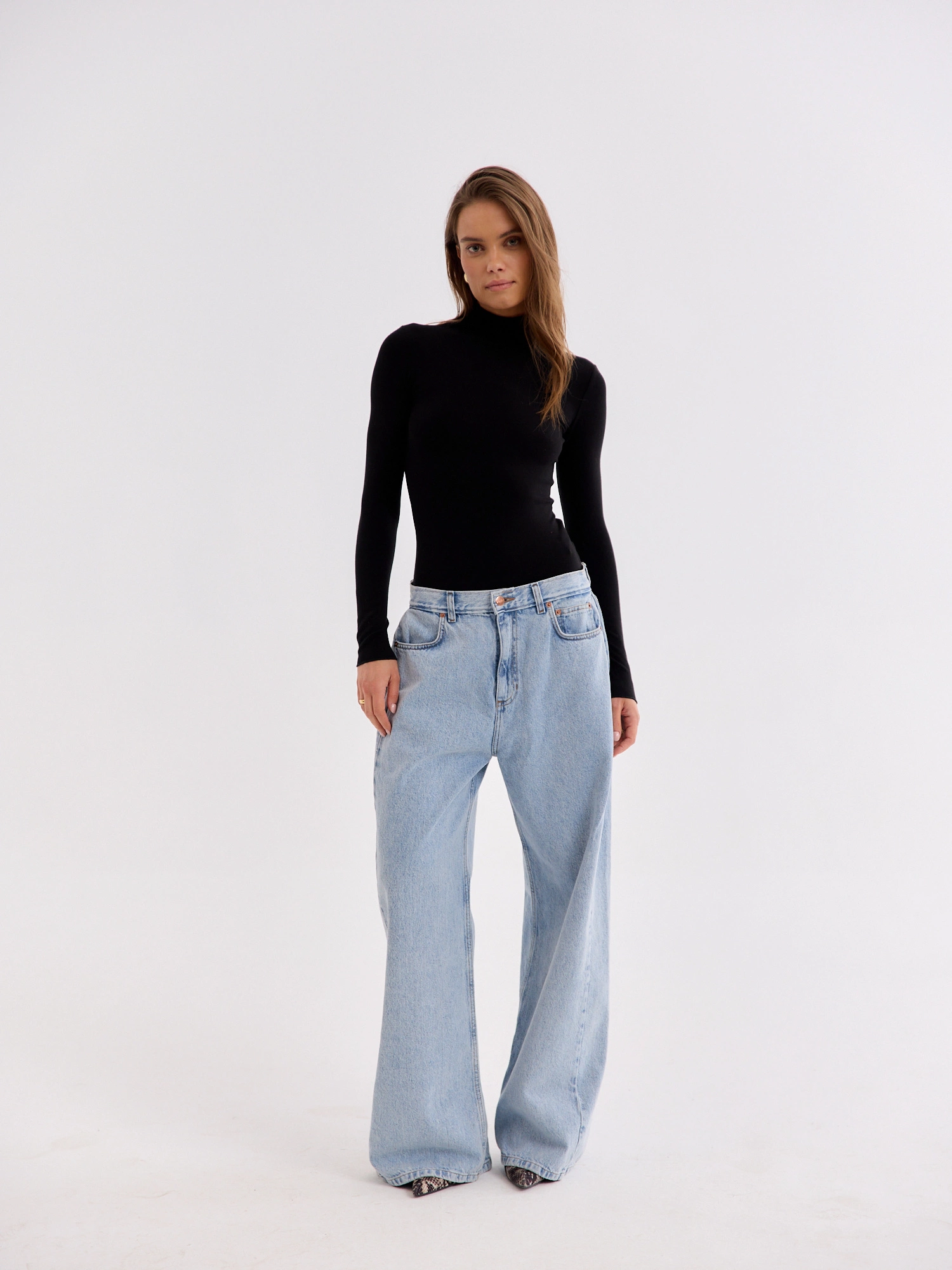 A fitted turtleneck made from soft and lightweight fabric with a cotton blend. It features a simple cut with raw-edge detailing and a fold-over collar. Perfect as a base layer under a blazer, cardigan, or sweater. Pair it with high-waisted trousers, jeans, or a skirt to enjoy a timeless and minimalist look for both work and everyday wear.