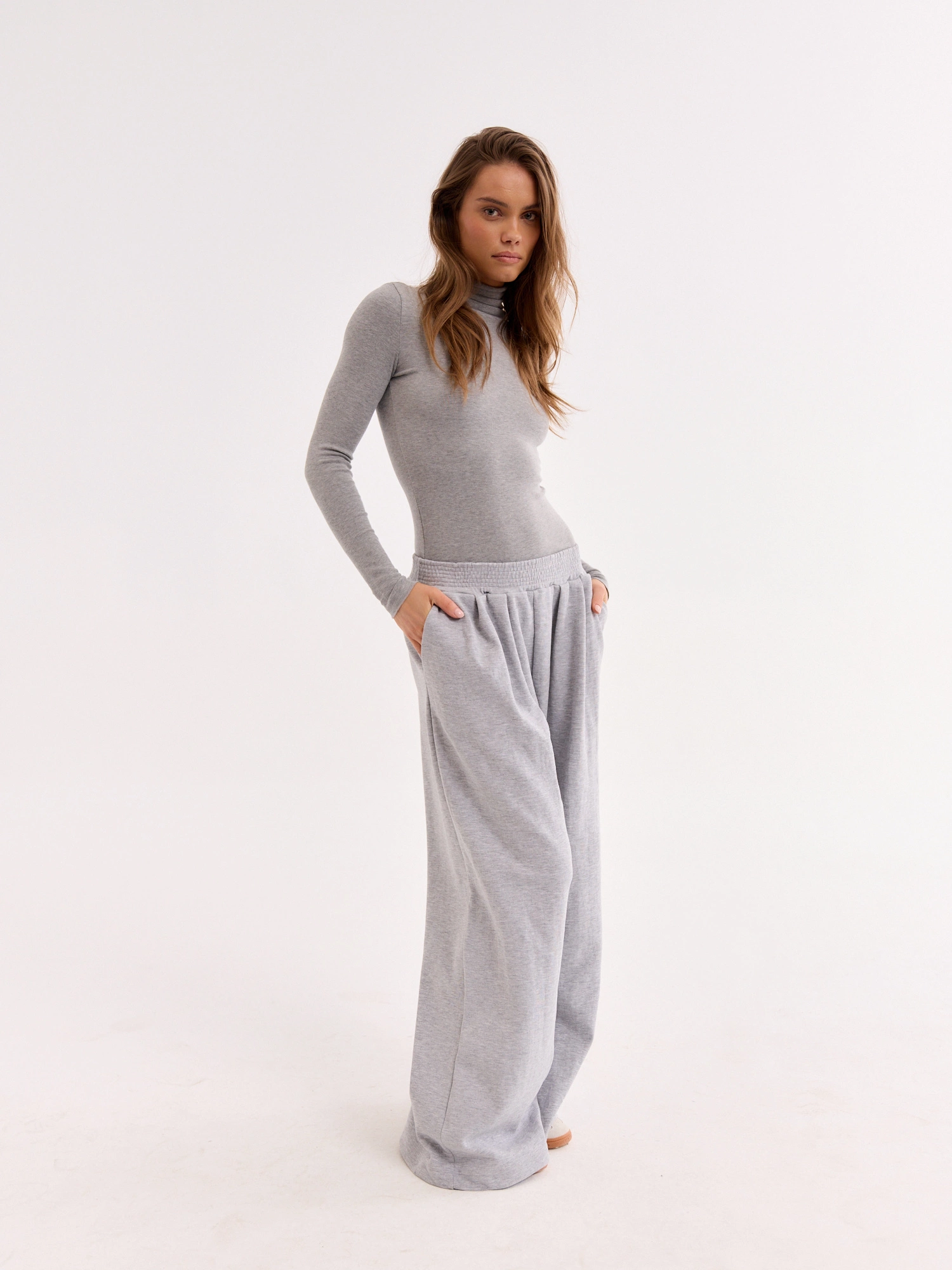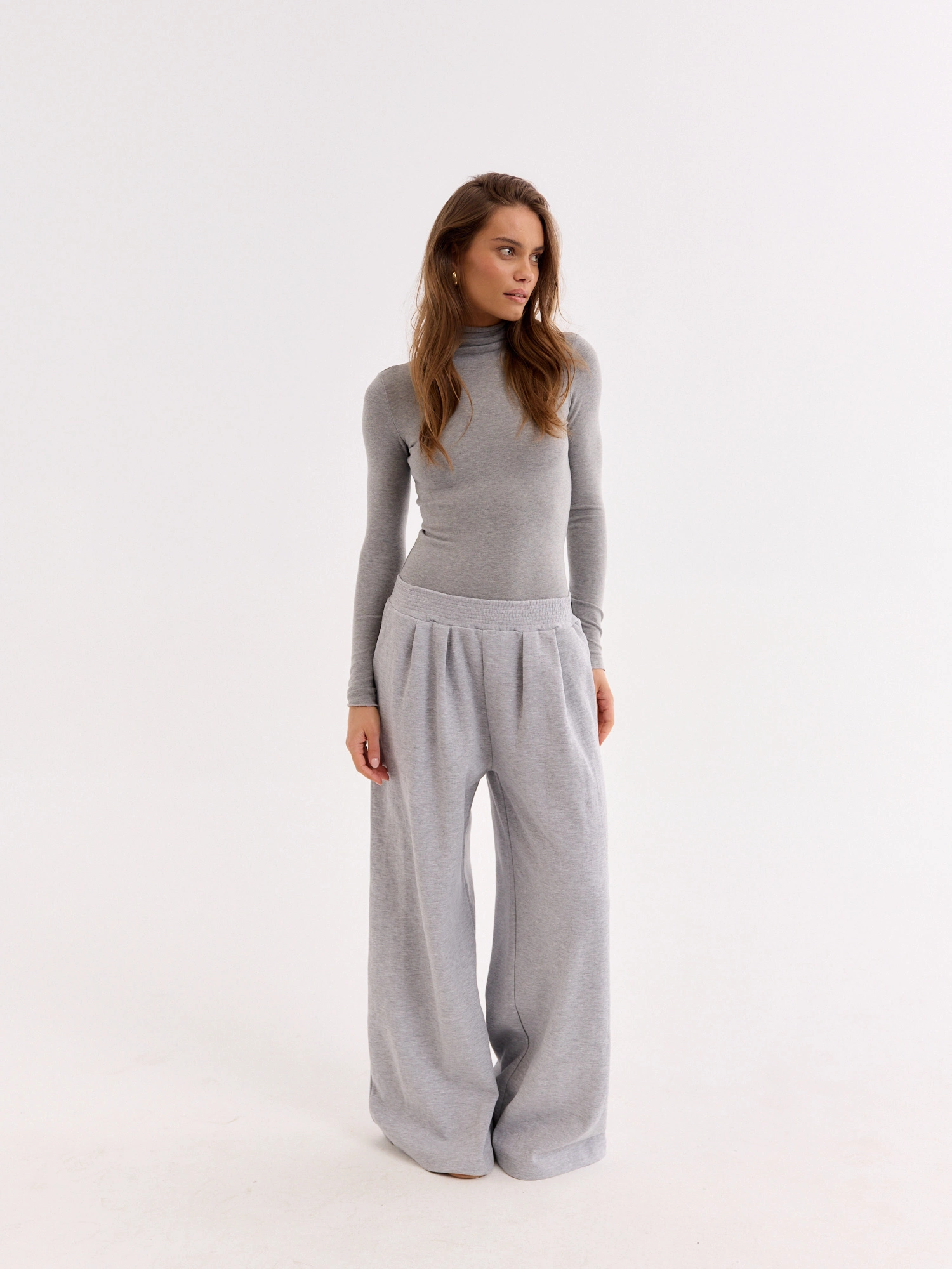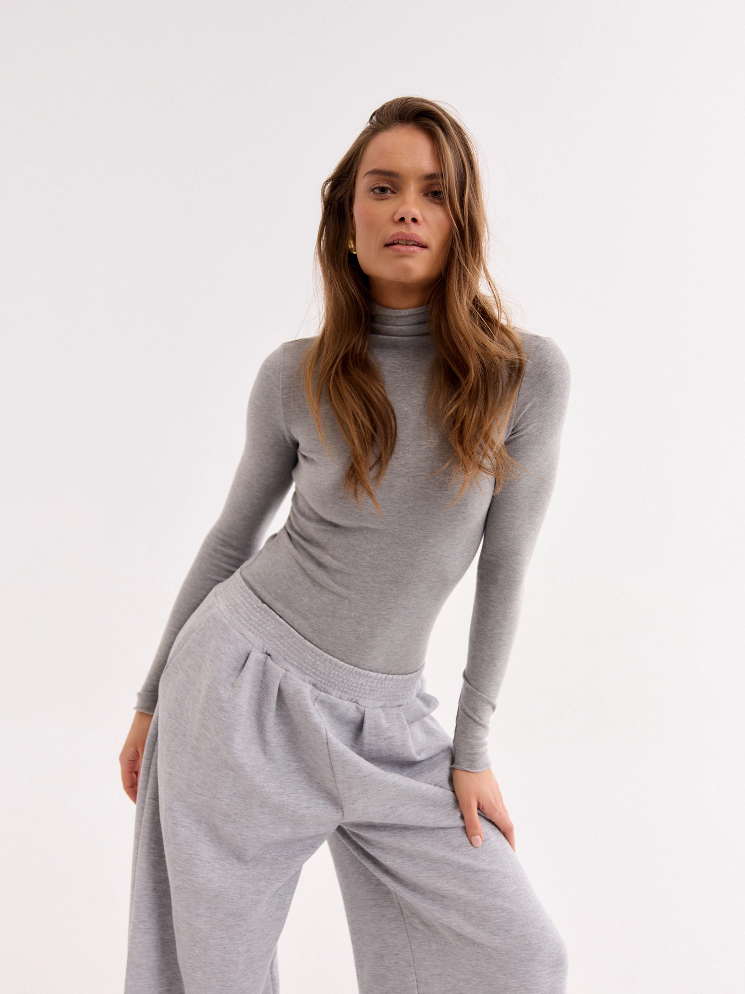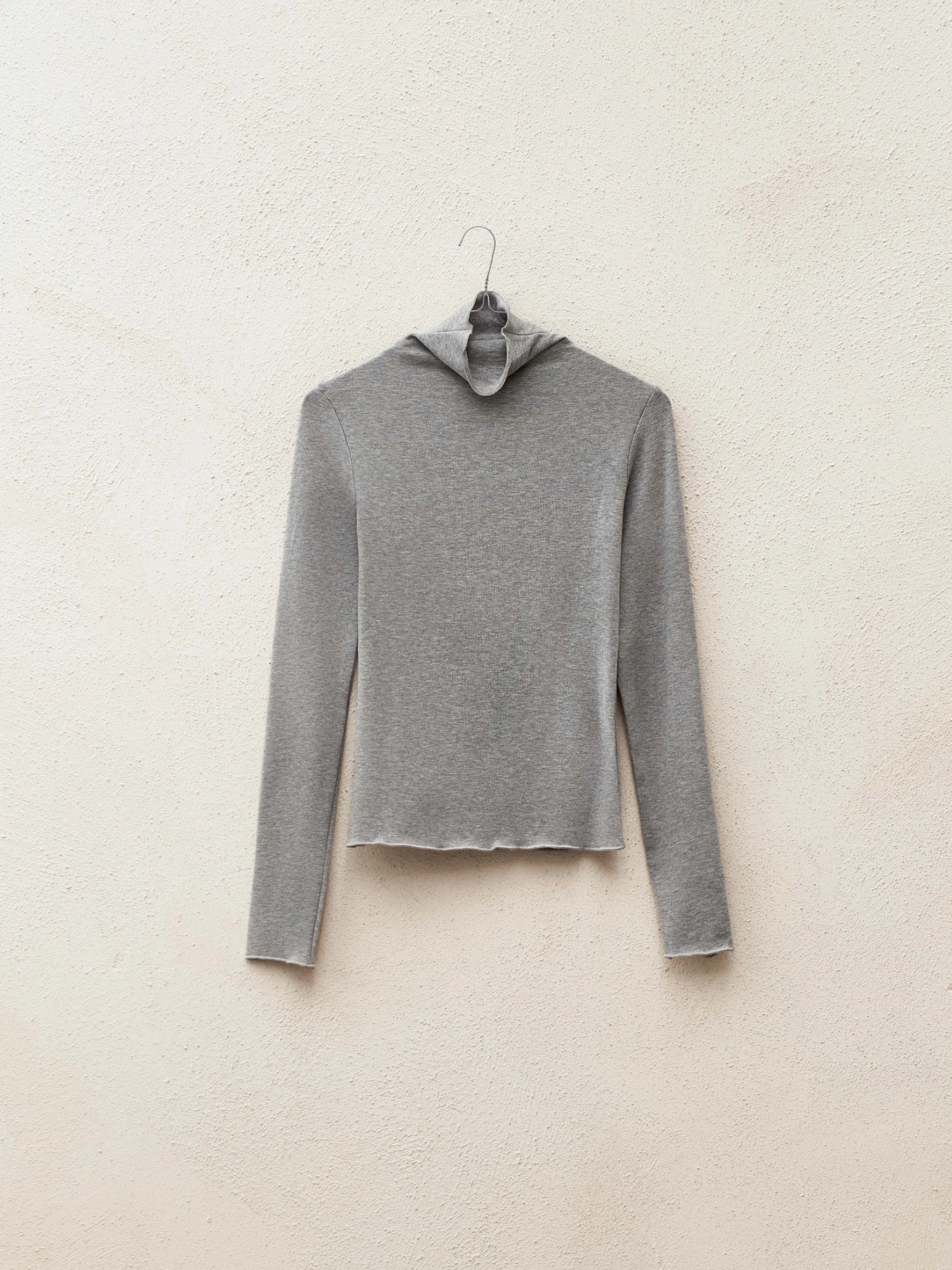 A fitted turtleneck made from soft and lightweight fabric with a cotton blend. It features a simple cut with raw-edge detailing and a fold-over collar. Perfect as a base layer under a blazer, cardigan, or sweater. Pair it with high-waisted trousers, jeans, or a skirt to enjoy a timeless and minimalist look for both work and everyday wear.