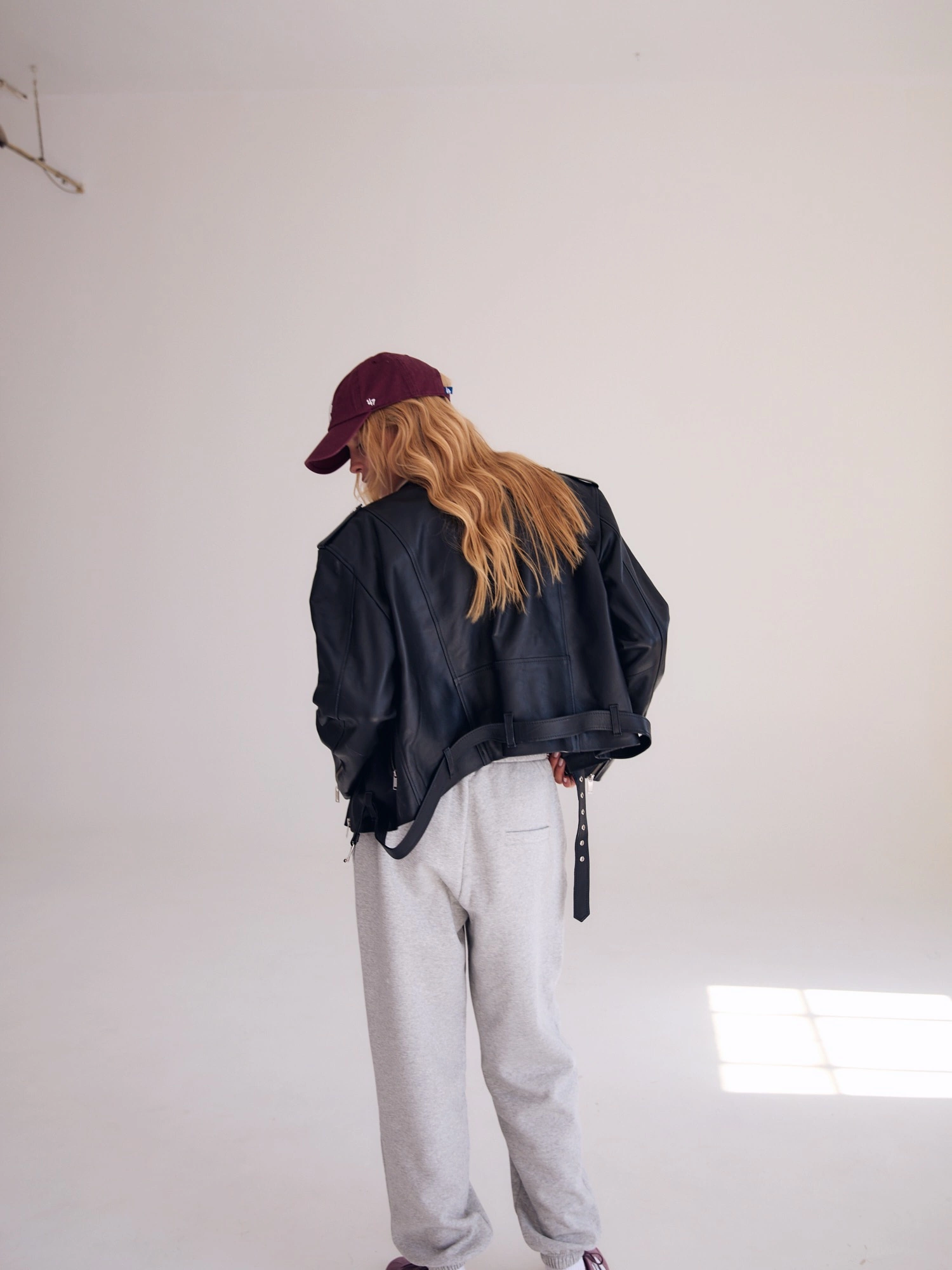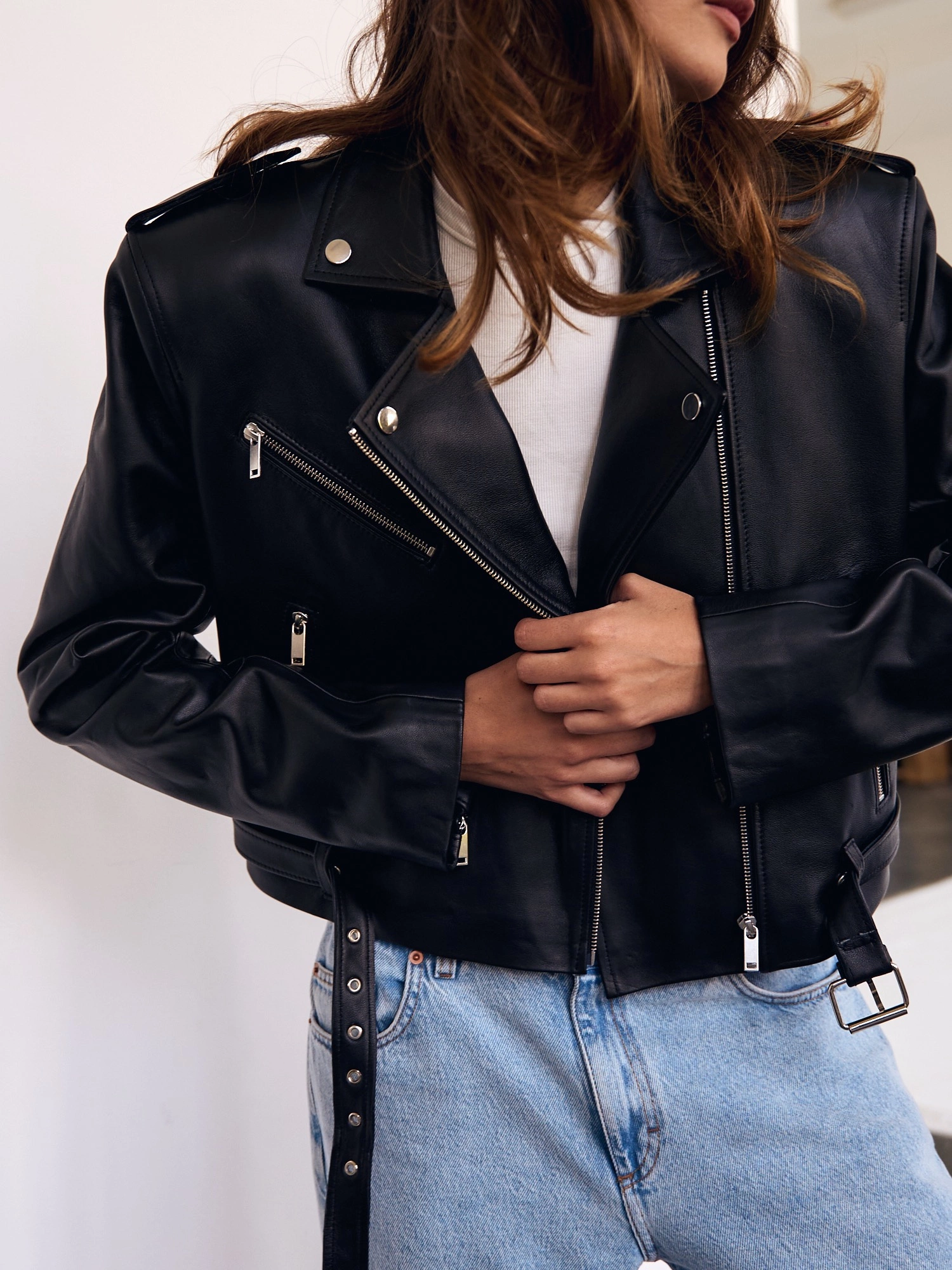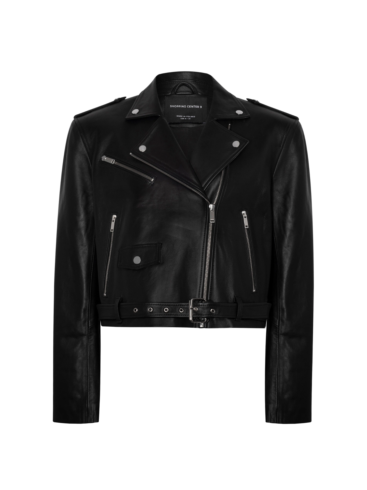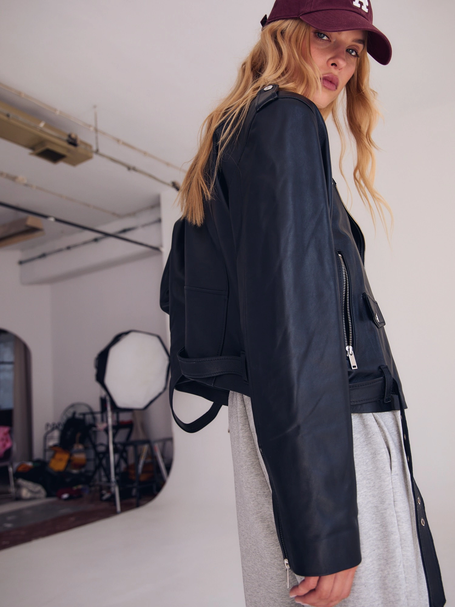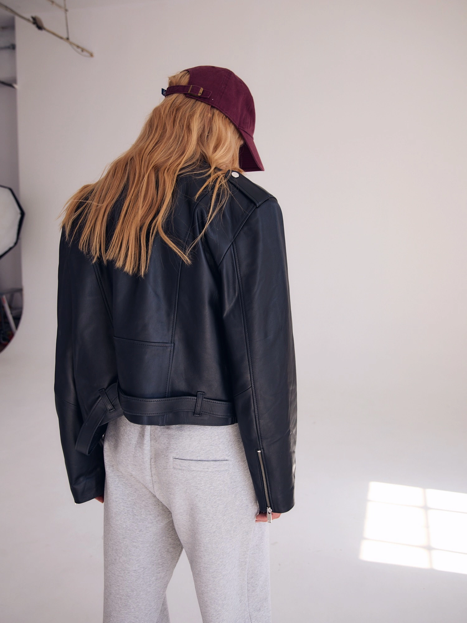 An oversized leather biker jacket with a boxy cut and strongly defined shoulder line. It features distinctive embellishments, including buckle straps, epaulettes, and decorative zippers and snaps. The sleeve width is adjustable with classic zippers at the wrists, and the jacket fastens on the side. It is made from soft, natural lambskin leather, with the added benefit of a viscose lining. This is a timeless piece that never goes out of style. Perfect for any season and a versatile addition to any wardrobe.
