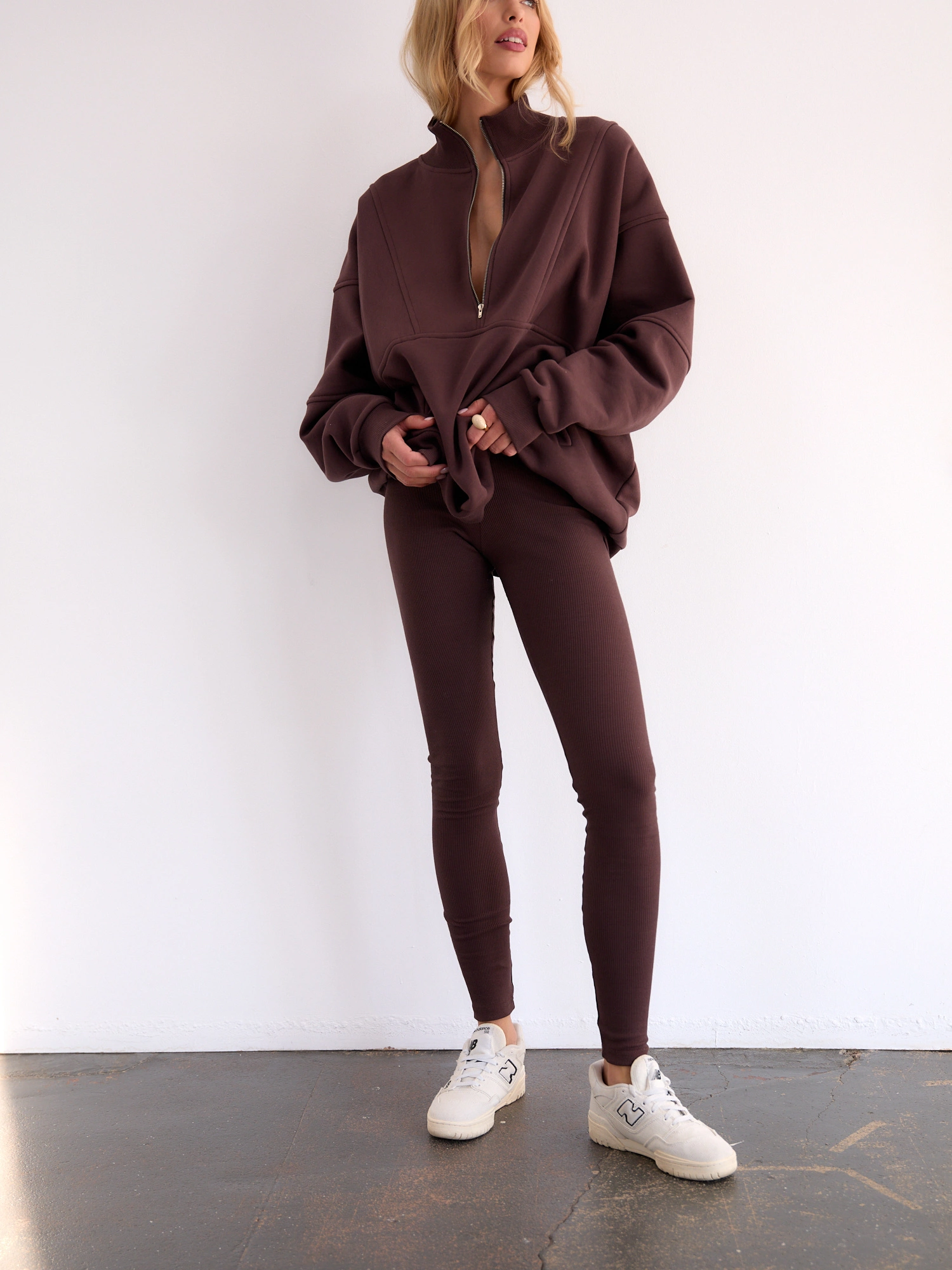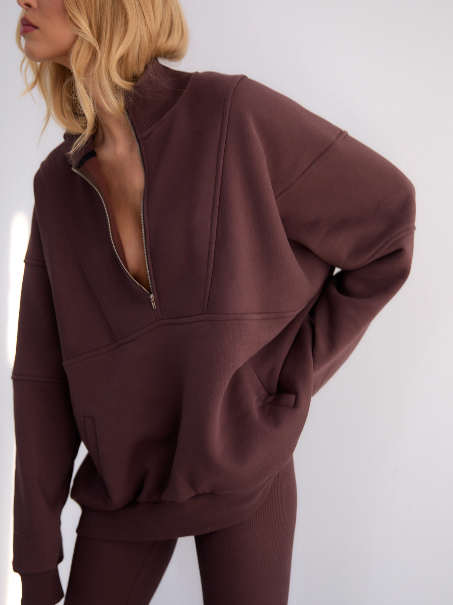 An oversized sweatshirt with a stylish stand-up collar and zipper. Made from soft cotton, it’s lined with a plush interior. The extra-long length makes it perfect to wear with leggings or slim-fit pants. The distinctive design features decorative stitching and an adjustable zippered neckline, allowing you to style it just the way you like! Trust us, you won’t want to swap it for any other.