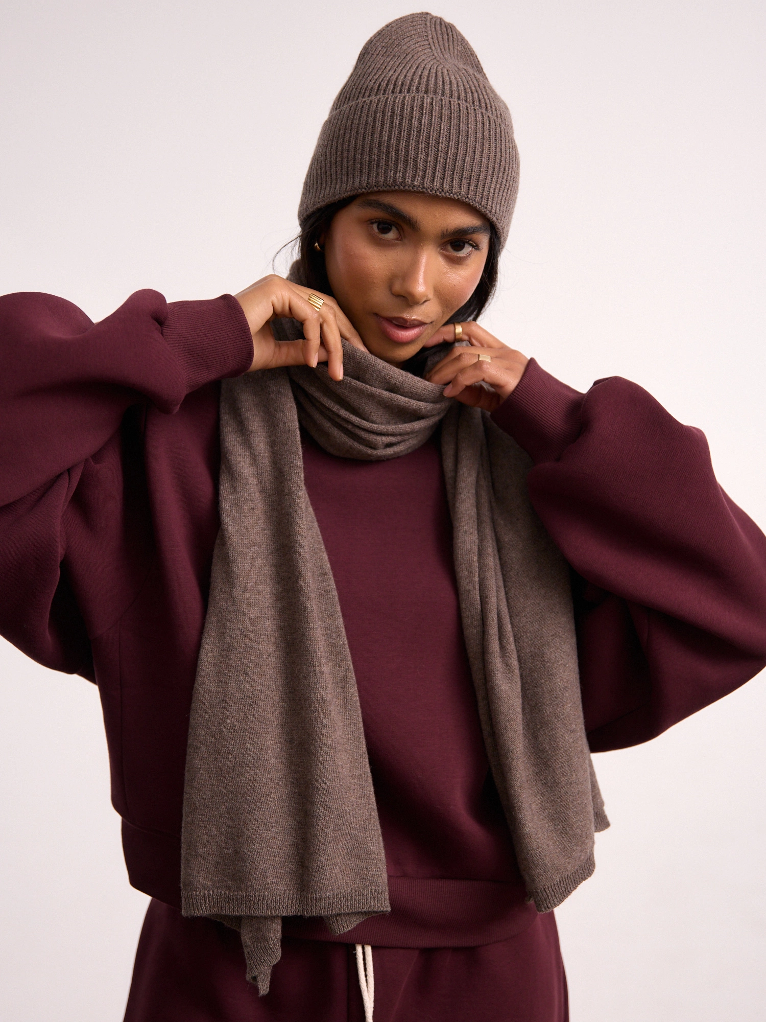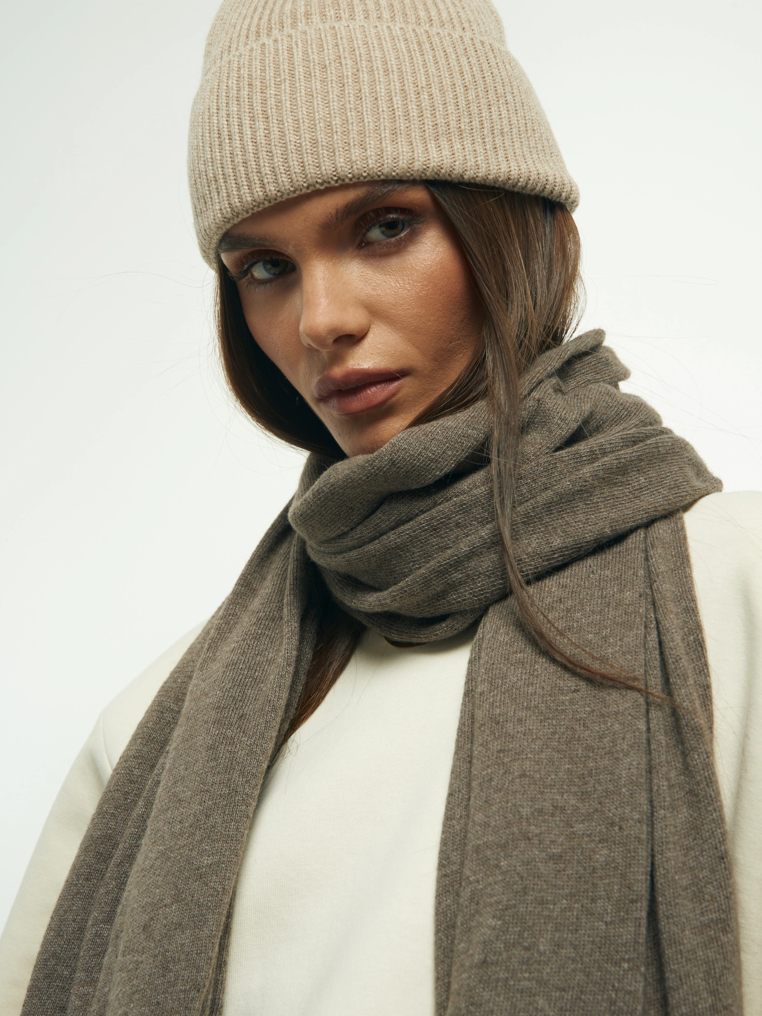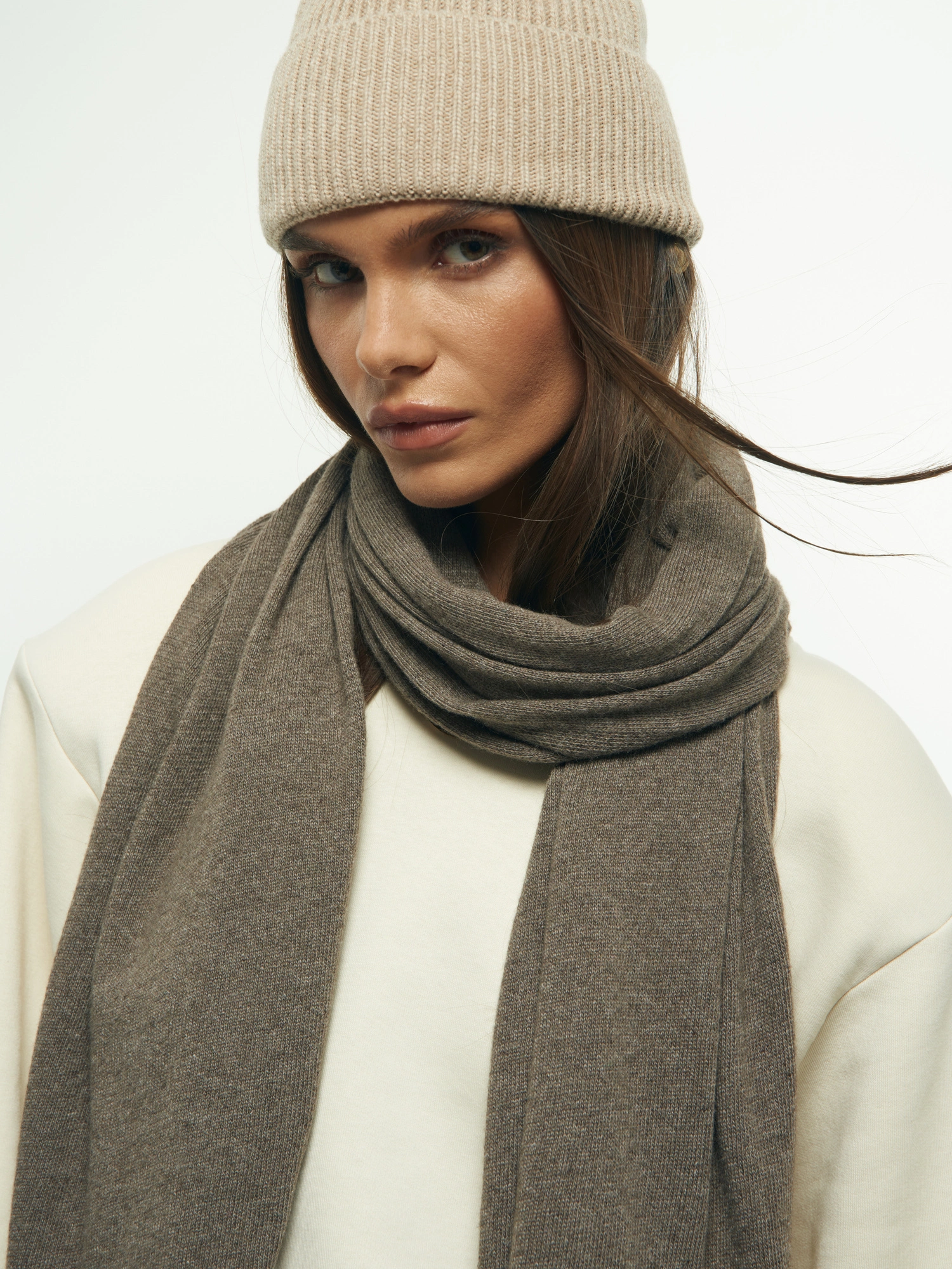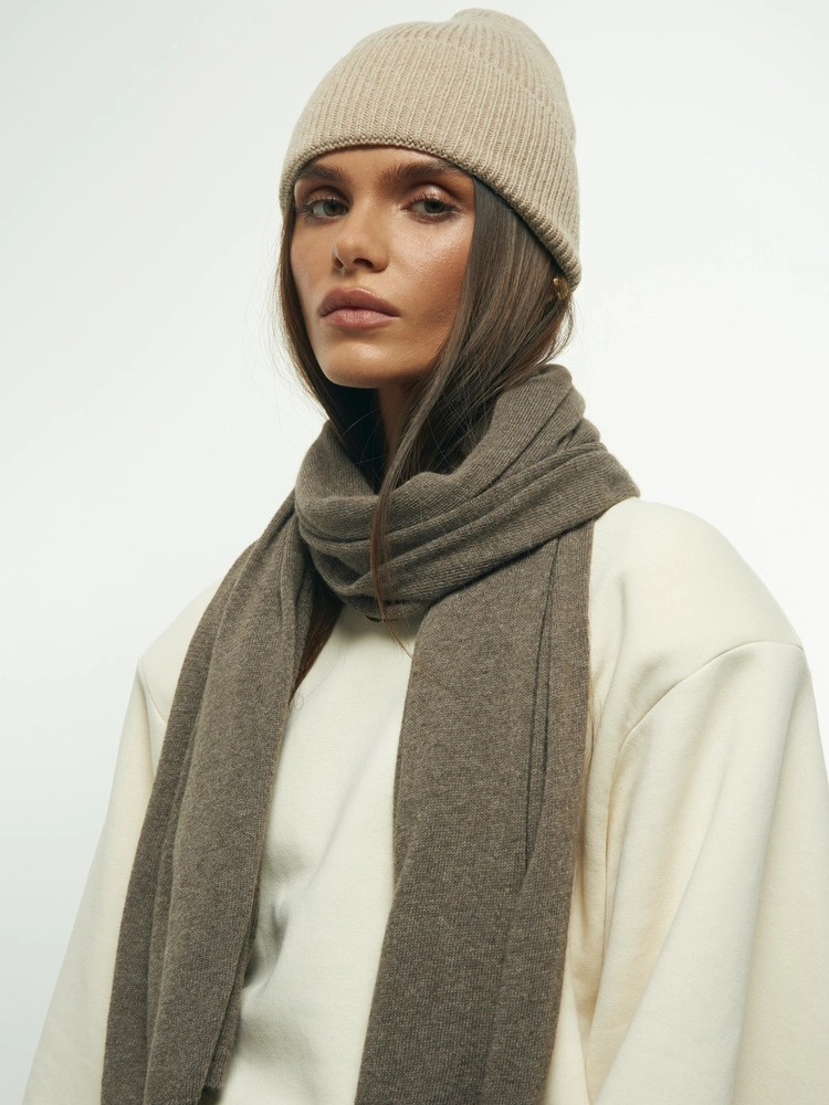 A simple scarf made from an incredibly soft, non-itchy knit with a blend of cashmere and wool (50% each!). It's long, elegant, and perfectly wide, and when paired with the matching HAT, it creates a set that will keep you warm on cooler days. This is a fantastic accessory that will elevate any fall or winter outfit, and the two versatile colors will match everything.