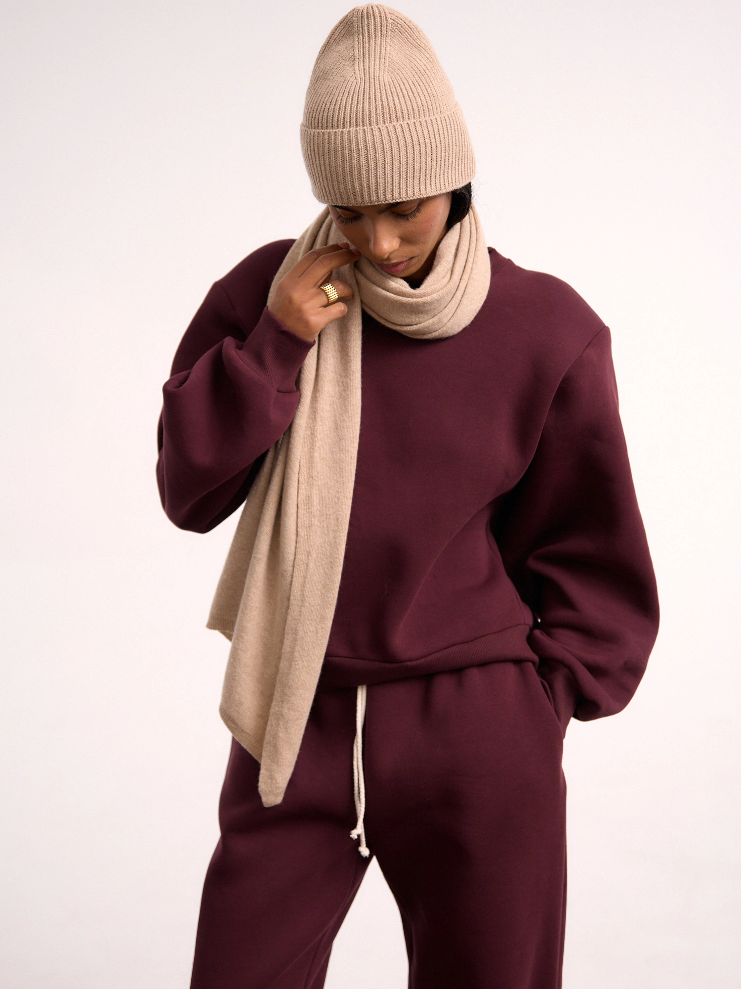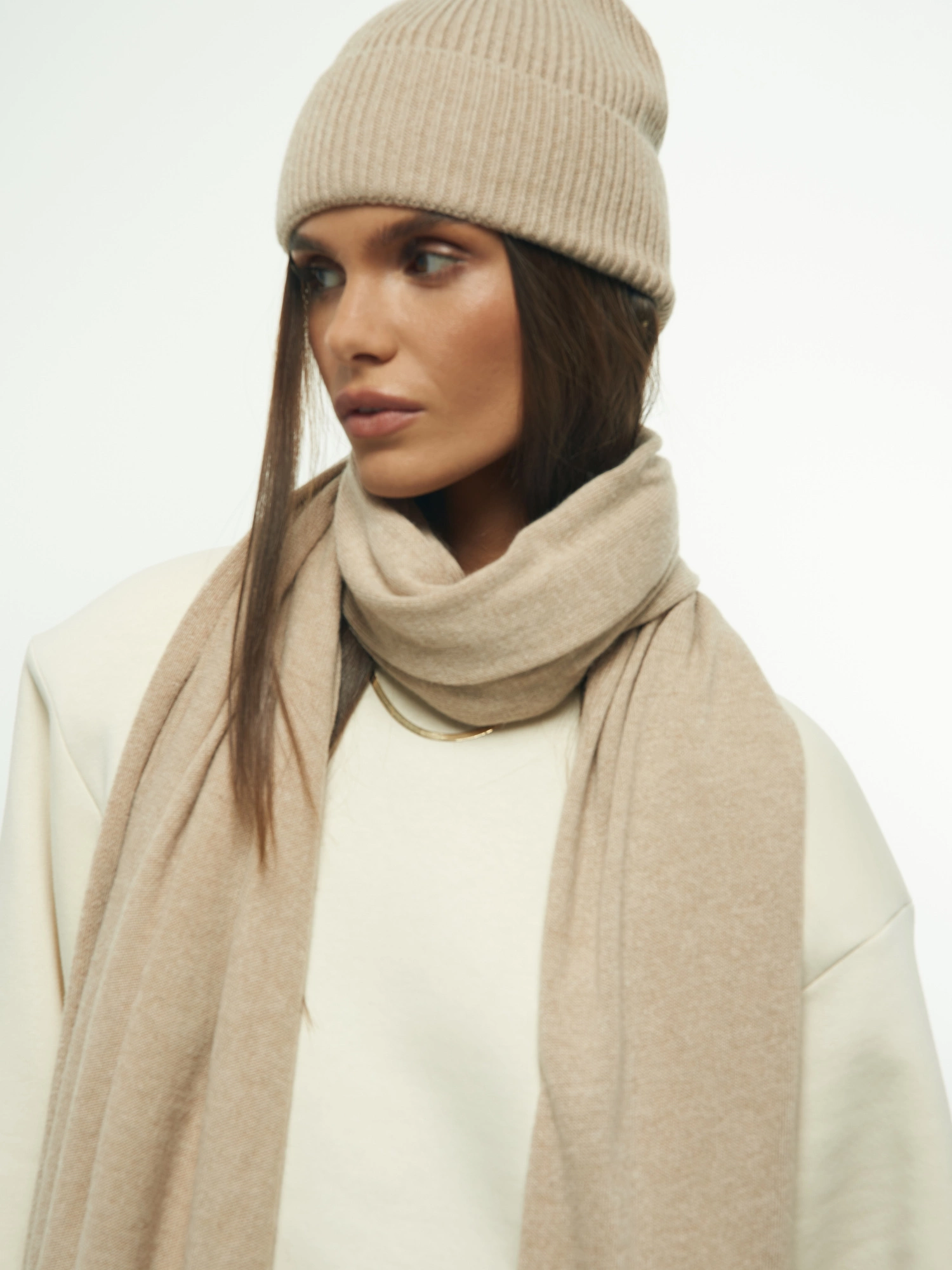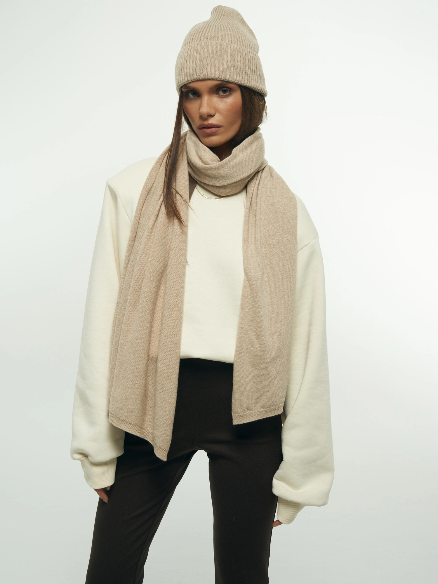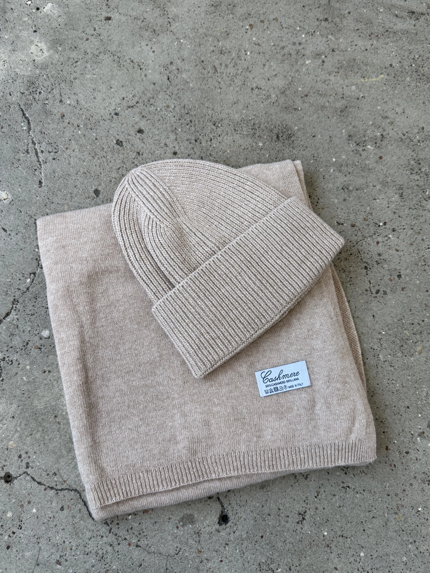 A simple scarf made from an incredibly soft, non-itchy knit with a blend of cashmere and wool (50% each!). It's long, elegant, and perfectly wide, and when paired with the matching HAT, it creates a set that will keep you warm on cooler days. This is a fantastic accessory that will elevate any fall or winter outfit, and the two versatile colors will match everything.