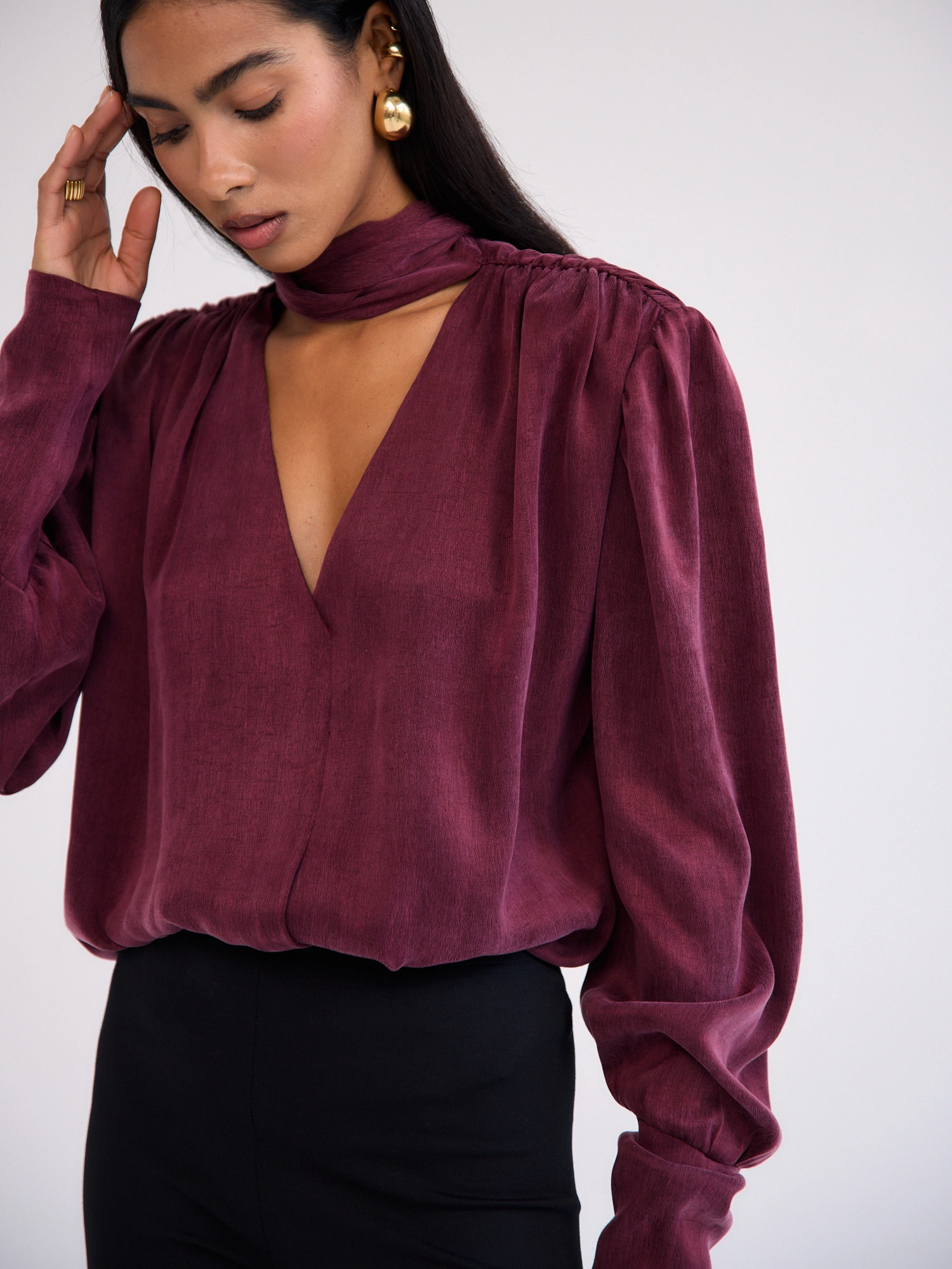 Bold, distinctive shoulders with padded accents and decorative gathers define this piece. The V-neckline beautifully highlights the collarbone and accentuates the décolletage. Adding a touch of casual elegance is an ornamental sash that can be styled around the neck or left to drape freely. The long, puffed sleeves are finished with wide cuffs, adding to its sophisticated charm. Crafted from an incredibly soft and fluid blend of lyocell and viscose, the fabric boasts a refined satin-like sheen.