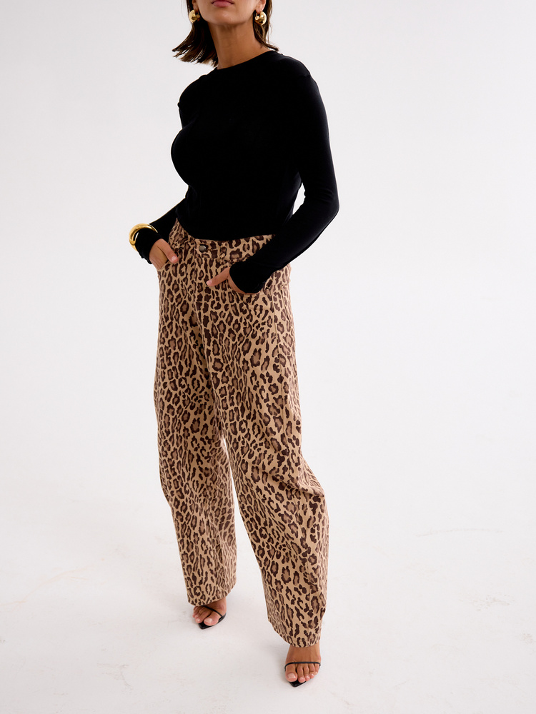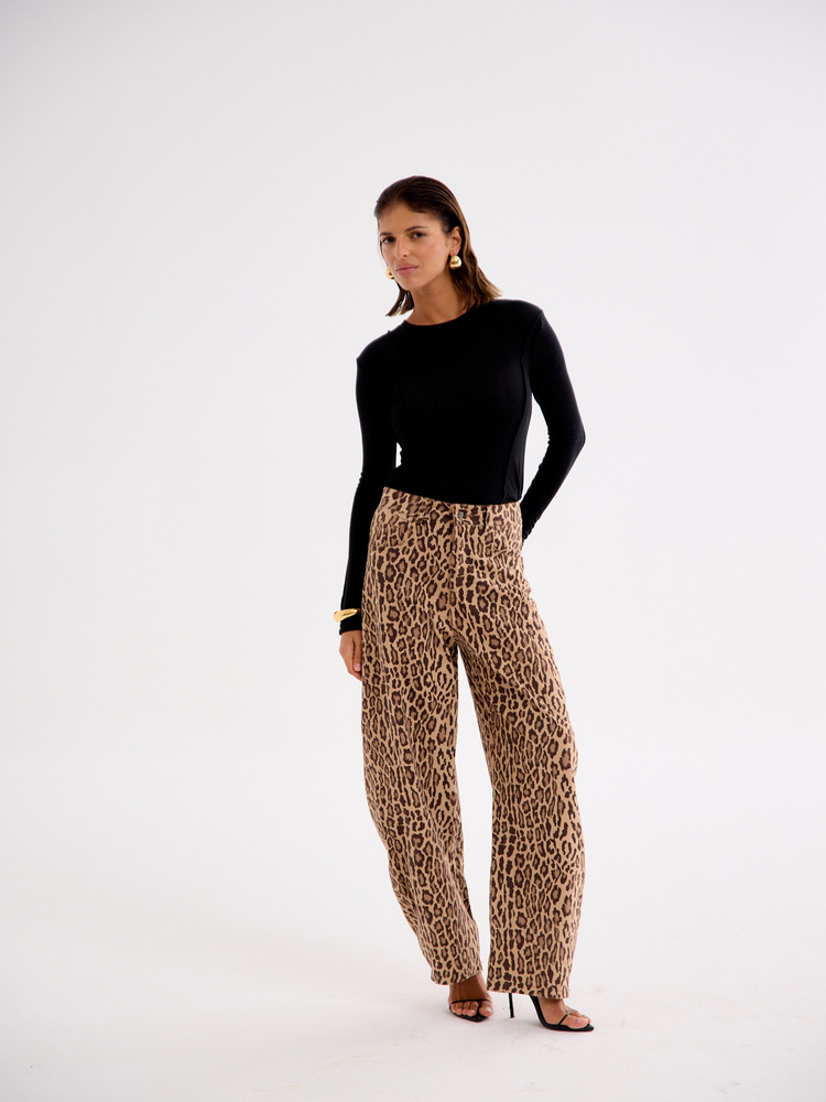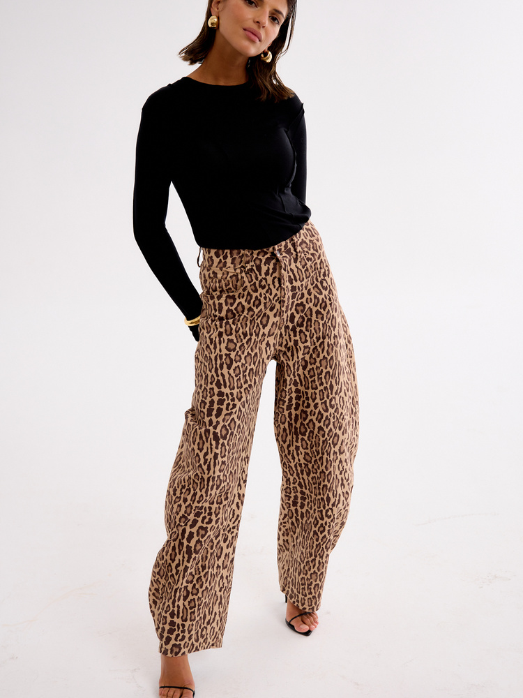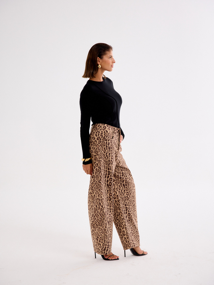 Wide-leg balloon trousers with a bold animal print. Made from a soft, lightweight fabric, they drape beautifully and offer all-day comfort. The relaxed fit and high waist flatter the silhouette while ensuring ease of movement. A statement piece that pairs effortlessly with a basic top and sneakers for a casual look or with a fitted bodysuit and heels for an evening out. Embrace the striking print and add a touch of extravagance to your style.