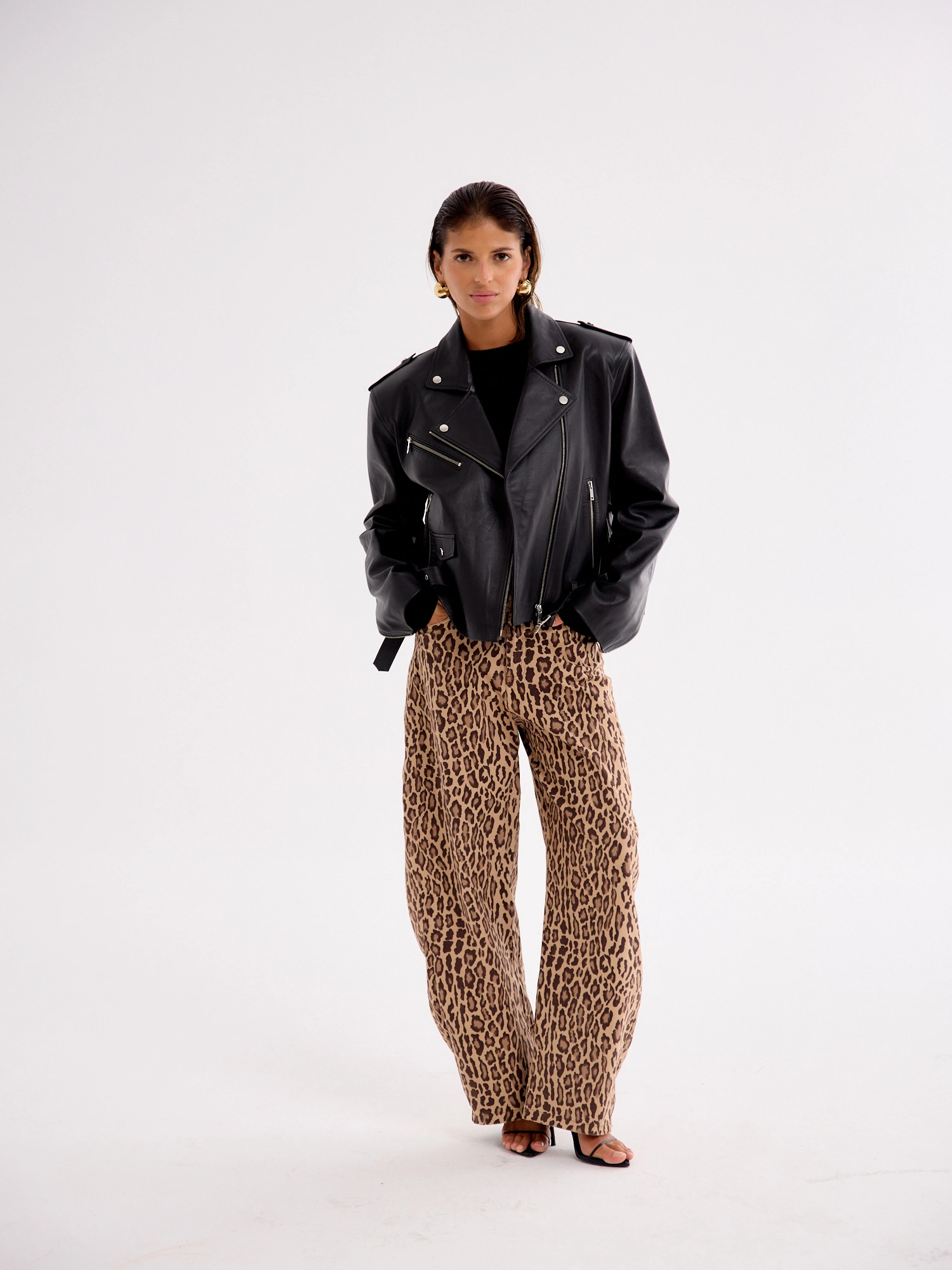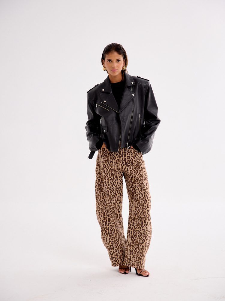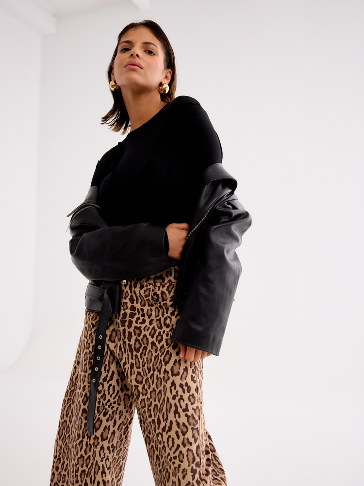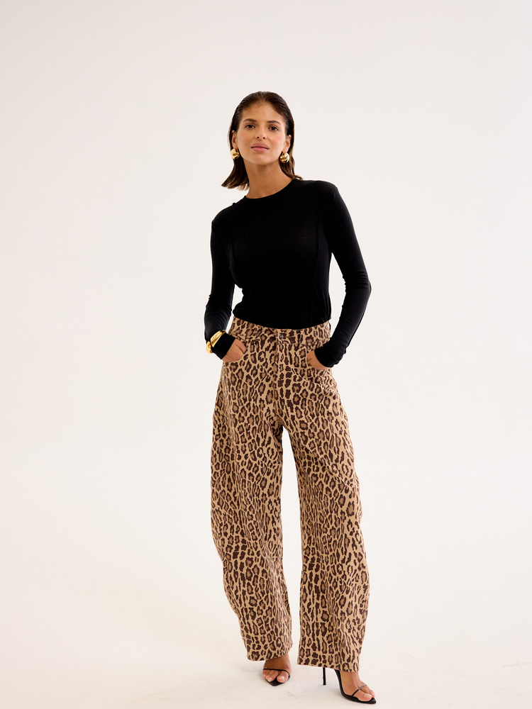 Wide-leg balloon trousers with a bold animal print. Made from a soft, lightweight fabric, they drape beautifully and offer all-day comfort. The relaxed fit and high waist flatter the silhouette while ensuring ease of movement. A statement piece that pairs effortlessly with a basic top and sneakers for a casual look or with a fitted bodysuit and heels for an evening out. Embrace the striking print and add a touch of extravagance to your style.