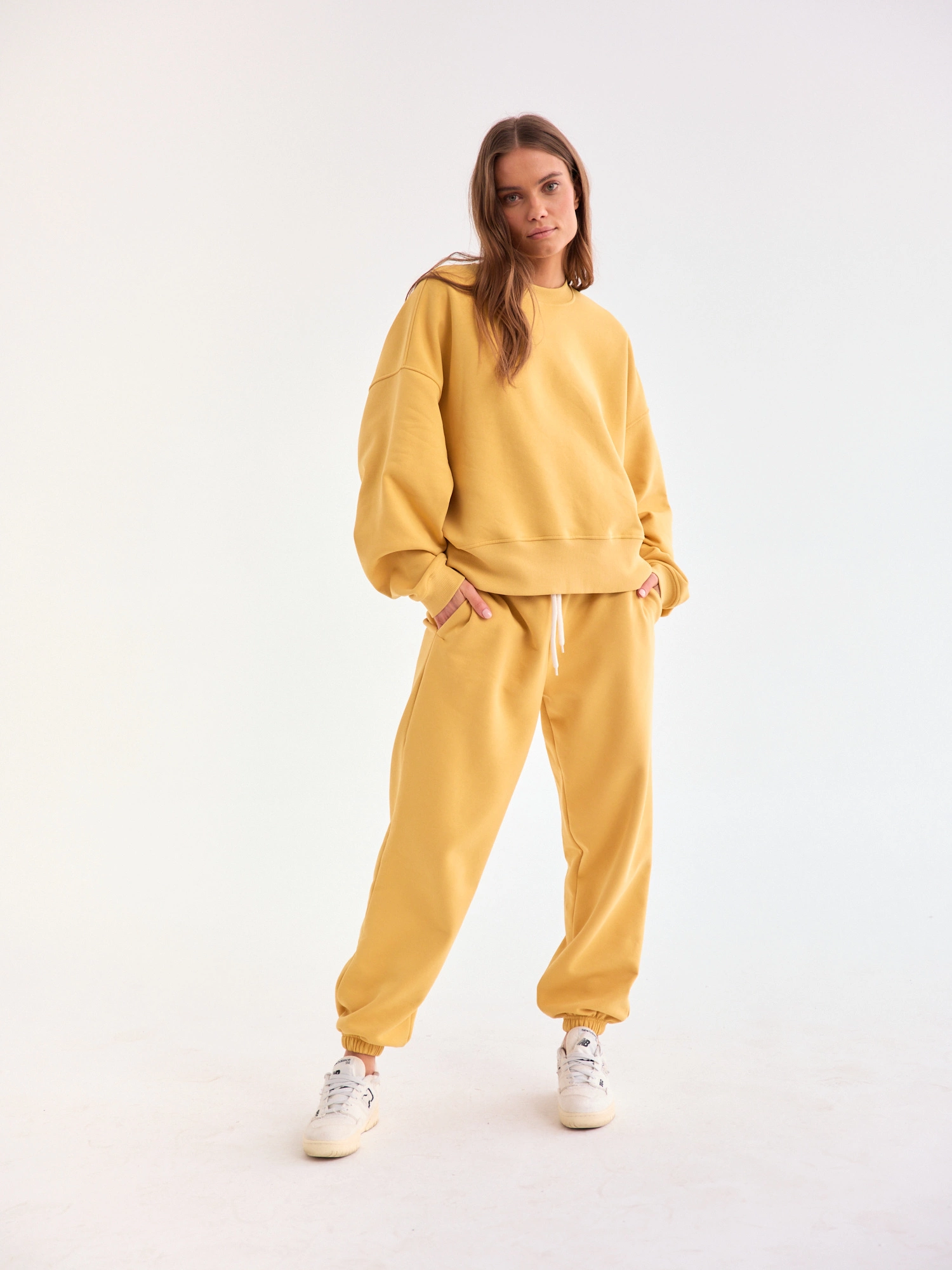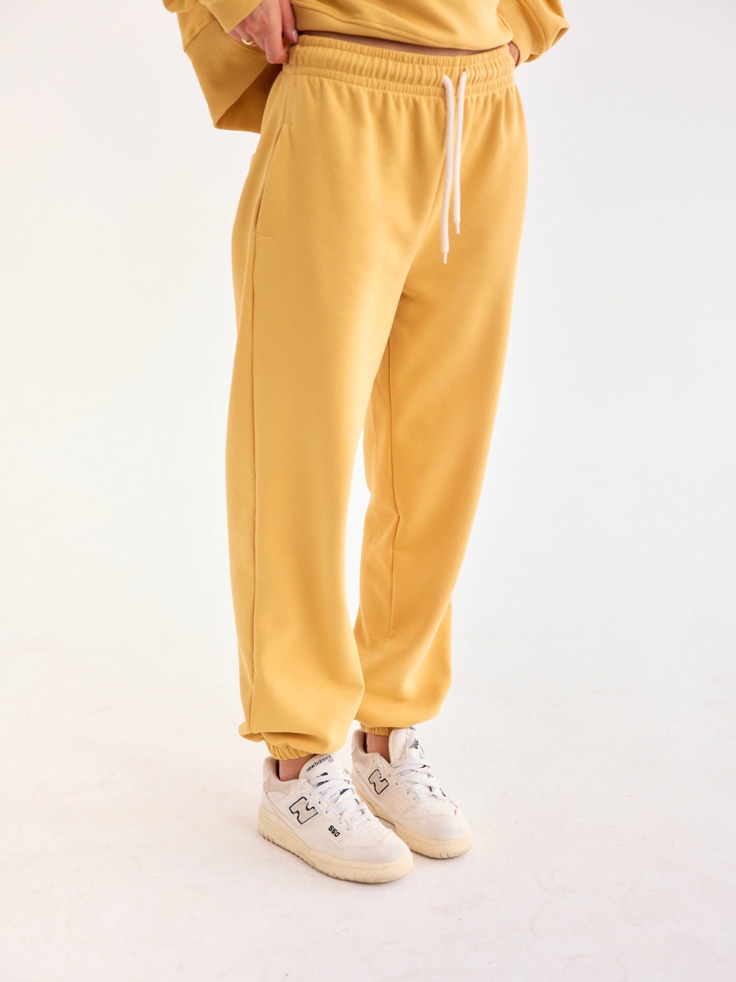 Oversized joggers made from ultra-soft cotton. The waistband features a comfortable elastic band with an adjustable drawstring, allowing you to wear them however you like—high on the waist or low on the hips. They have wide, relaxed legs with fitted cuffs and convenient side pockets. The inside is lined with soft fleece, yet the fabric is exceptionally lightweight and thinner, making it perfect for spring.