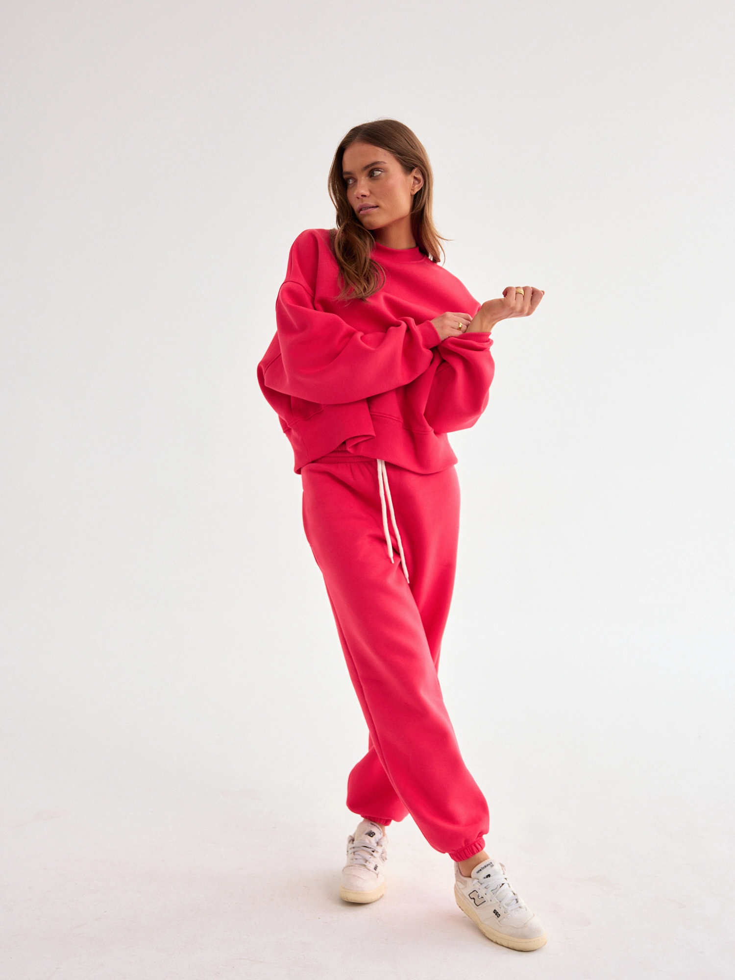 Oversized joggers made from soft, comfortable cotton with a cozy fleece lining inside. The elastic waistband with an adjustable drawstring lets you wear them just the way you like—high-waisted or low on the hips. Featuring wide, relaxed legs with fitted cuffs and handy side pockets. Pair them with a cropped or full-length sweatshirt for a laid-back vibe, or dress them up with a padded-shoulder T-shirt and a leather jacket for the perfect look to kick off the new season.
