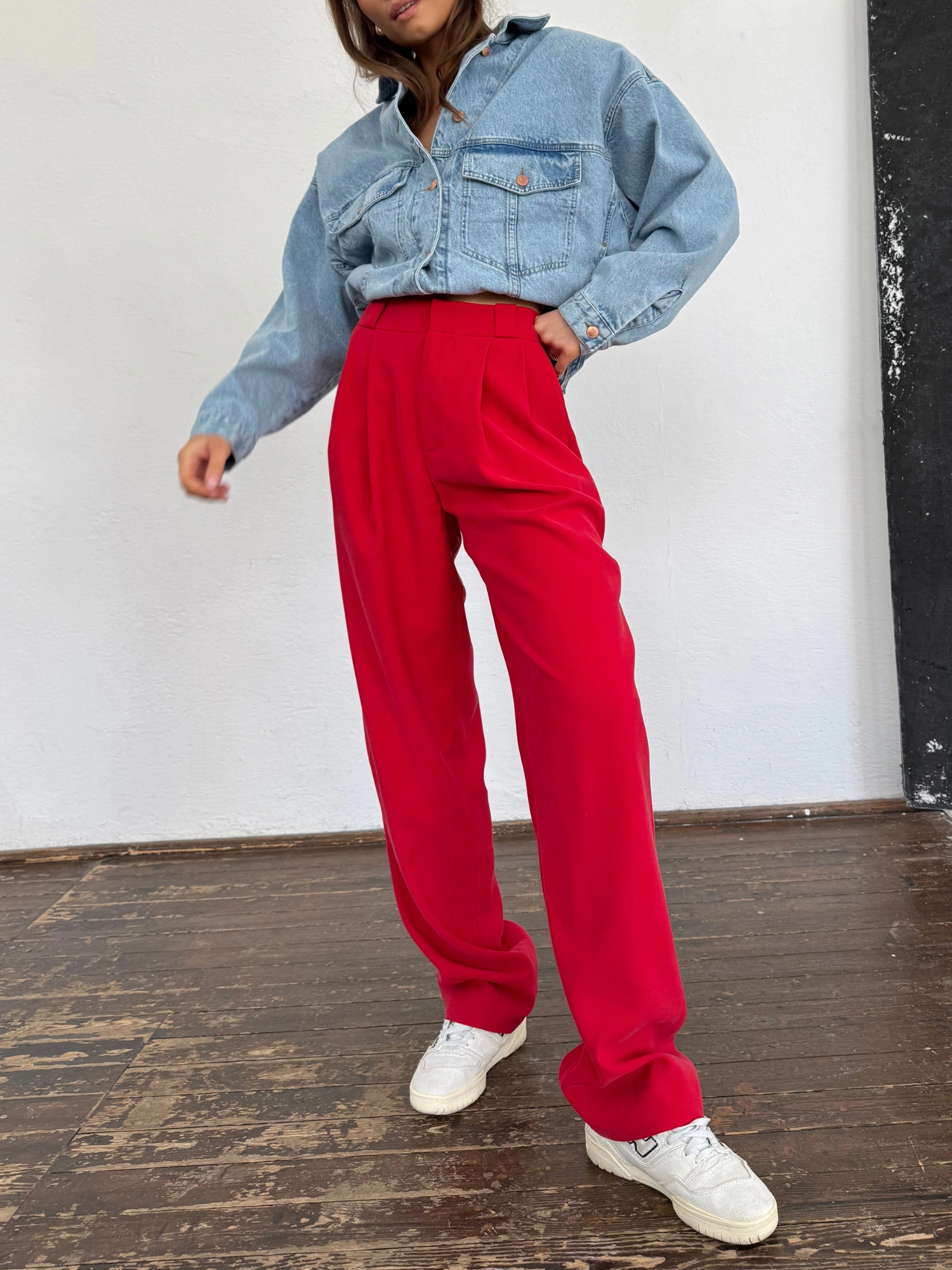 Elegant high-waisted trousers with front pleats, crafted from soft and satin-like viscose in a beautiful shade of red. Inspired by men's fashion, they feature long, straight legs. Perfect for both everyday wear and more formal occasions, they serve as a versatile base for various outfits—from sporty to sophisticated. They pair beautifully with a dress shirt, a cozy sweater, or a casual sweatshirt. Designed with two practical pockets and a zip fastening.