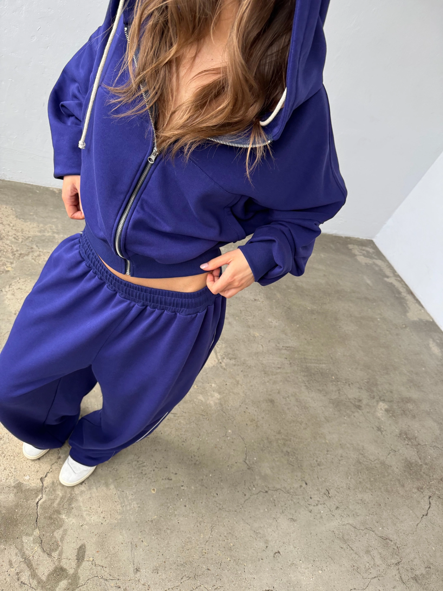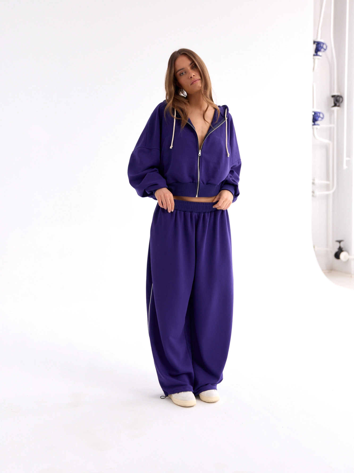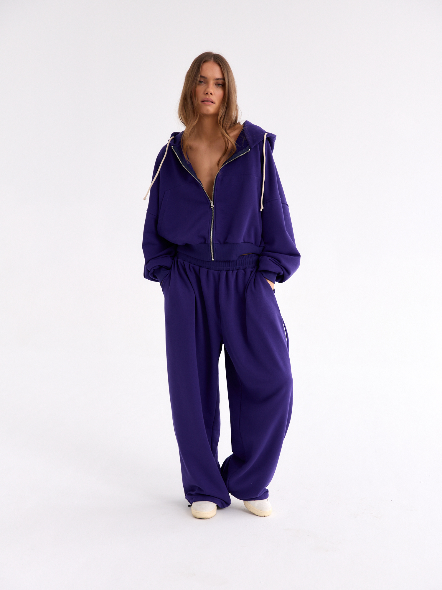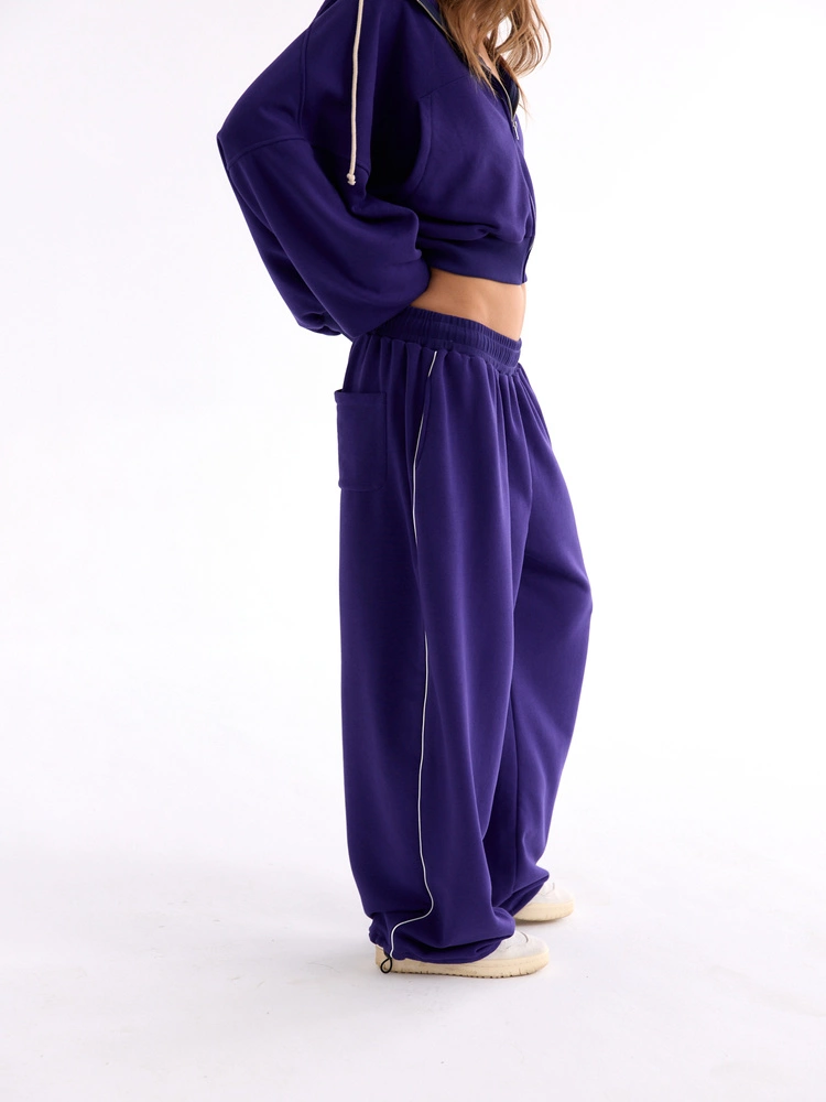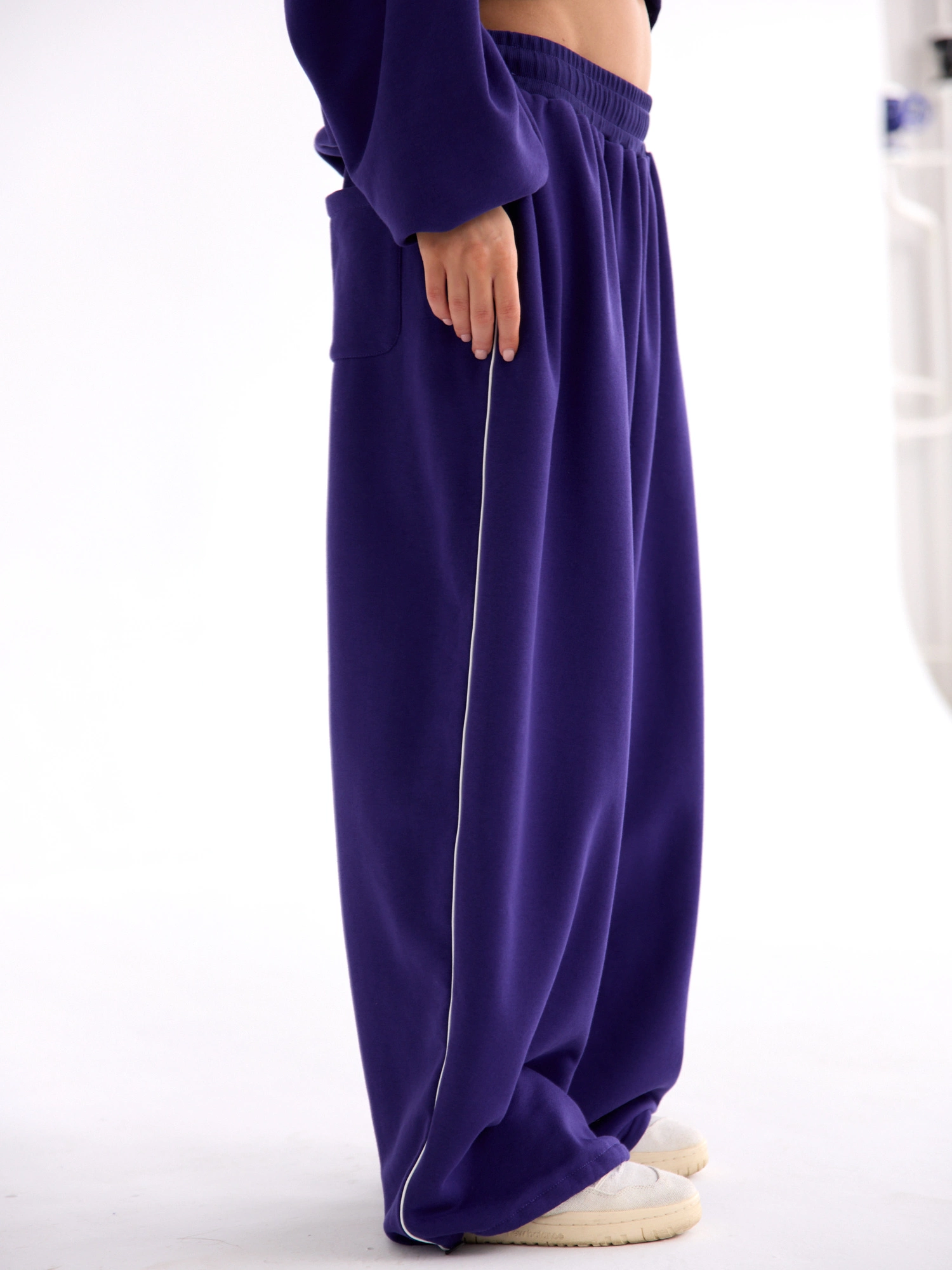 Wide-leg sweatpants made from ultra-soft cotton with a looped interior finish. The comfortable elastic waistband with an adjustable drawstring allows you to wear them high-waisted or low on the hips—whatever suits you best. Featuring wide, relaxed legs with adjustable elastic cuffs at the bottom and decorative side stripes.