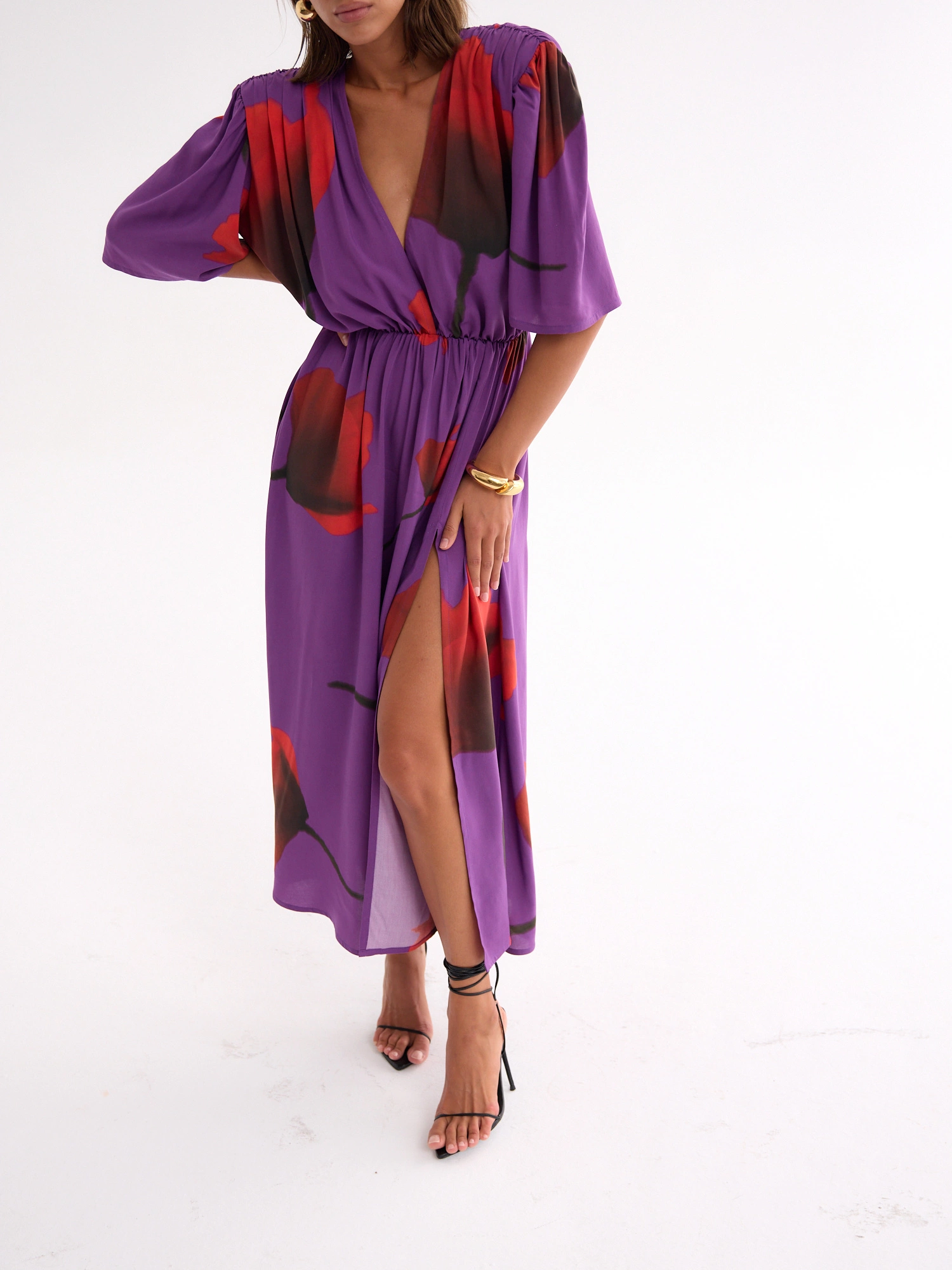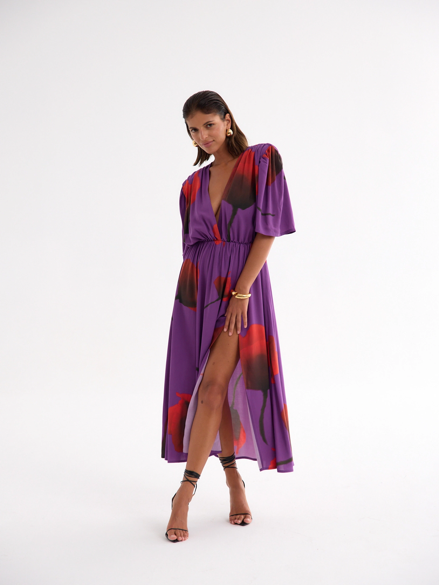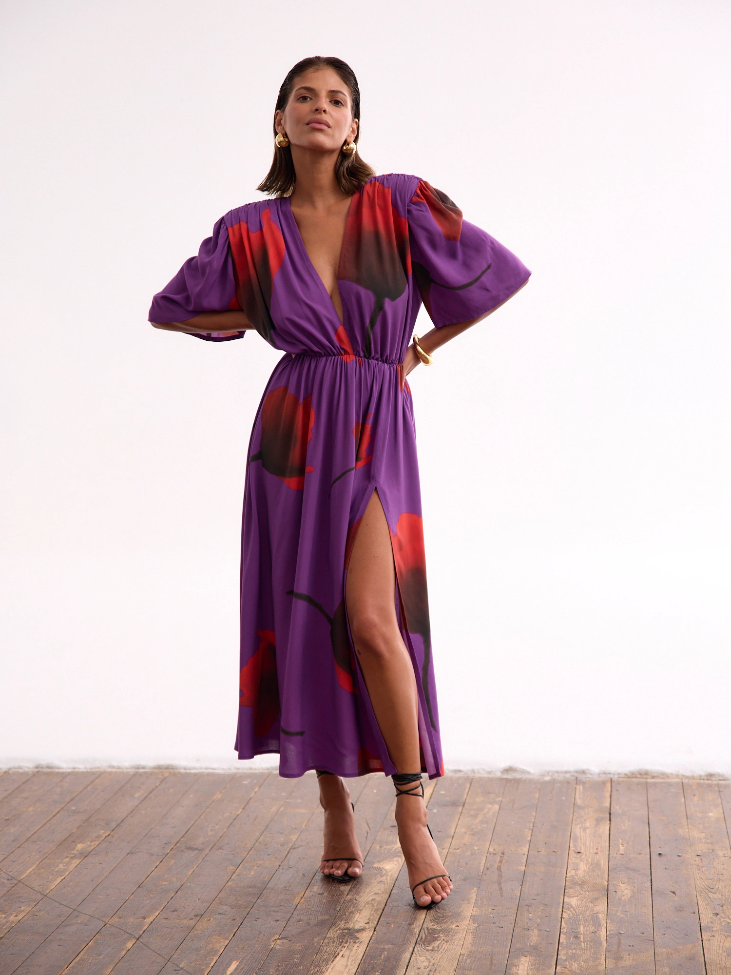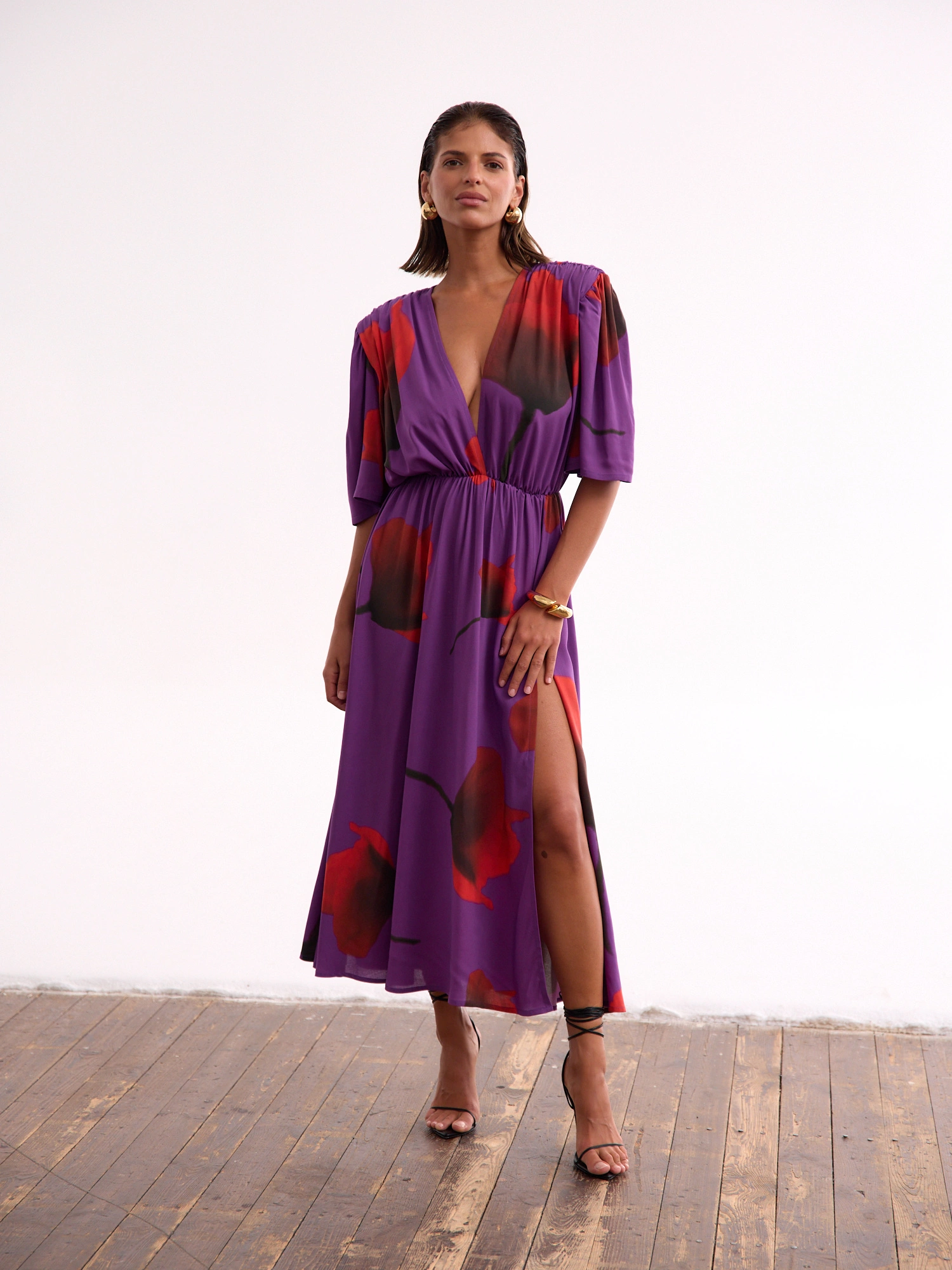 Sukienka midi w wyjątkowym kwiatowym princie. Głęboki dekolt w kształcie litery V zniewalająco eksponuje linię biustu i optycznie wydłuża szyję. Poduszki na ramionach charakterystycznie podkreślają ramiona, a głębokie rozcięcie na udzie przełamuje prostotę i subtelnie eksponuje nogę. Idealnie sprawdzi się w stylizacjach ze szpilkami i bez wątpienia przyciągnie niejedno spojrzenie.