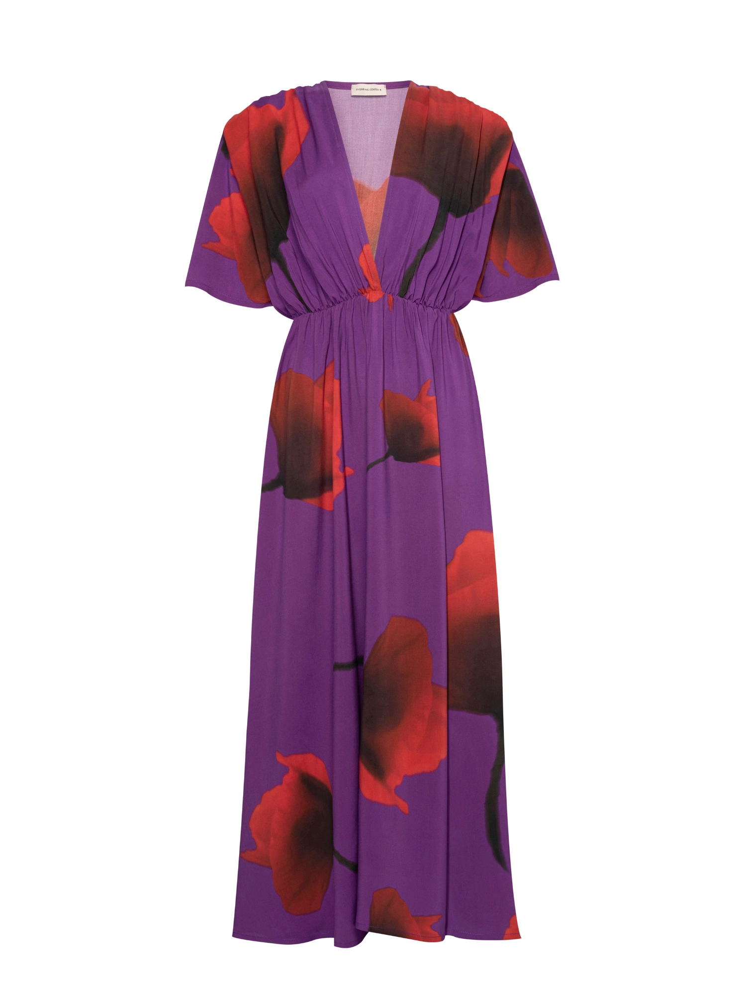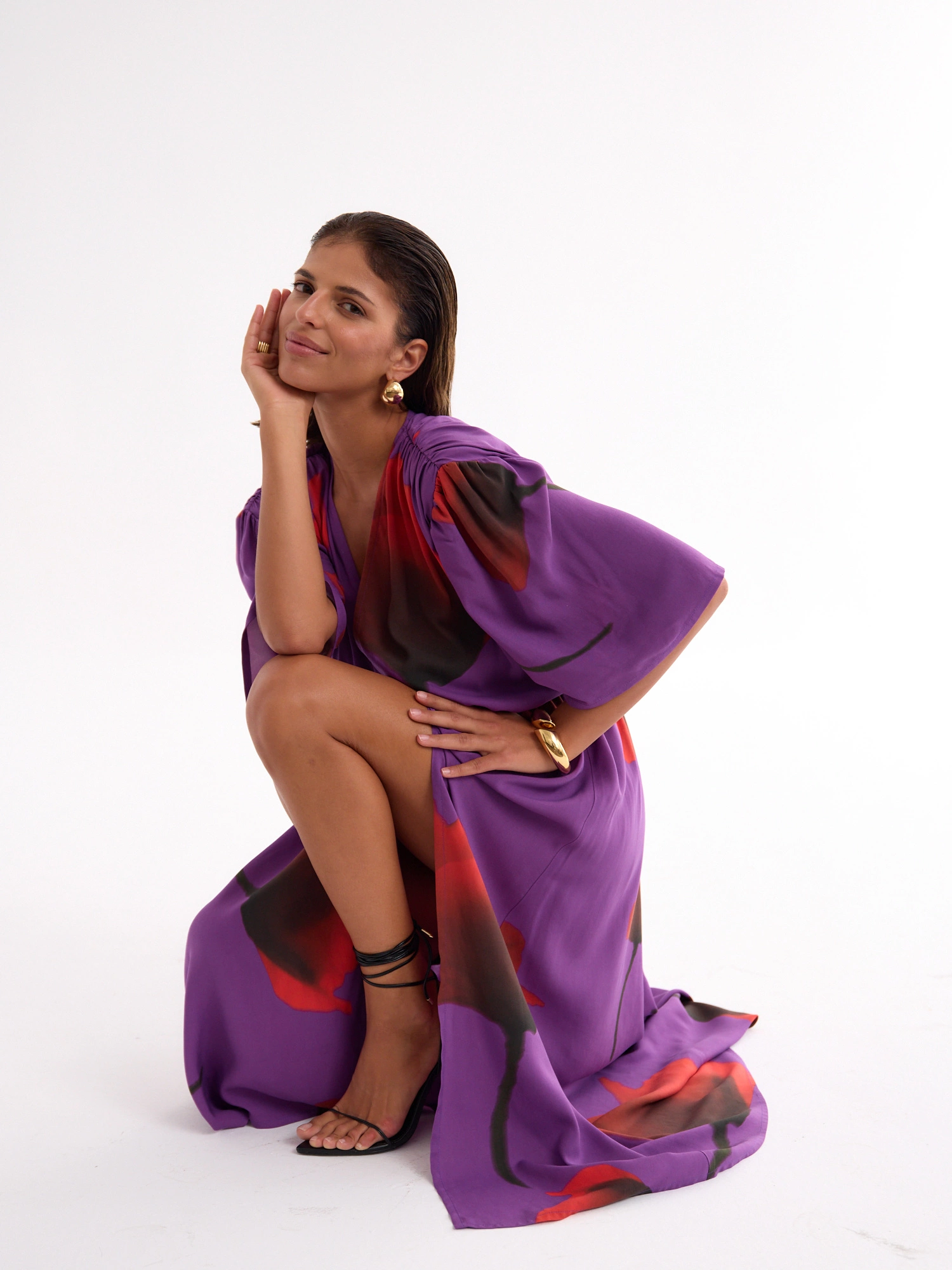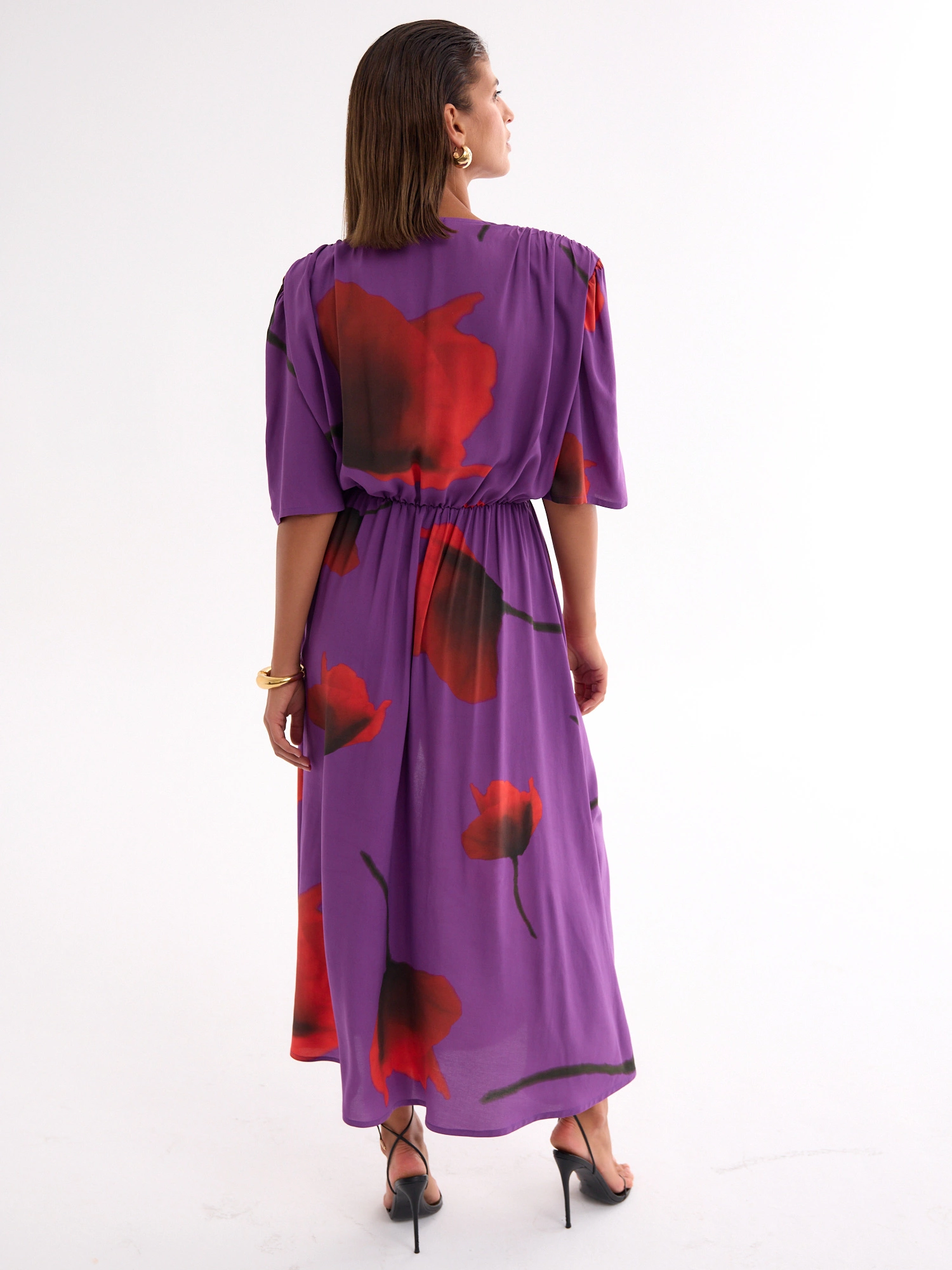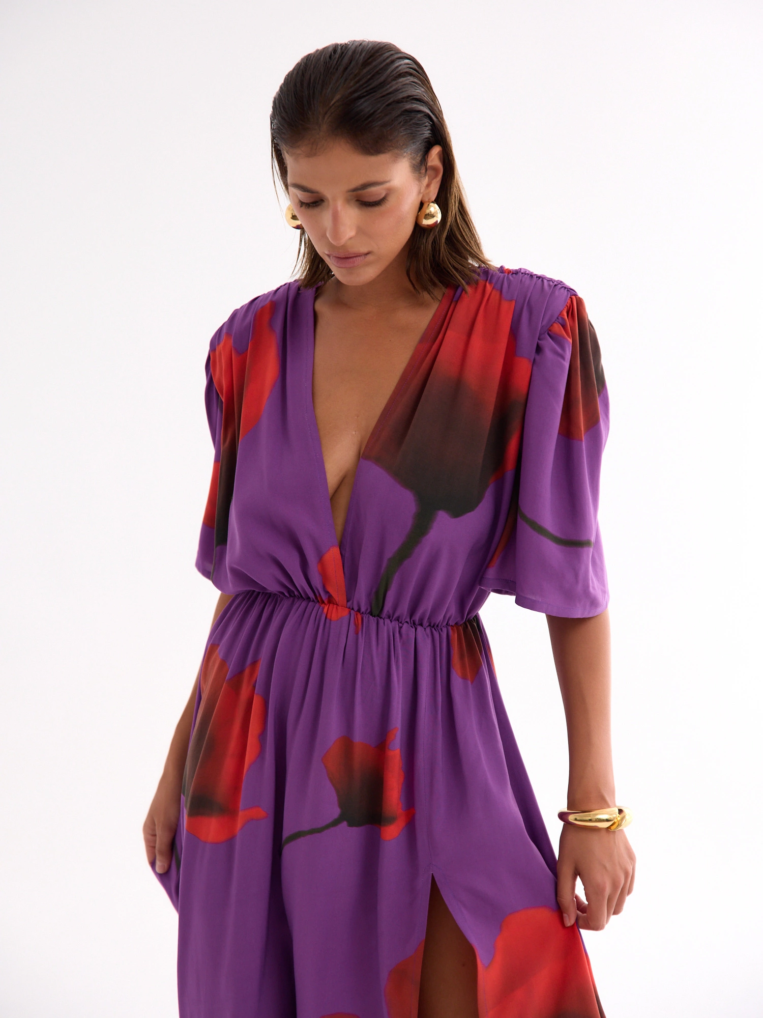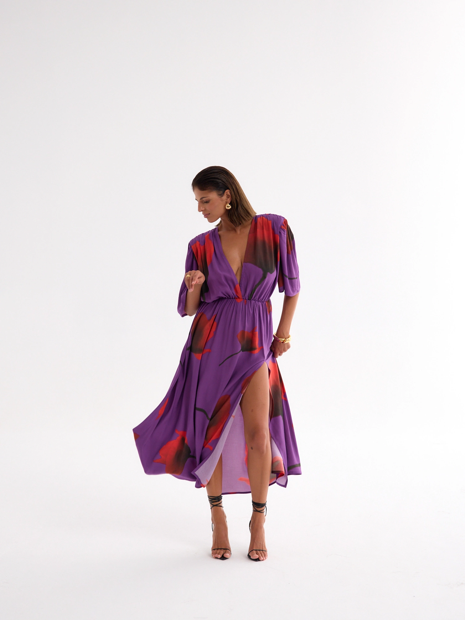 Sukienka midi w wyjątkowym kwiatowym princie. Głęboki dekolt w kształcie litery V zniewalająco eksponuje linię biustu i optycznie wydłuża szyję. Poduszki na ramionach charakterystycznie podkreślają ramiona, a głębokie rozcięcie na udzie przełamuje prostotę i subtelnie eksponuje nogę. Idealnie sprawdzi się w stylizacjach ze szpilkami i bez wątpienia przyciągnie niejedno spojrzenie.