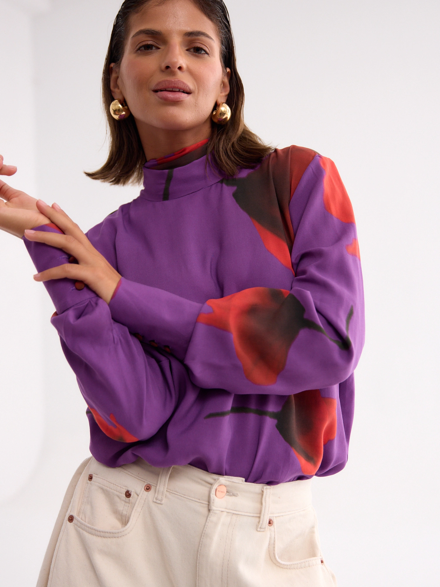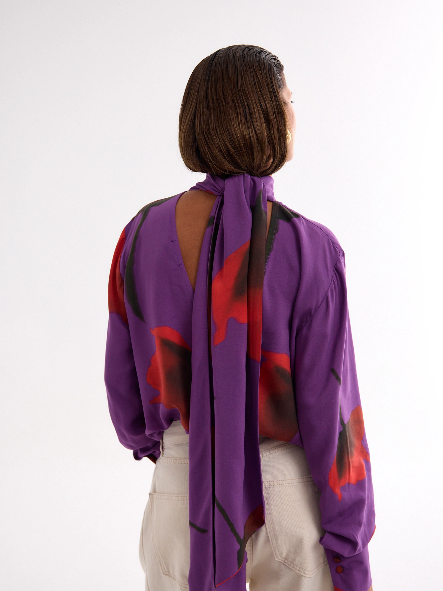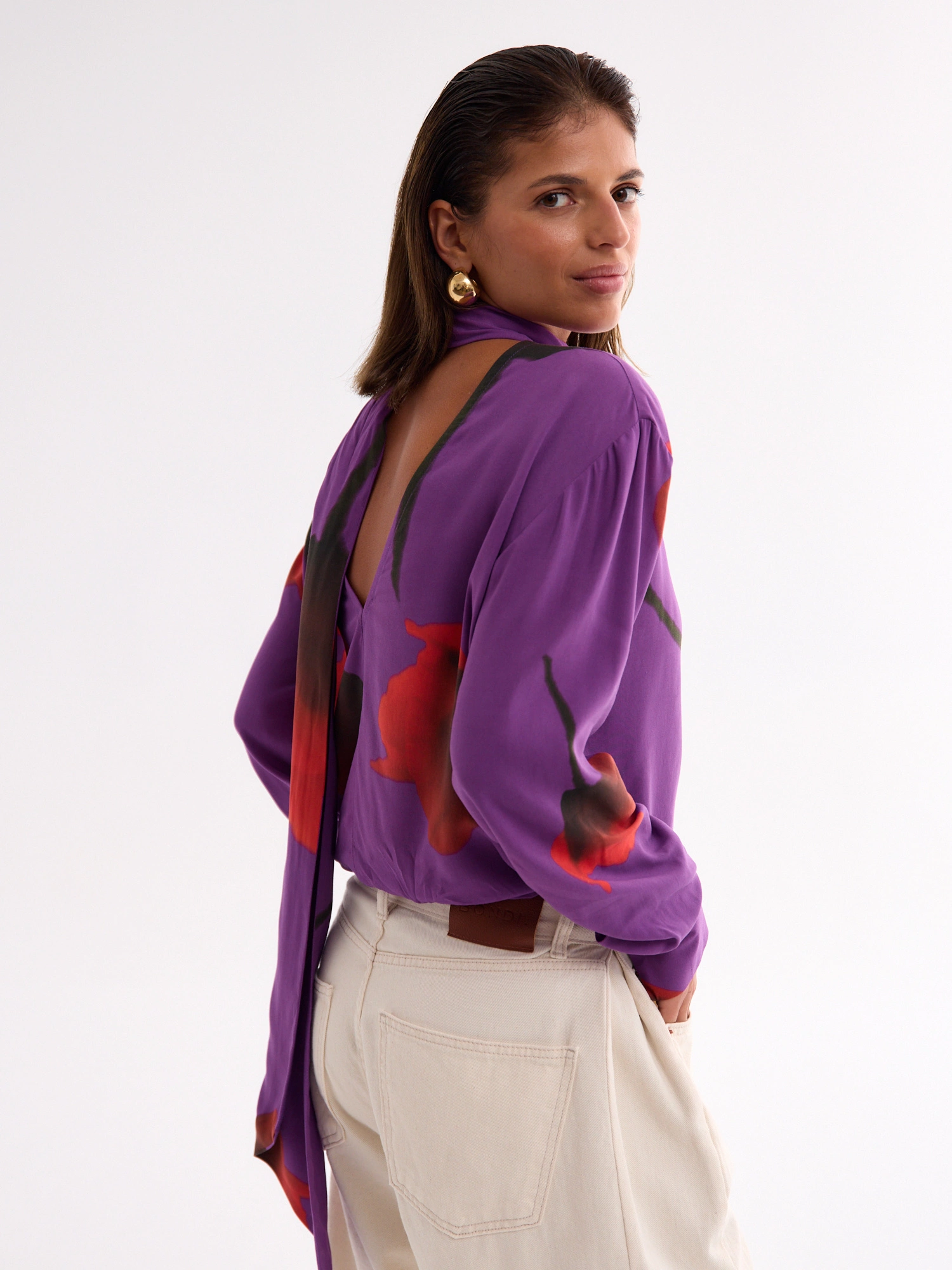 An airy, feminine, and elegant blouse with a simple cut that gracefully drapes over the silhouette. The deep open back adds a touch of sensuality, making it truly unique. A statement scarf completes the look—you can tie it in different ways or let it flow freely for an effortlessly chic effect. Featuring long sleeves finished with wide cuffs, it’s crafted from a delicate, fluid fabric that gently embraces the body and moves beautifully. A perfect choice for both everyday wear and special occasions—pair it with jeans for a stylish casual look or with tailored pants or a skirt for an effortlessly sophisticated ensemble.