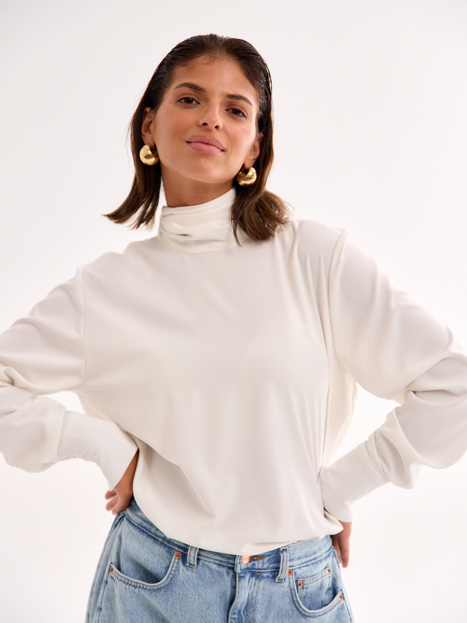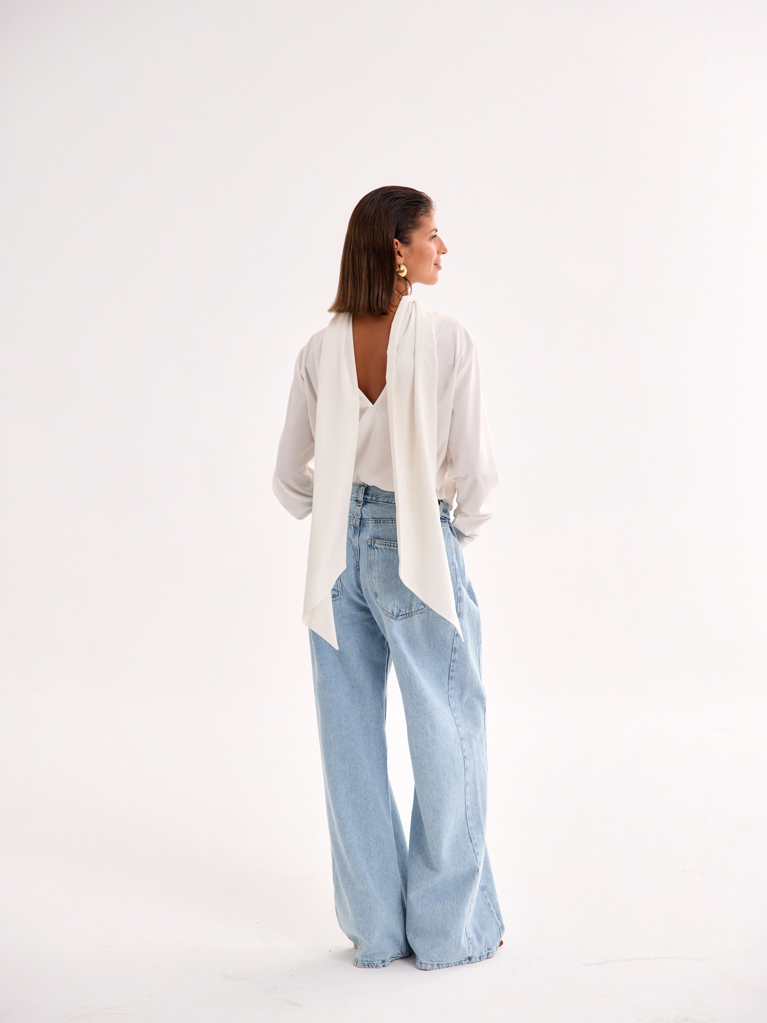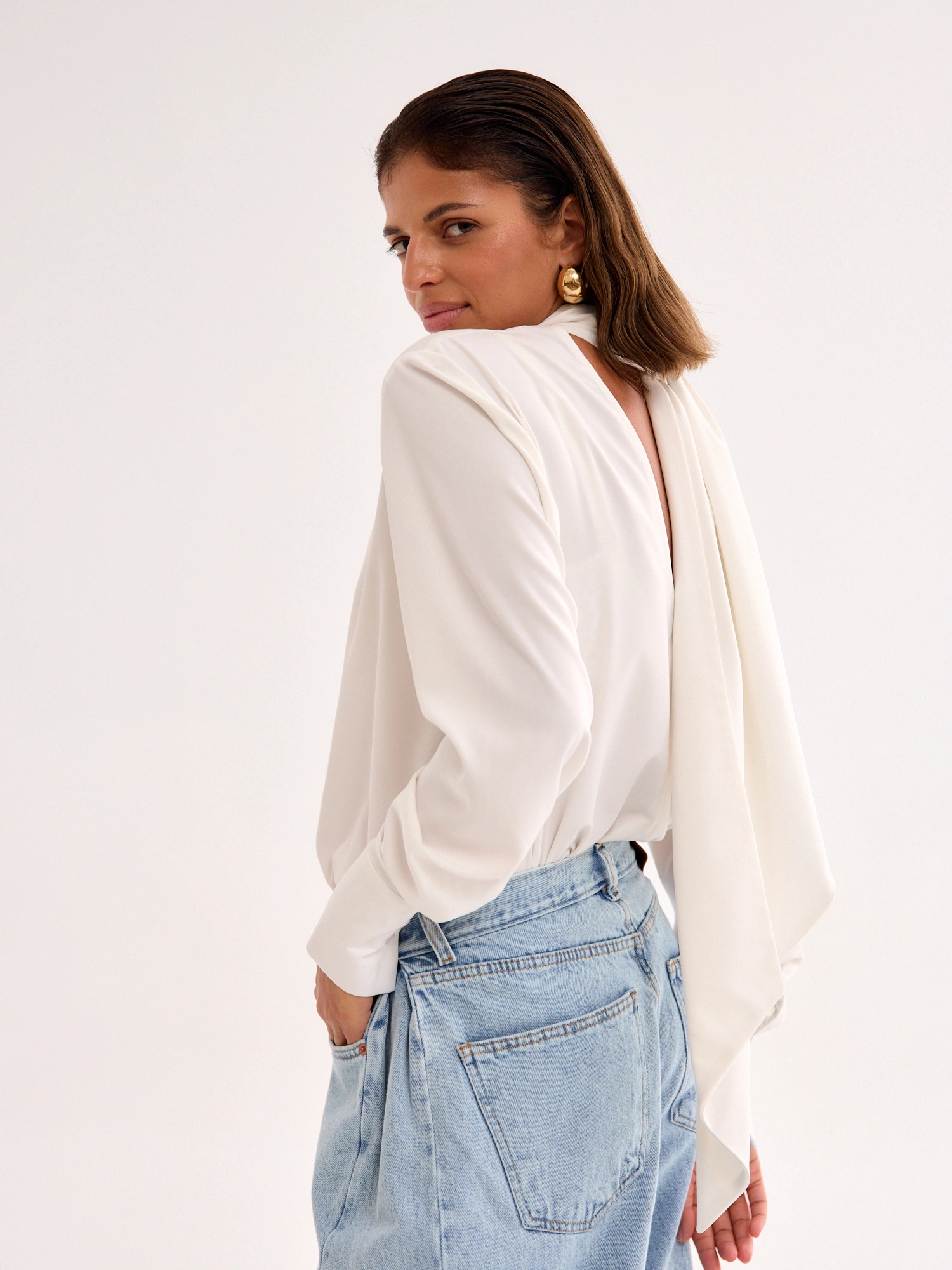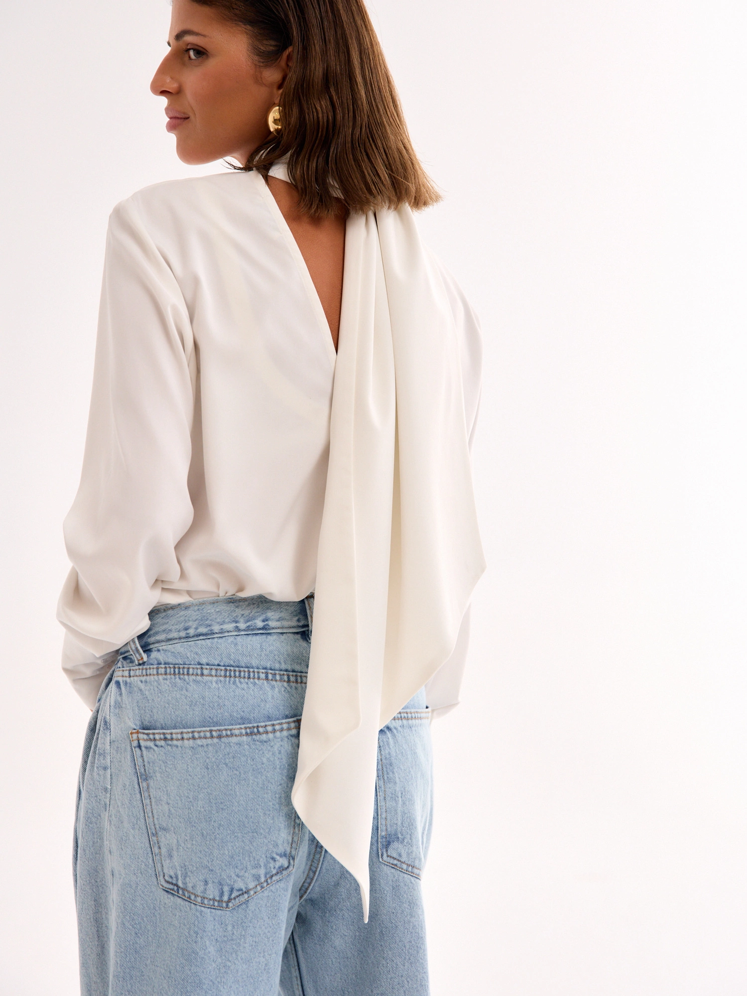 An airy, feminine, and elegant blouse with a simple cut that gracefully drapes over the silhouette. The deep open back adds a touch of sensuality, making it truly unique. A statement scarf completes the look—you can tie it in different ways or let it flow freely for an effortlessly chic effect. Featuring long sleeves finished with wide cuffs, it’s crafted from a delicate, fluid fabric that gently embraces the body and moves beautifully. A perfect choice for both everyday wear and special occasions—pair it with jeans for a stylish casual look or with tailored pants or a skirt for an effortlessly sophisticated ensemble.