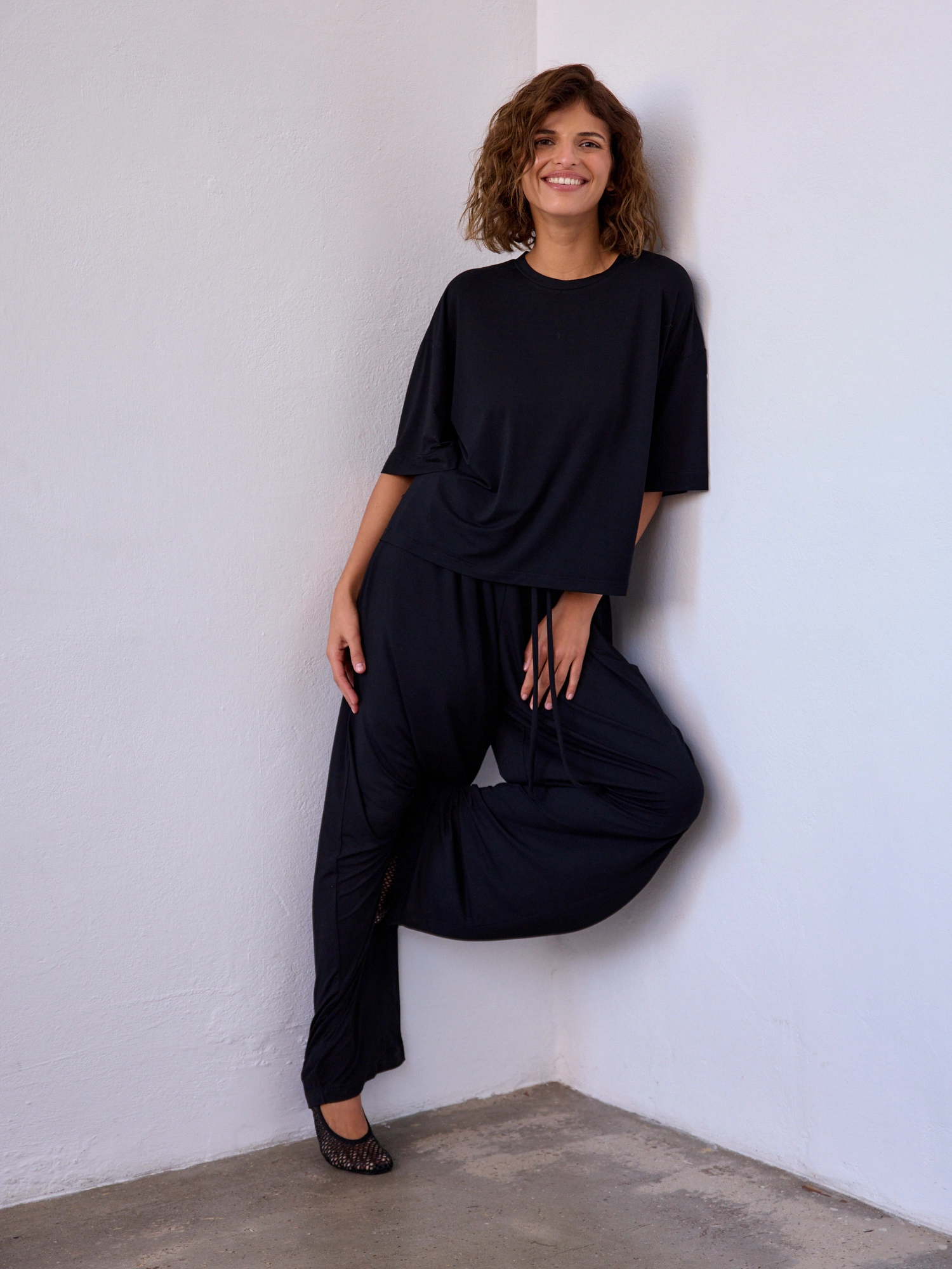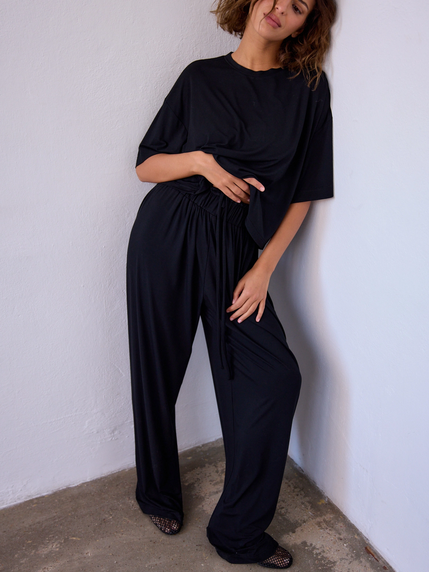 Wide-leg pants with a straight cut, made from soft, bamboo-infused fabric that feels smooth and gentle against the skin. The material drapes like a second skin — substantial yet delicate — and combined with the loose fit, it offers exceptional wearing comfort. The wide, elastic waistband with an adjustable drawstring adds to the relaxed feel.