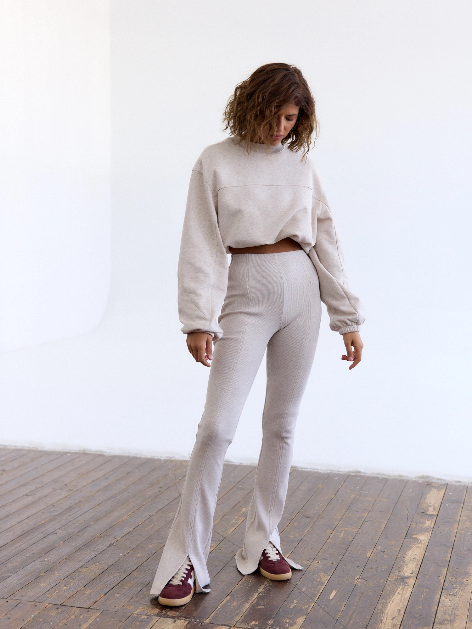 Flared leggings with a distinctive front slit. They feature a high waist with decorative stitching, and their ribbed texture makes them incredibly comfortable and perfectly form-fitting. A versatile piece that works just as well in a sporty look - paired with the CHILL sweatshirt - as it does in a more elegant style with a top, blazer, and heels. Comfortable, timeless, and effortlessly adaptable.