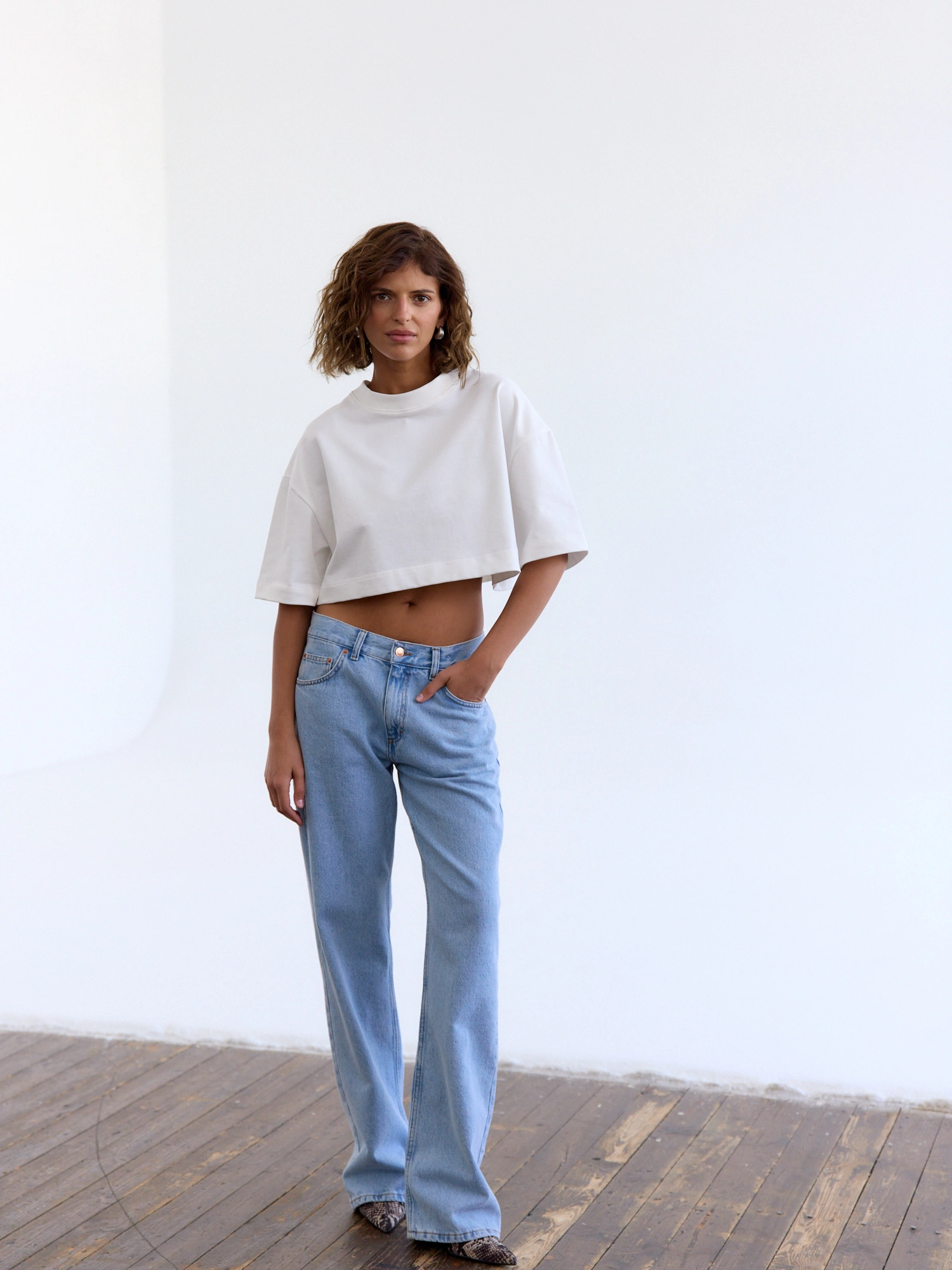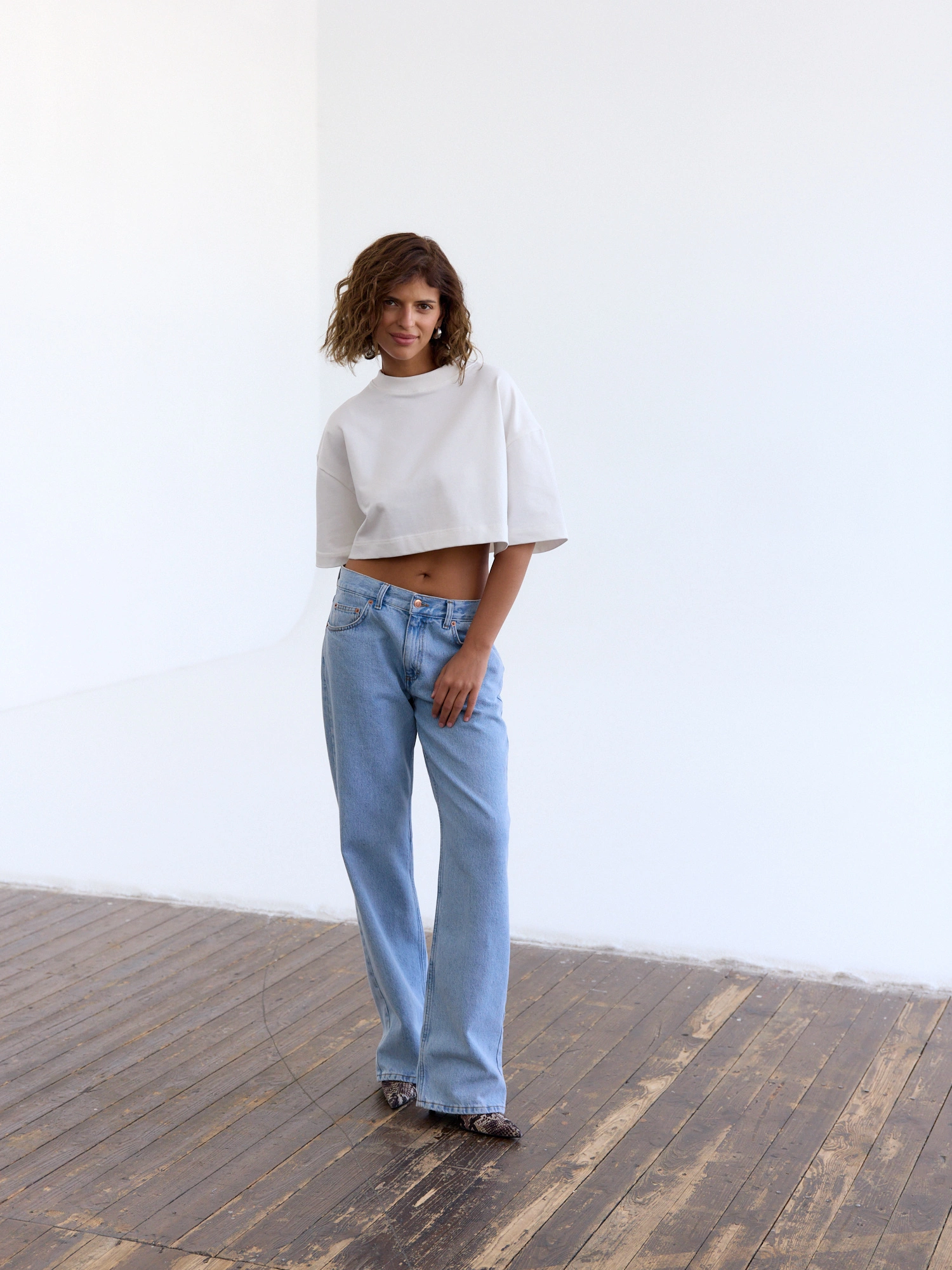 A crop top made from thick, premium cotton with a soft, structured feel. The fabric drapes beautifully, and combined with the cropped cut and distinctively elongated sleeves, it creates a modern and unique look. Perfect to pair with high-waisted jeans, shorts, or joggers. It strikes the perfect balance between comfort and bold style — a versatile piece you'll find yourself reaching for again and again.