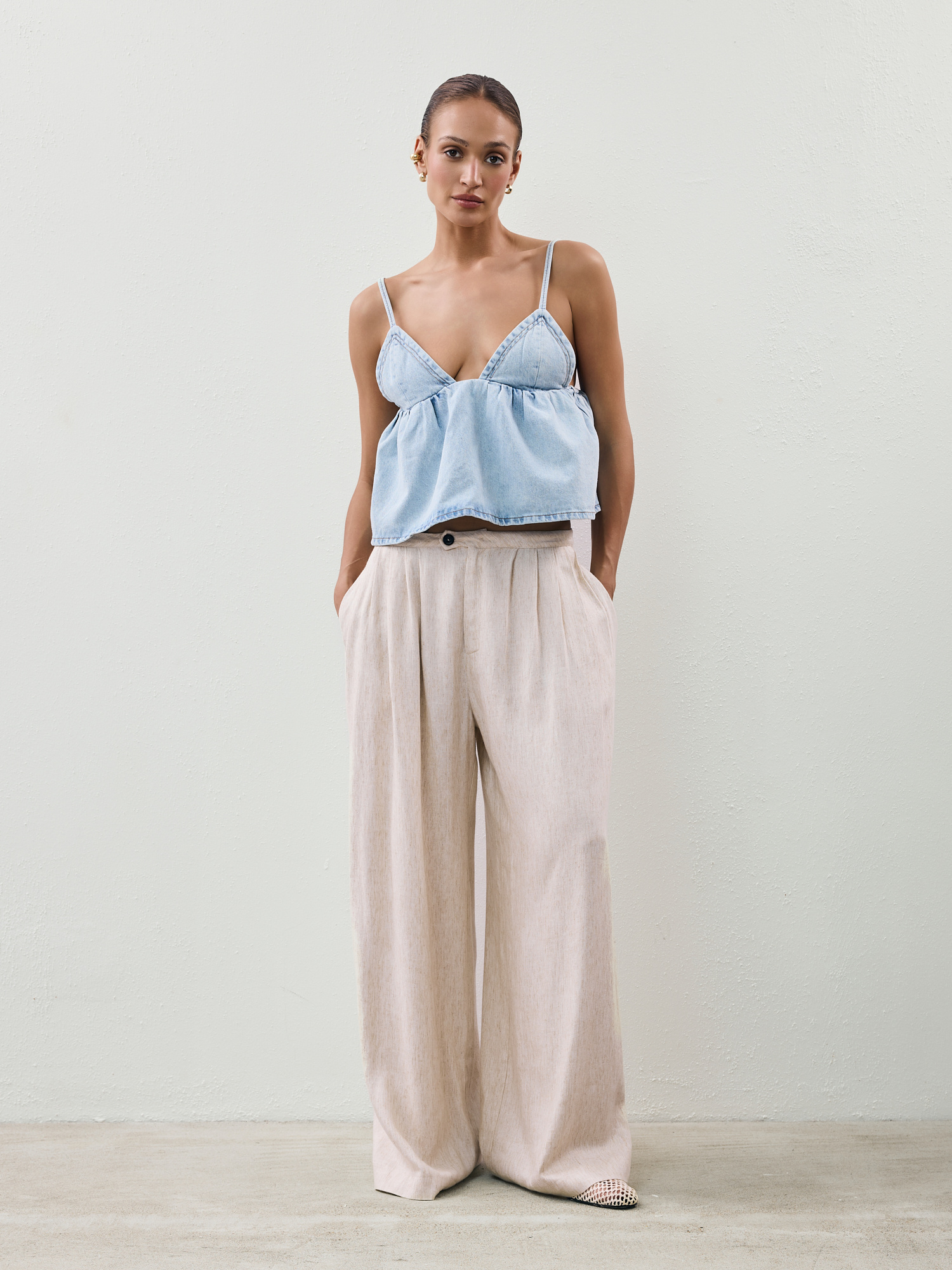 Lightweight trousers crafted from a soft, breathable blend of viscose and linen. Designed with wide legs and a relaxed, low-rise fit, they combine comfort with a laid-back, modern silhouette. Front pleats add a touch of structure, perfectly complementing the fluid fabric that moves beautifully with the body.