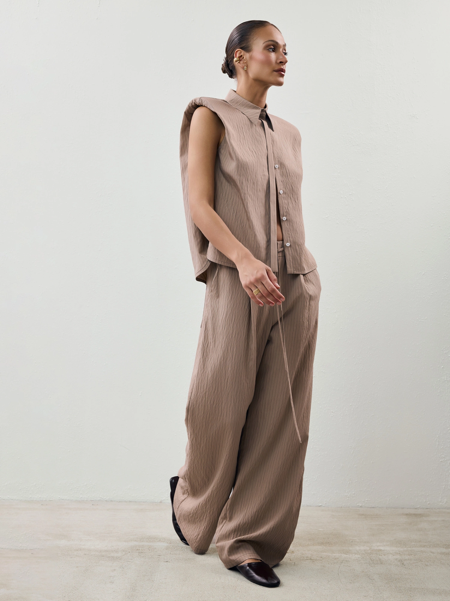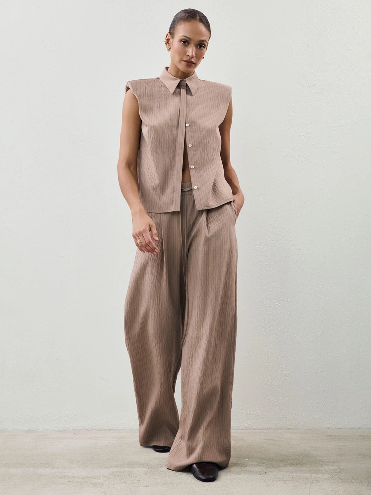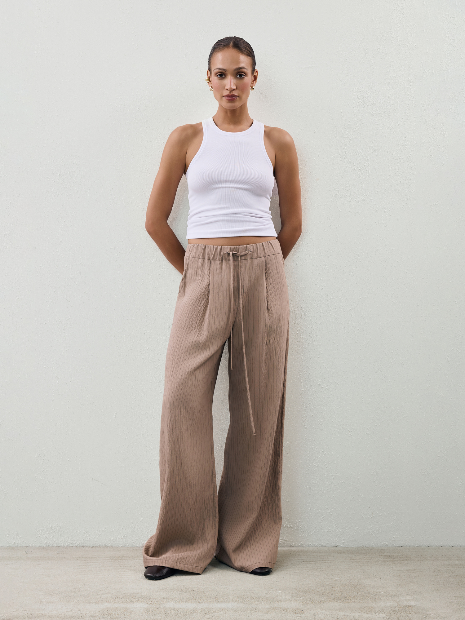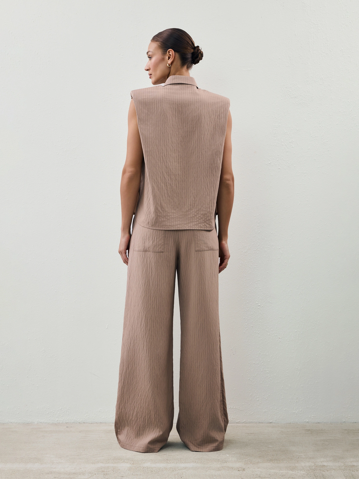 Trousers made from a soft fabric with a subtly crinkled, fine-striped texture. They feature wide, straight legs and a wide, comfortable elastic waistband with an adjustable drawstring. Two pleats at the front add a tailored touch.