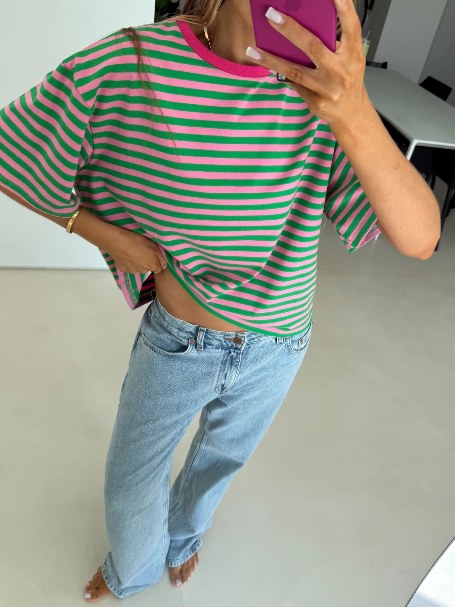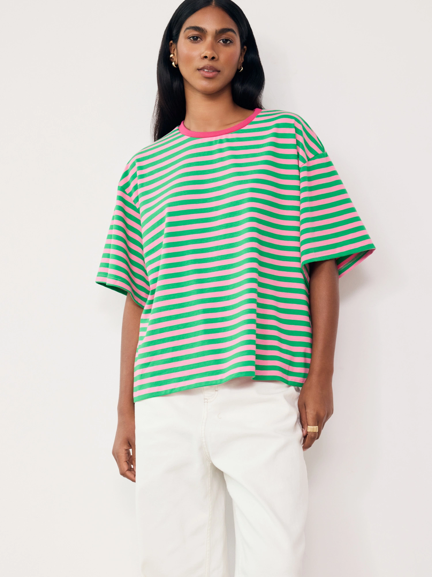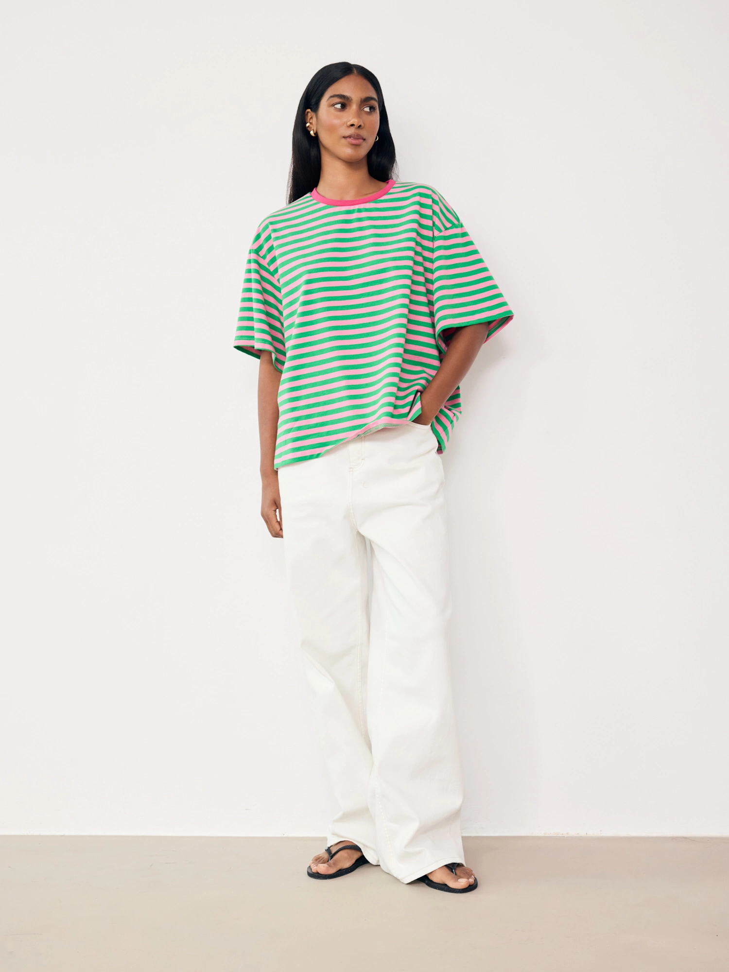 An oversized T-shirt made from soft, gentle, and incredibly skin-friendly cotton. With its relaxed fit, clean lines, and perfectly extended sleeves, it’s a versatile piece that pairs just as well with jeans as it does with tailored trousers for a more elevated look. Add jewelry and accessories to elevate your outfit—and enjoy comfort in a minimalist style.