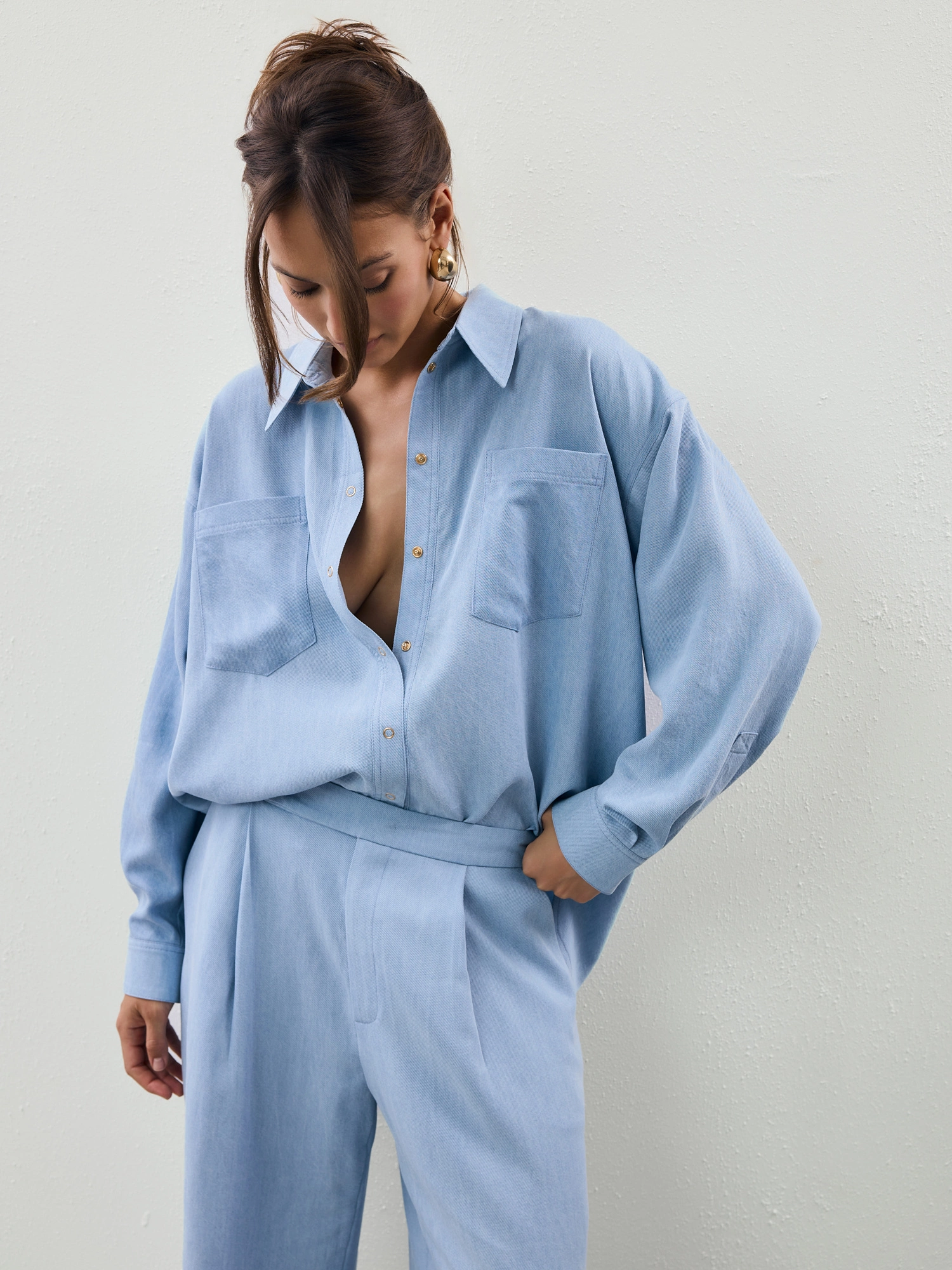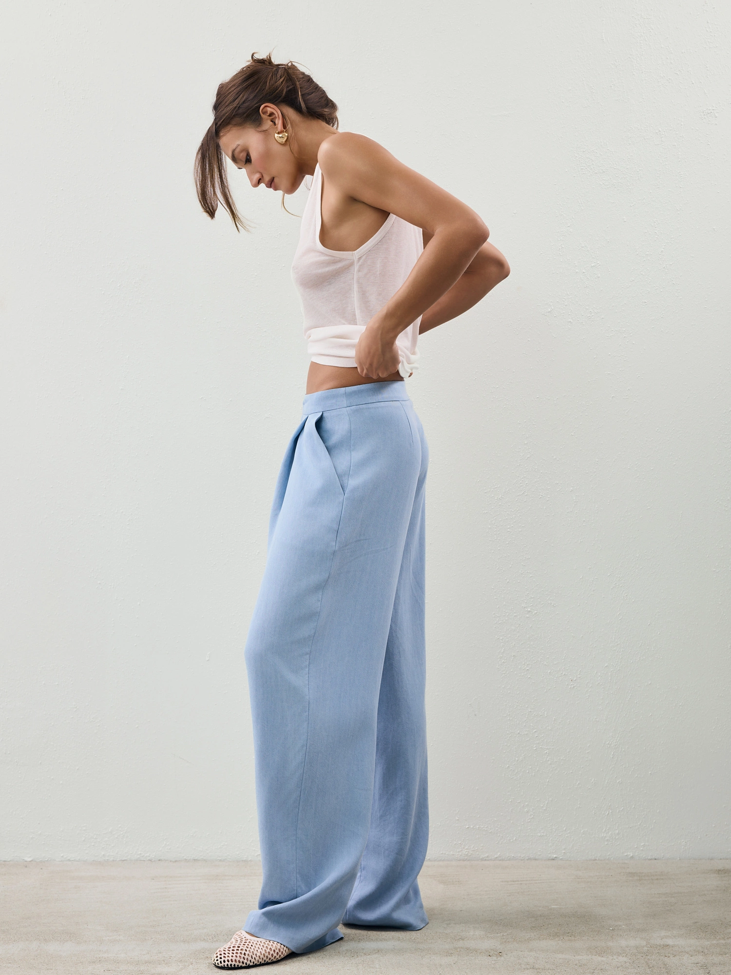 Tailored in a menswear-inspired style, these pants are made from an ultra-soft, skin-friendly blend of viscose and linen. The fabric visually resembles denim, featuring a signature light blue hue and a subtle diagonal texture. It’s fluid, lightweight, and breathable—allowing for beautiful drape and effortless movement. Designed with straight, loose legs, a classic mid-rise waist, and two front pleats, they offer both structure and ease. Handy side pockets add practicality to the refined silhouette.