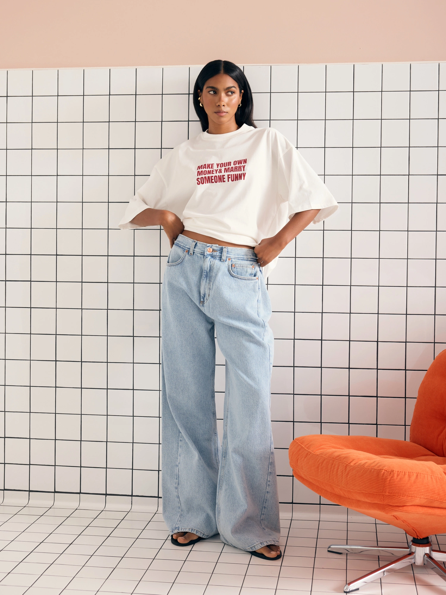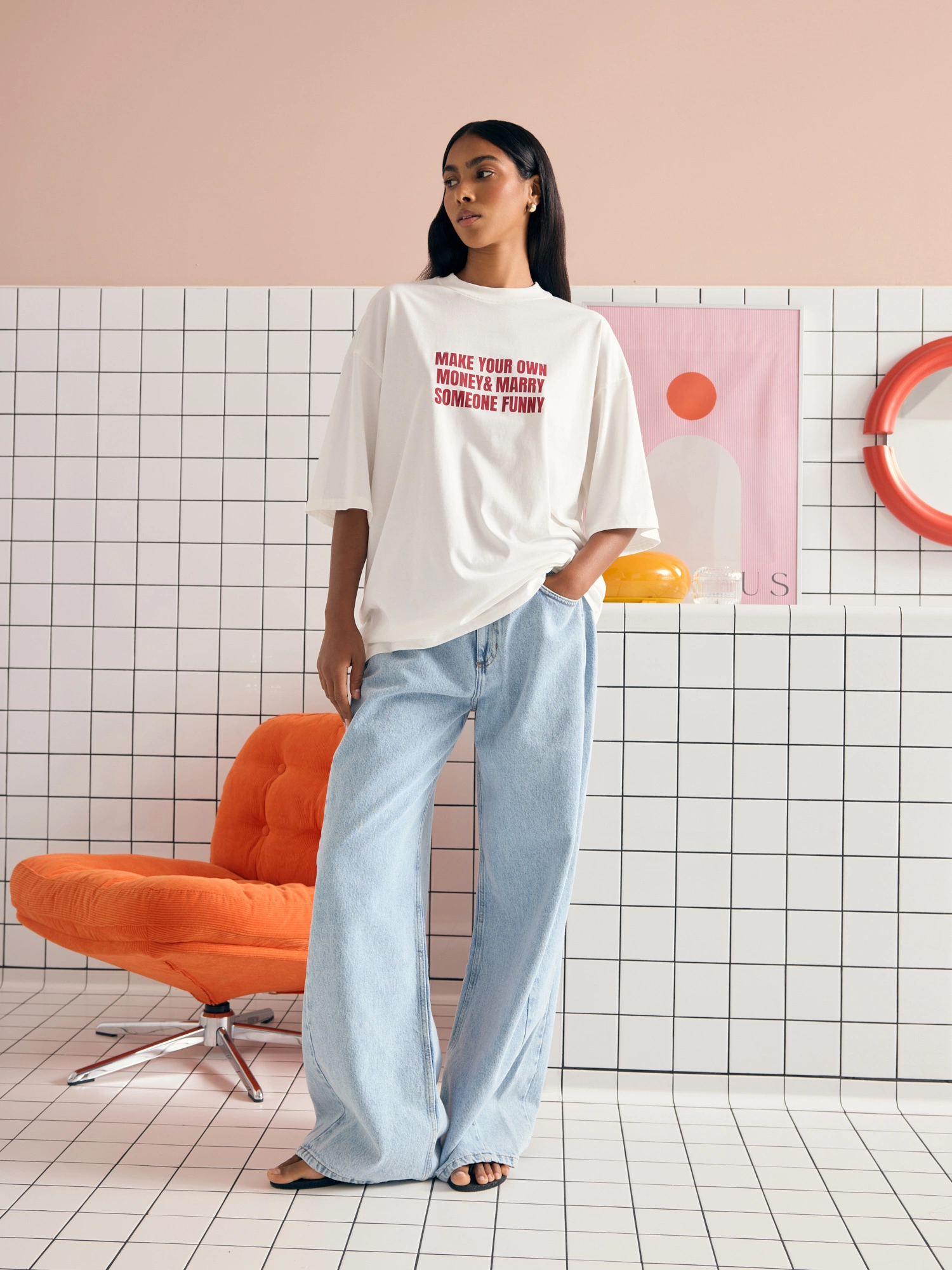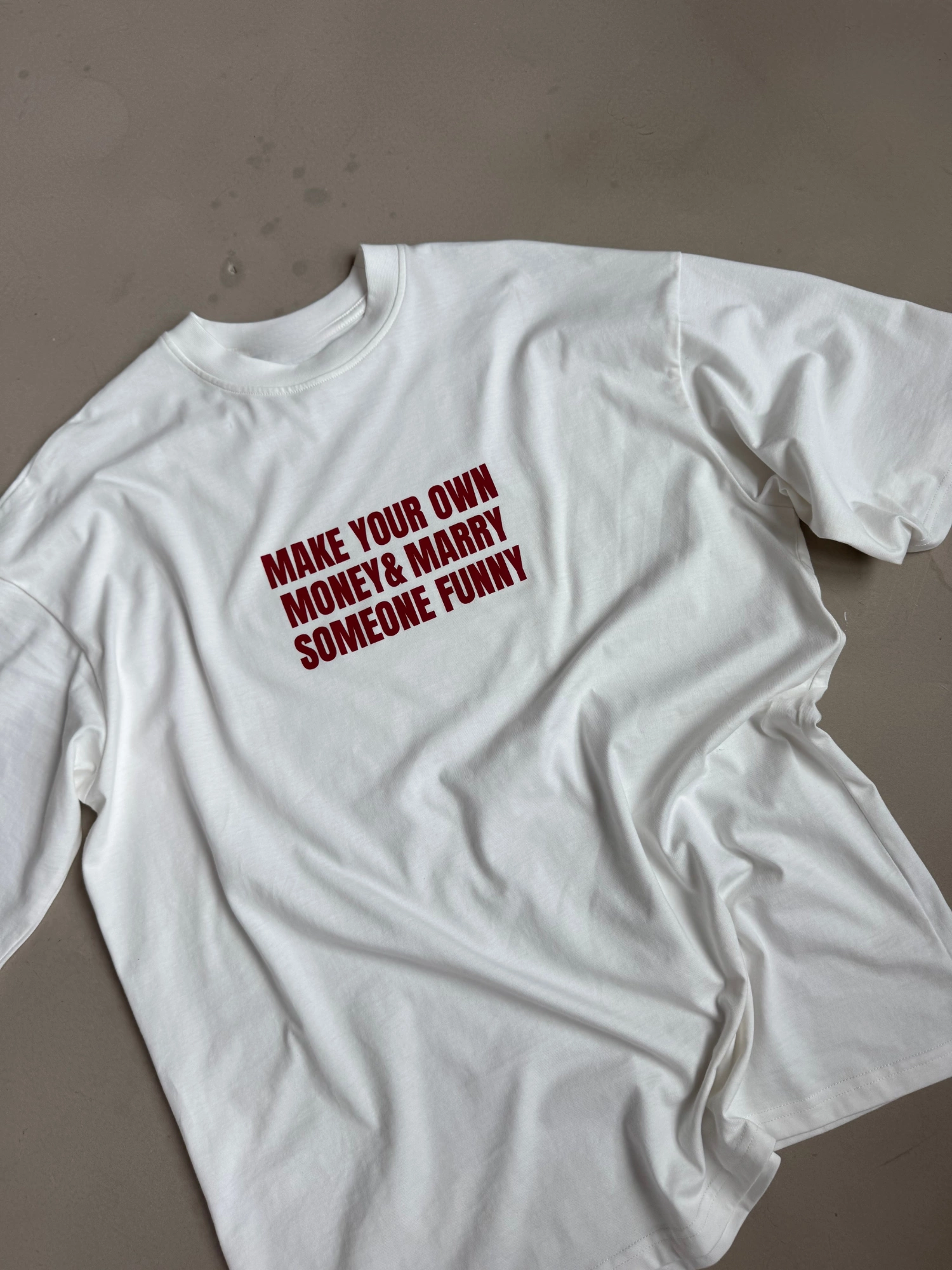 An oversized tee made from 100% soft, high-quality cotton. The relaxed fit and bold “Make your own money & marry someone funny” print give it a laid-back, streetwear vibe. Comfortable, stylish, and a little cheeky – wear it your way: with jeans, leggings, or as a fun twist to a more polished look with a skirt or tailored trousers.