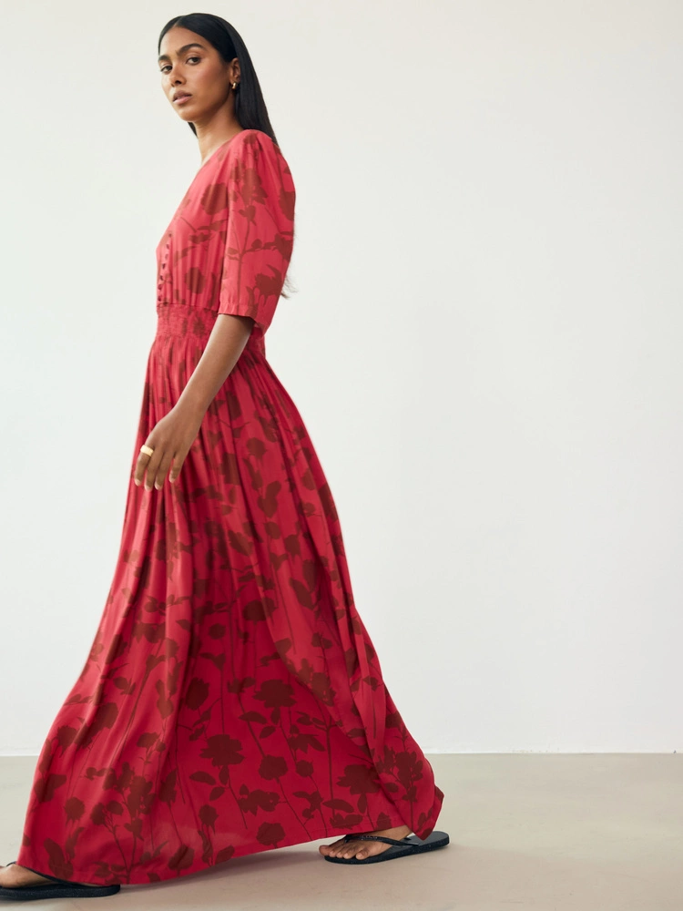 An everyday maxi dress made from 100% lightweight, breathable viscose. It features a deep V-neckline, softly puffed elbow-length sleeves, and a smocked waist that beautifully defines the silhouette. The flared skirt drapes effortlessly, creating a sense of movement and lightness with every step.