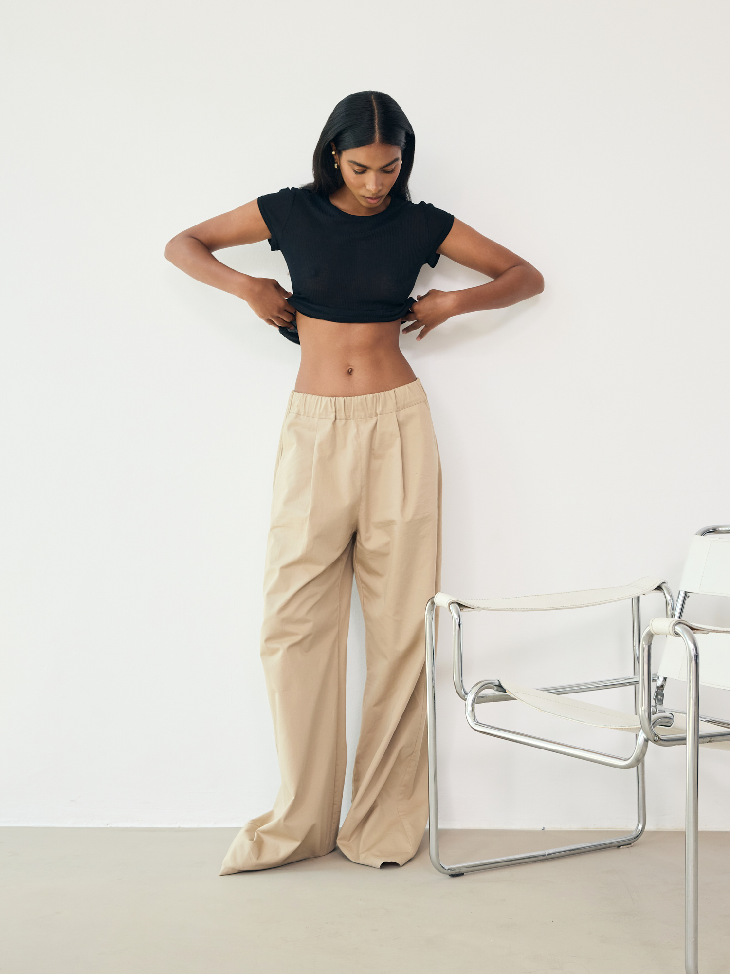 A classic T-shirt made from soft, breathable, ribbed viscose. The delicate fabric gently drapes over the body, delivering exceptional comfort and a subtly sensual look. A minimalist piece, perfect worn with statement lingerie or casually layered over a bikini. Simple and raw in design, yet distinctive in every styling.