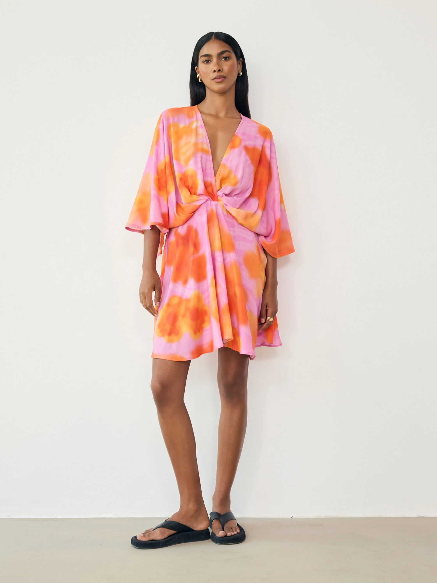 A mini dress made from soft viscose, featuring a vibrant neon print. Designed in a flowy kimono-inspired silhouette, it has loose, slightly draped sleeves, a V-neckline that flatters the neck, an elasticated waist that defines the figure, and a feminine flared hem. A perfect everyday piece that, with the right accessories, can easily transition to more elegant occasions.