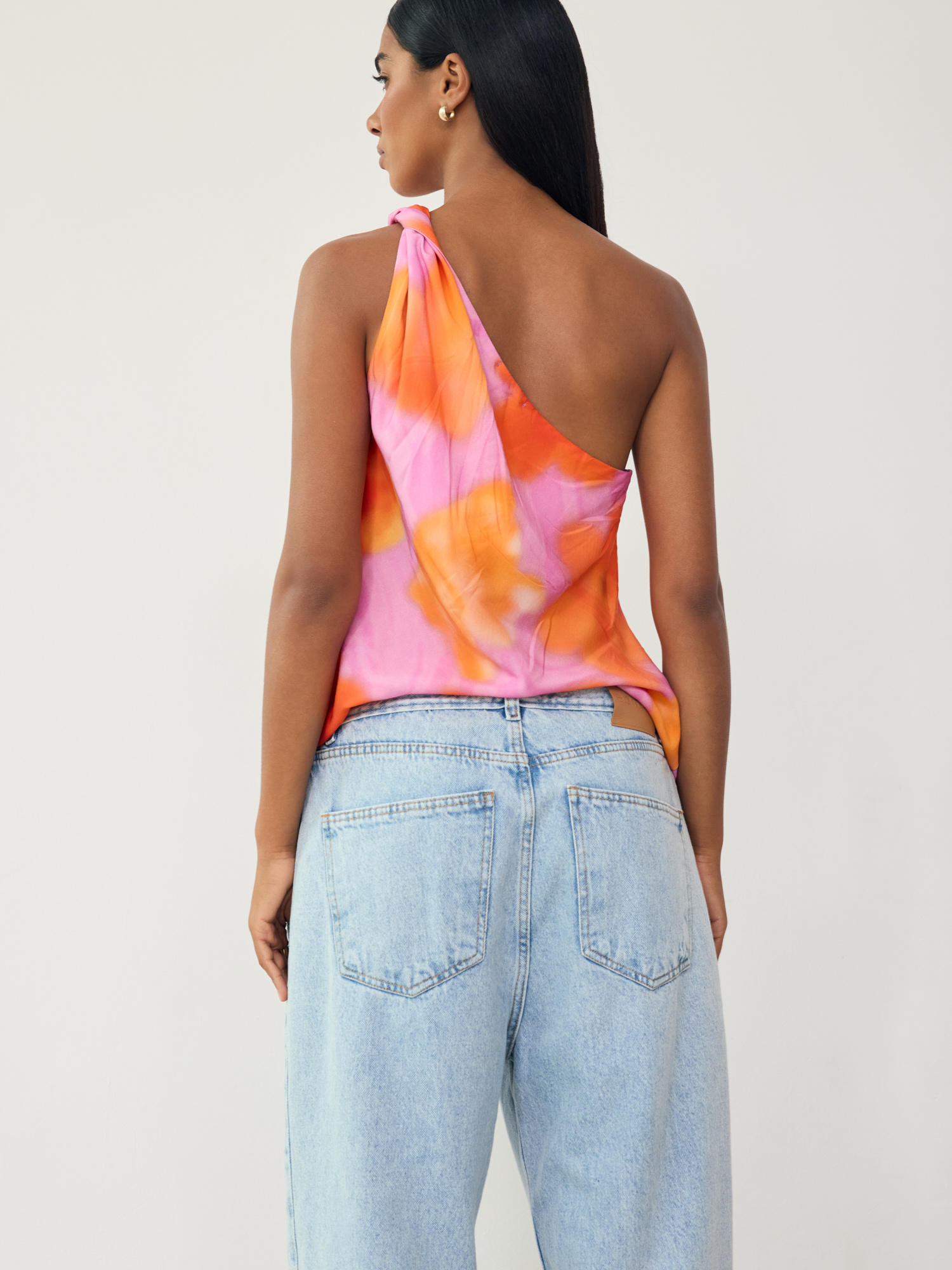 A unique top crafted from soft, fluid viscose in a bold neon print. It features a relaxed, slightly flared silhouette and an asymmetrical twisted strap that sensually reveals the shoulder and highlights the neckline. A versatile piece, perfect for both everyday wear and more elevated occasions. Pair it with jeans, shorts, or tailored trousers - a standout addition to your wardrobe that works for any moment.