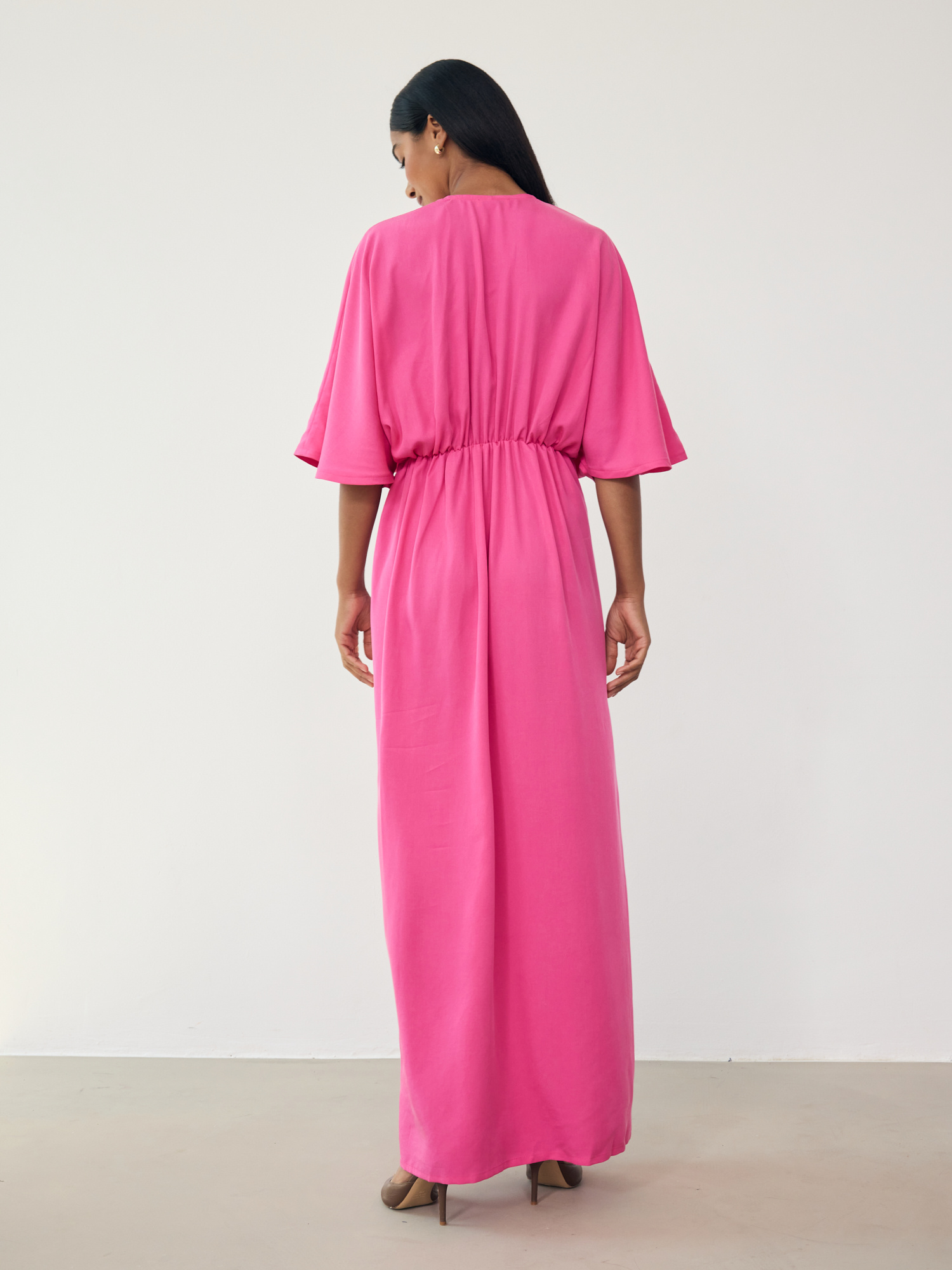 A maxi dress made from soft, flowing Tencel. Designed in a breezy kimono-inspired silhouette, it features loose, slightly draped sleeves, a flattering V-neckline, an elasticated waist with a striking knot detail, and a wrap-style skirt that subtly shows off the legs.