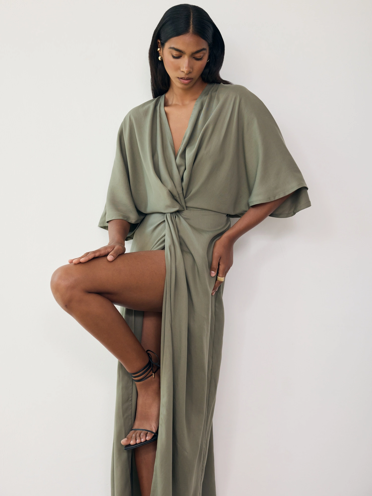A maxi dress made from soft, flowing Tencel. Designed in a breezy kimono-inspired silhouette, it features loose, slightly draped sleeves, a flattering V-neckline, an elasticated waist with a striking knot detail, and a wrap-style skirt that subtly shows off the legs.