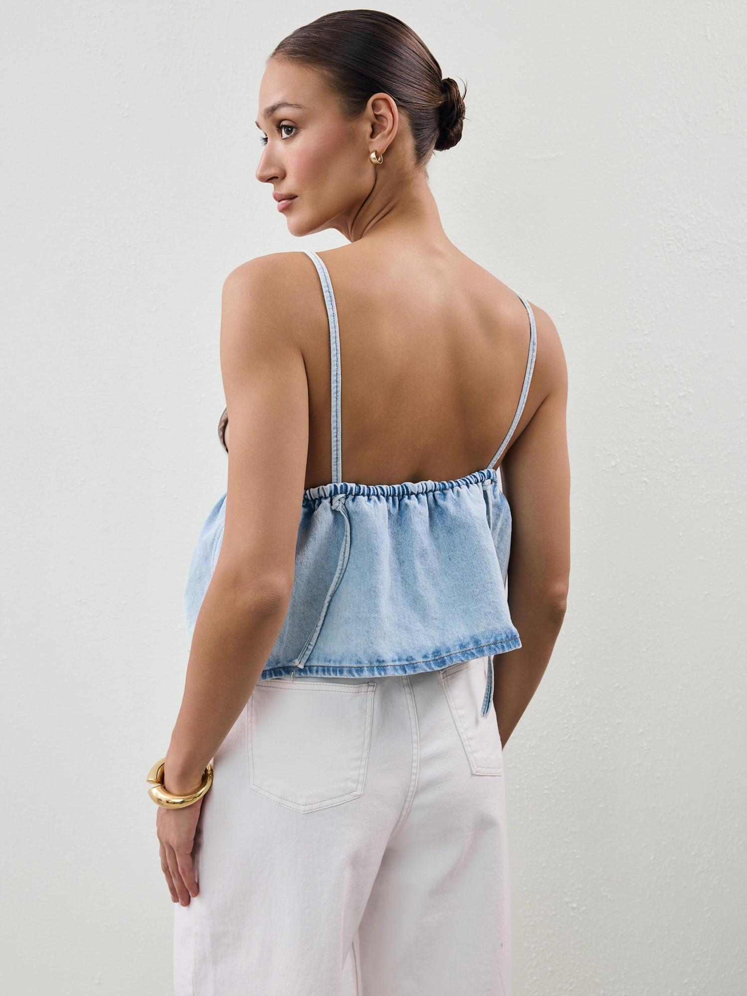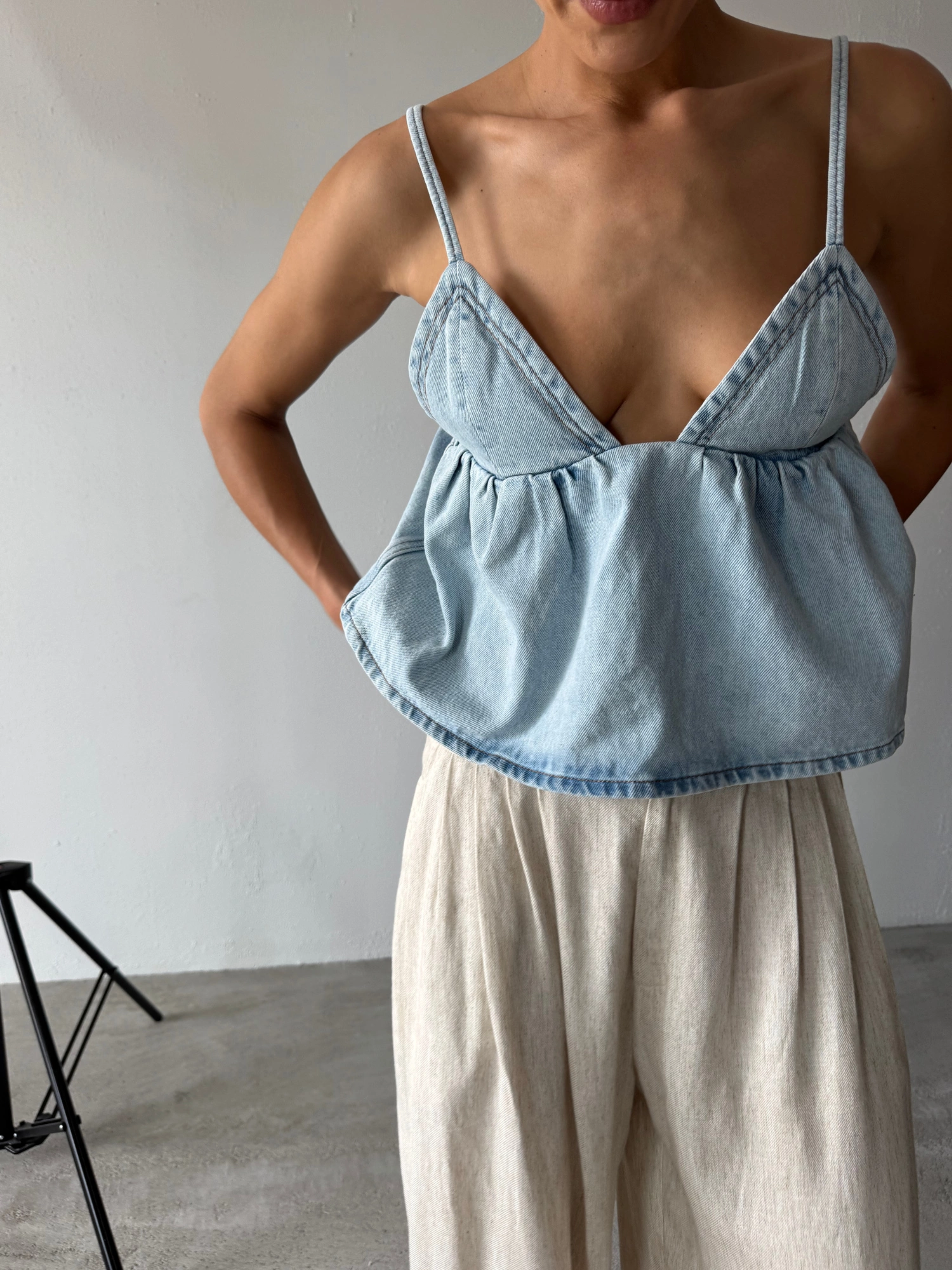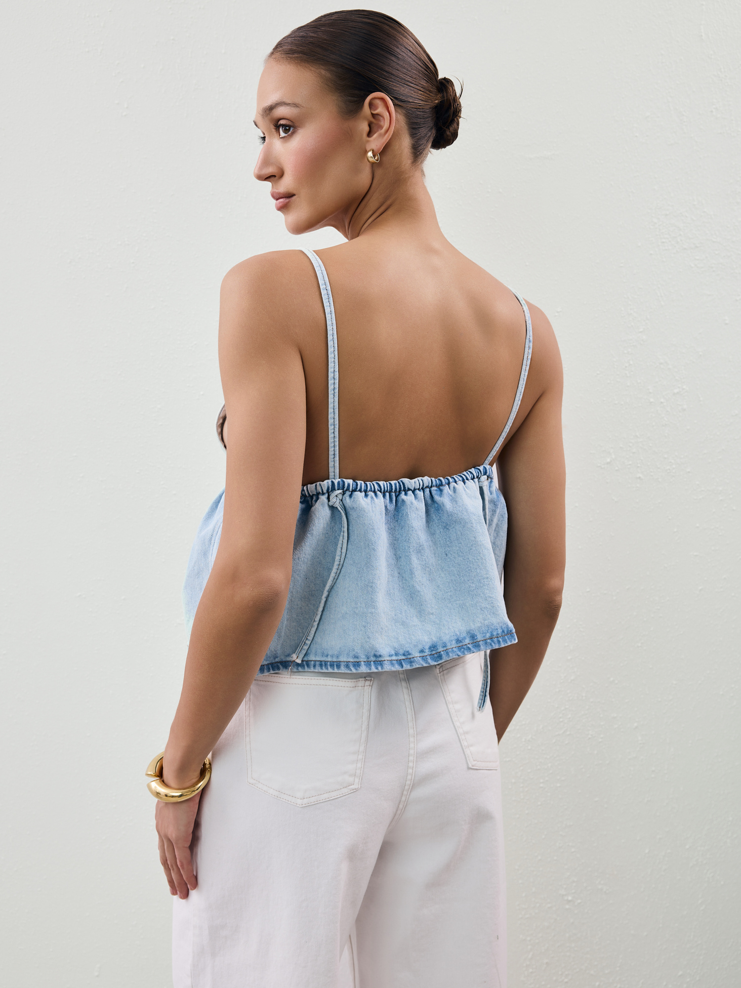 A soft denim top with a romantically feminine silhouette. It features a deep V-neckline, delicate tie-back straps, and a gently flared hem that subtly highlights the bust. This is the kind of piece that makes a statement all on its own – just pair it with your favorite jeans, denim shorts, a maxi skirt, or wide-leg trousers for a look that works just as well for everyday wear as it does for more elevated occasions.
