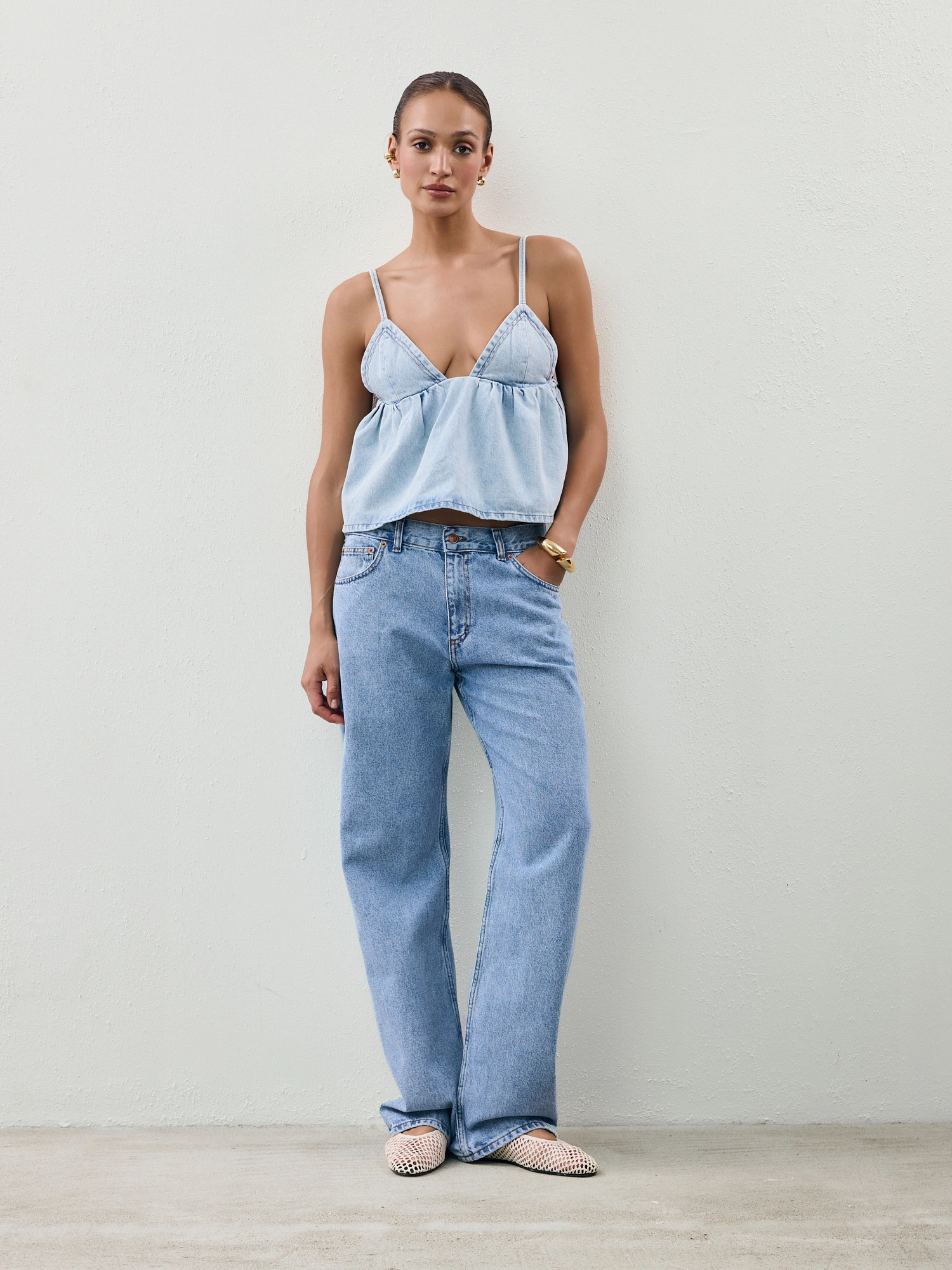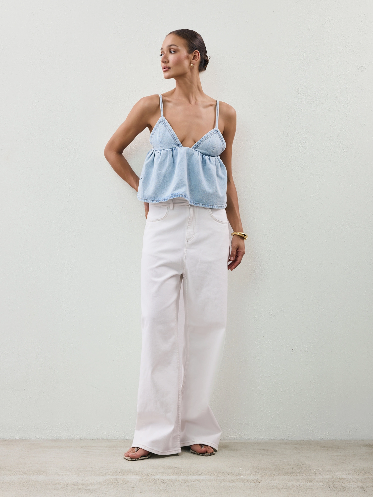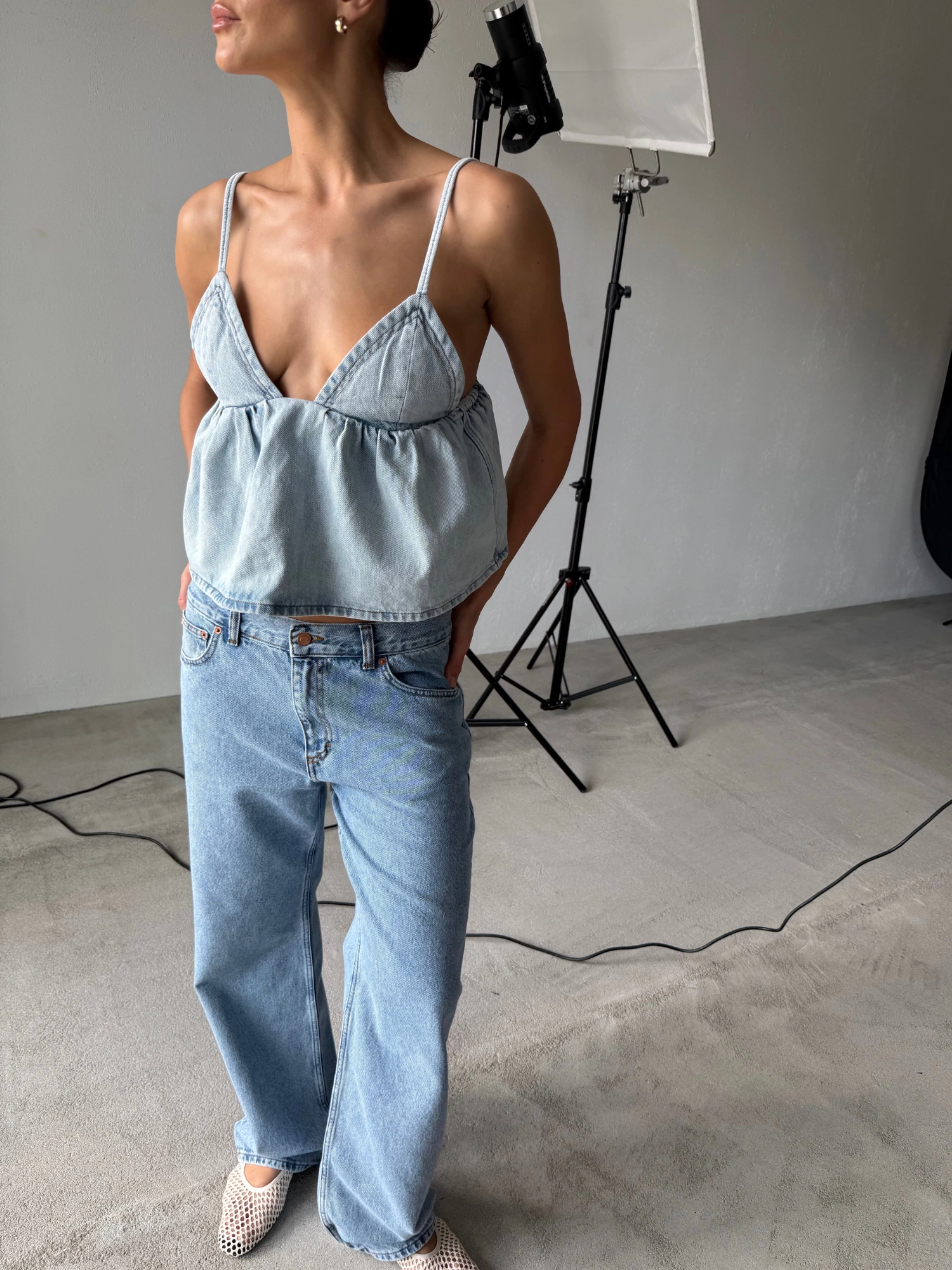 A soft denim top with a romantically feminine silhouette. It features a deep V-neckline, delicate tie-back straps, and a gently flared hem that subtly highlights the bust. This is the kind of piece that makes a statement all on its own – just pair it with your favorite jeans, denim shorts, a maxi skirt, or wide-leg trousers for a look that works just as well for everyday wear as it does for more elevated occasions.