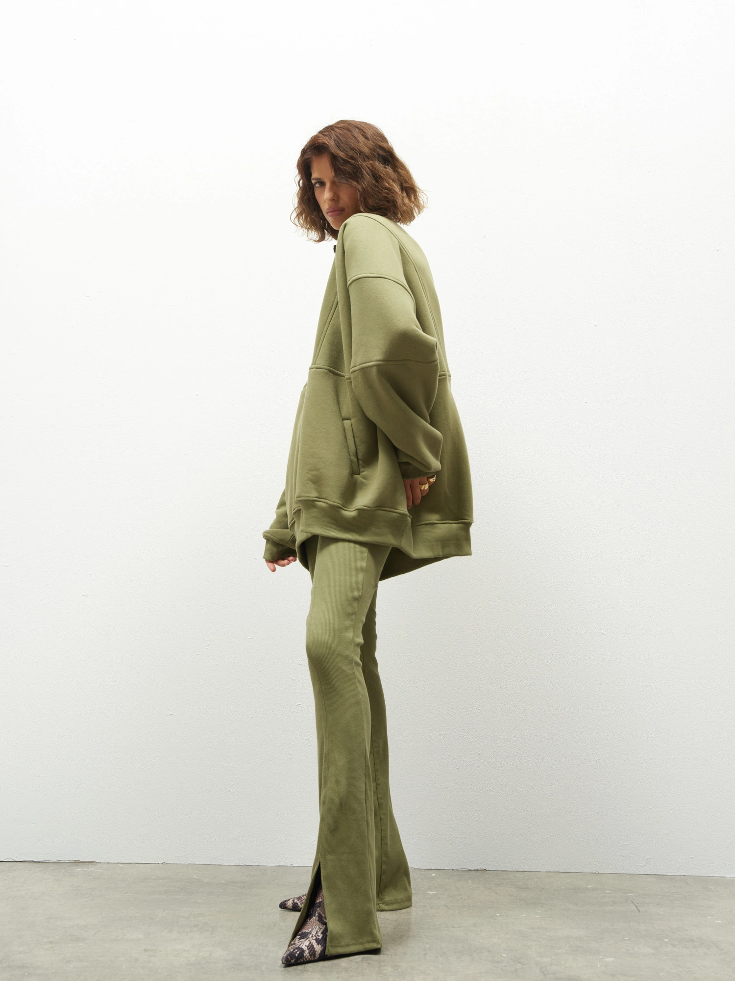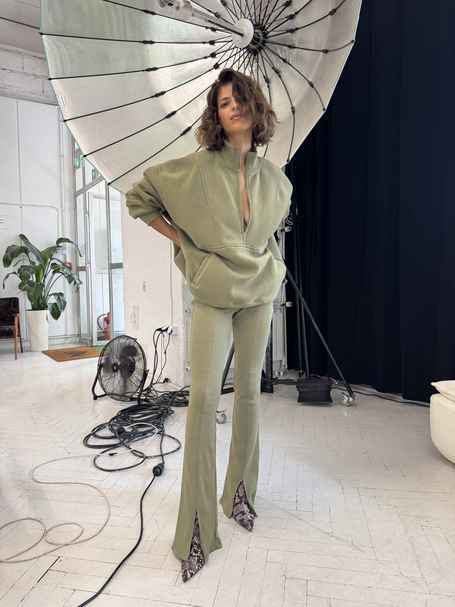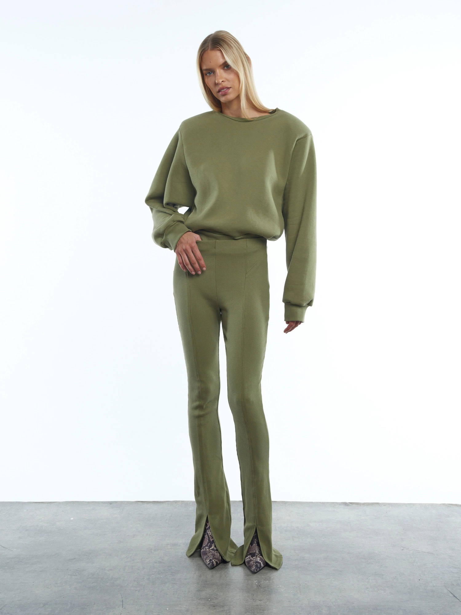 Flared leggings with a distinctive front slit. They feature a high waist with decorative stitching, and their ribbed texture makes them incredibly comfortable and perfectly form-fitting. A versatile piece that works just as well in a sporty look - paired with the CHILL sweatshirt - as it does in a more elegant style with a top, blazer, and heels. Comfortable, timeless, and effortlessly adaptable.