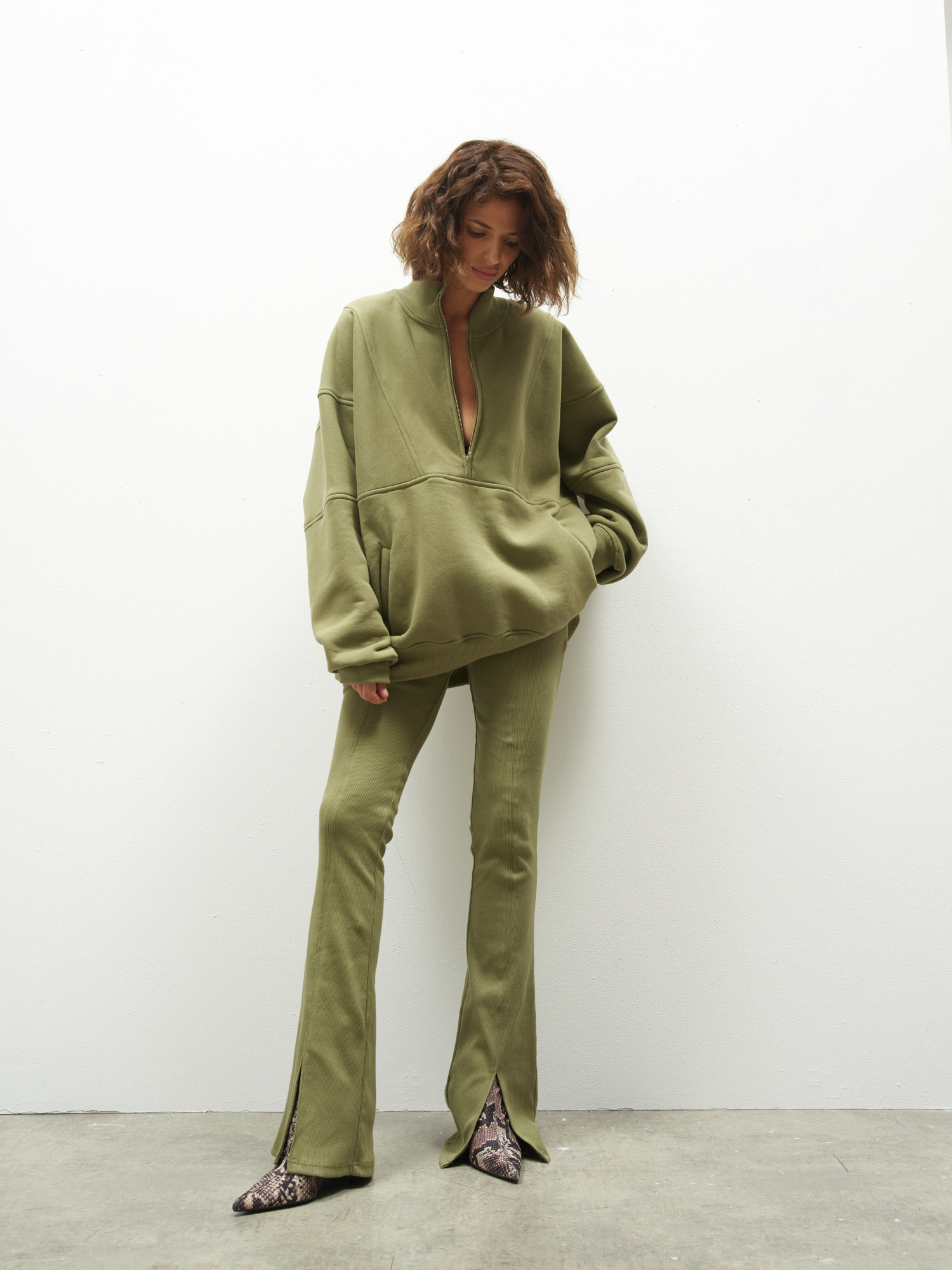 Oversized sweatshirt with a stylish stand-up collar and zipper. Made from soft cotton with warm teddy fleece on the inside. Its extra-long cut makes it perfect to wear with leggings or slim-fit trousers, and on chilly summer evenings, even with shorts. The distinctive design features decorative stitching and an adjustable neckline with a zipper so you can style it just the way you like. Trust us - you won’t want to swap it for any other!
